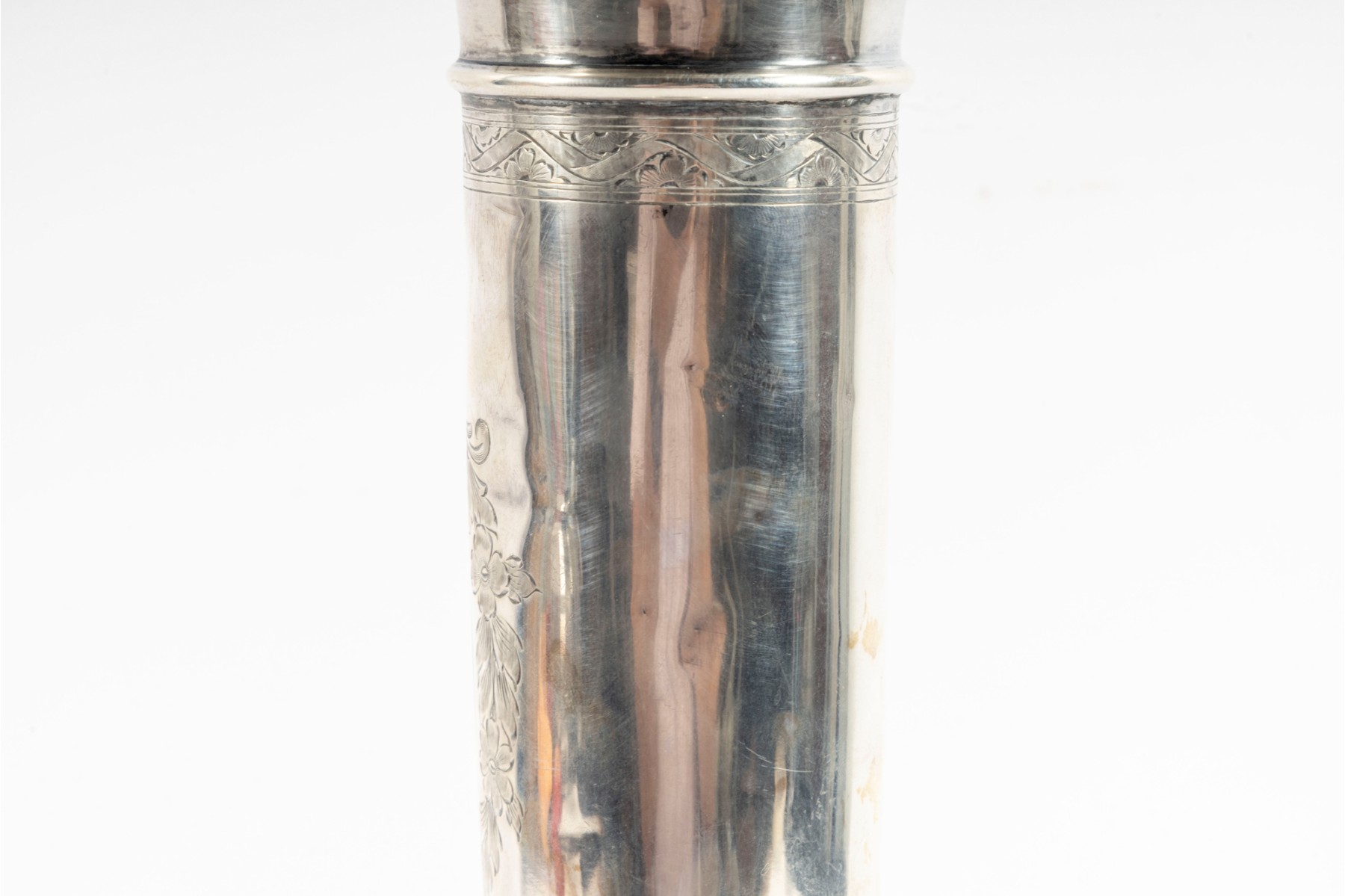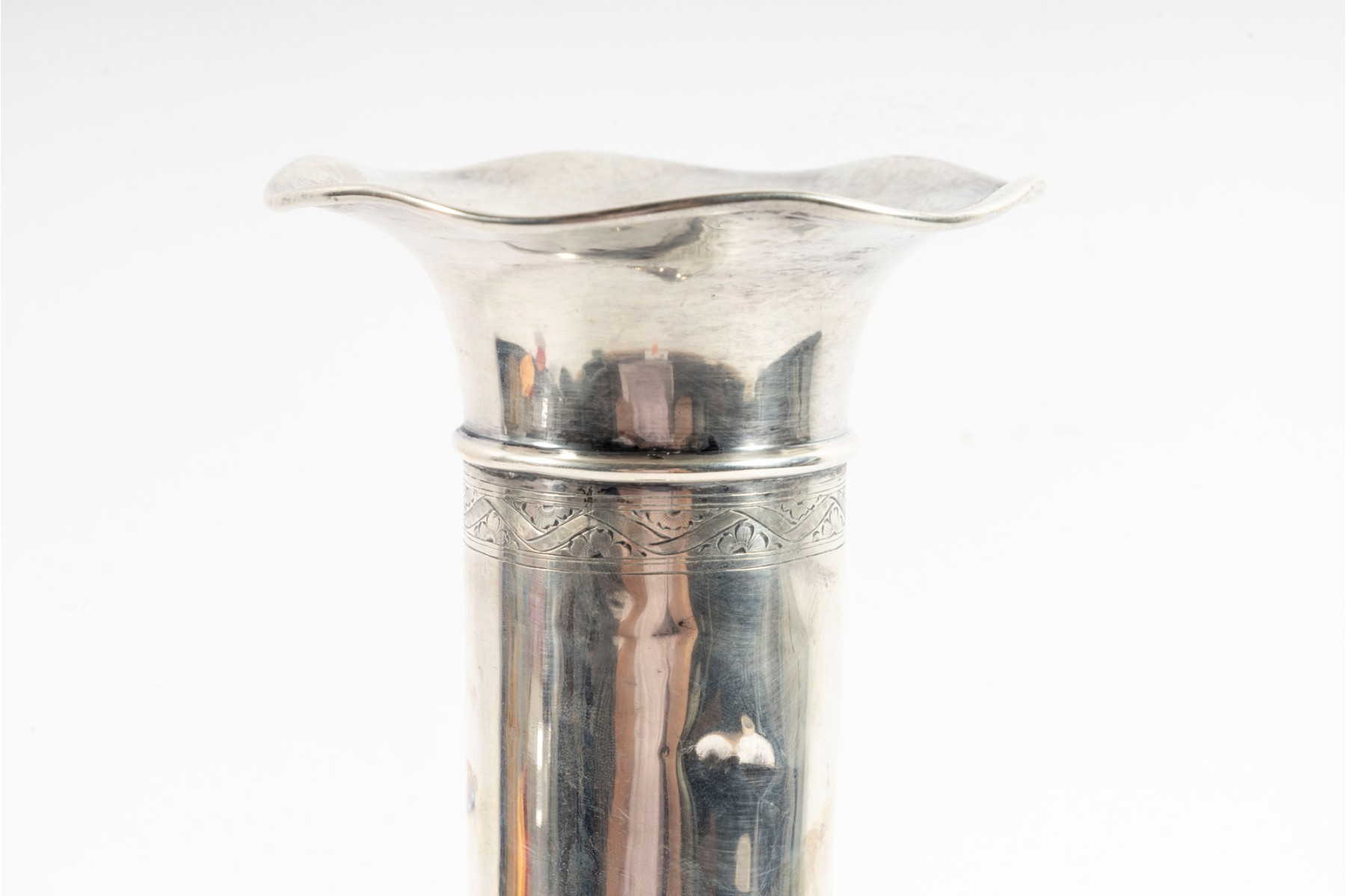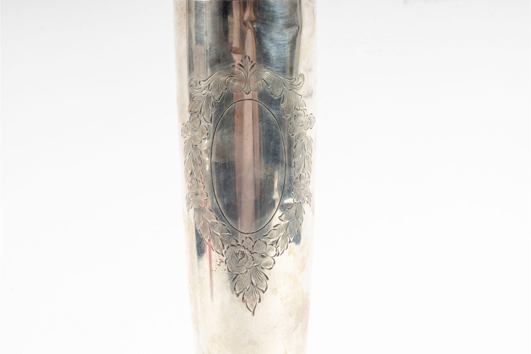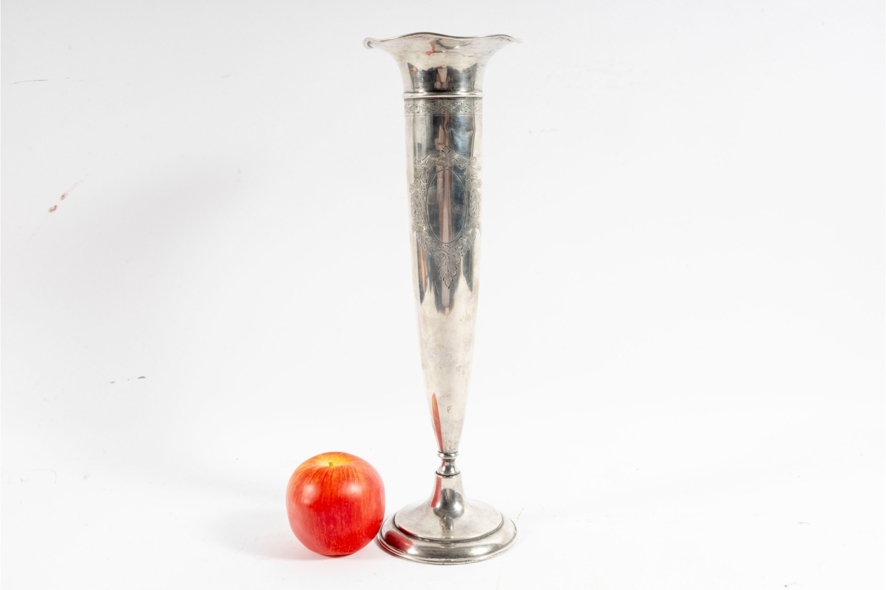 A 14.75" tall sterling silver bud vase produced by International Sterling, vintage. Features a cement-filled base and engaged floral motifs.