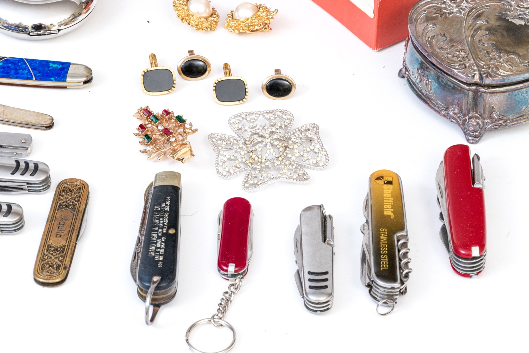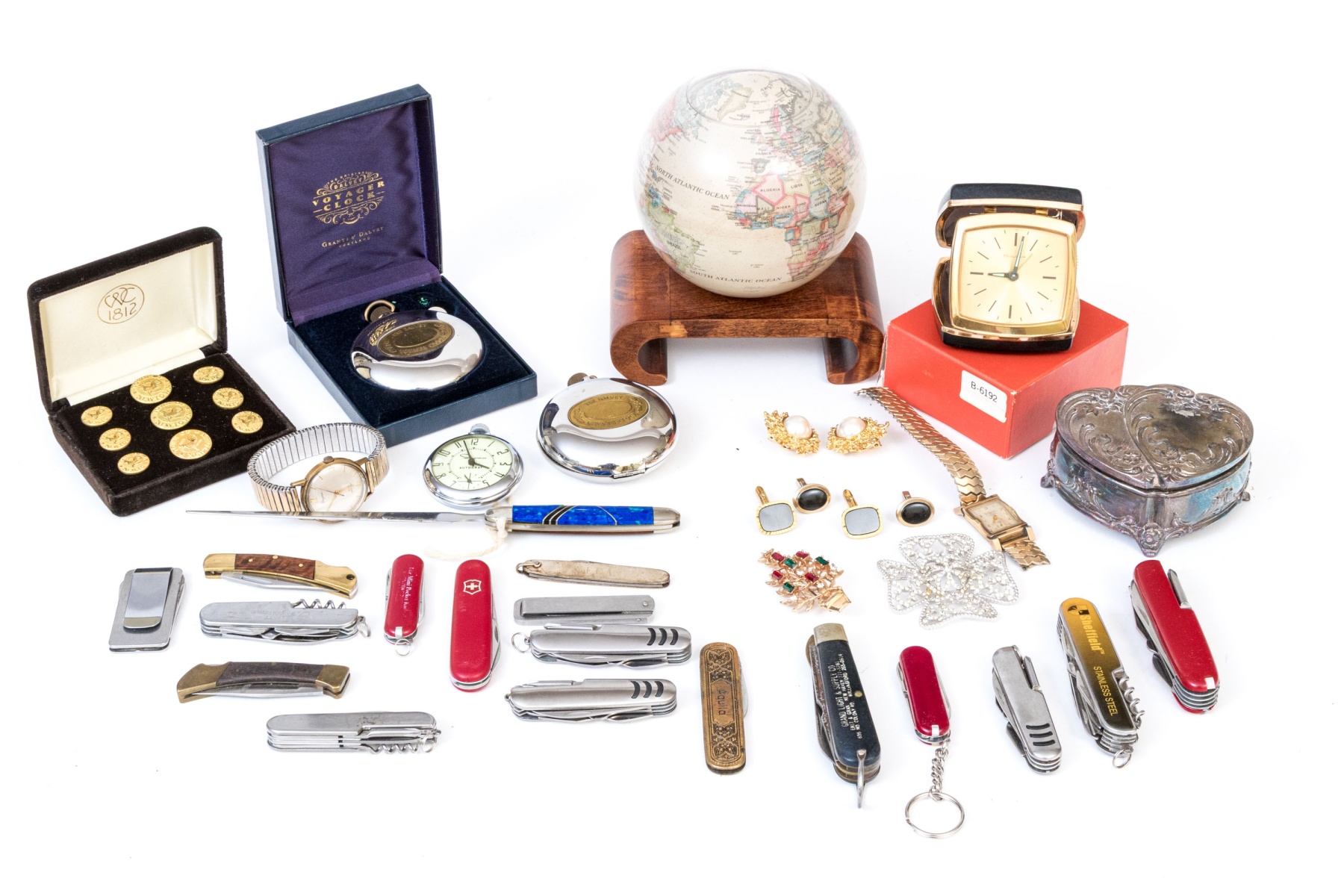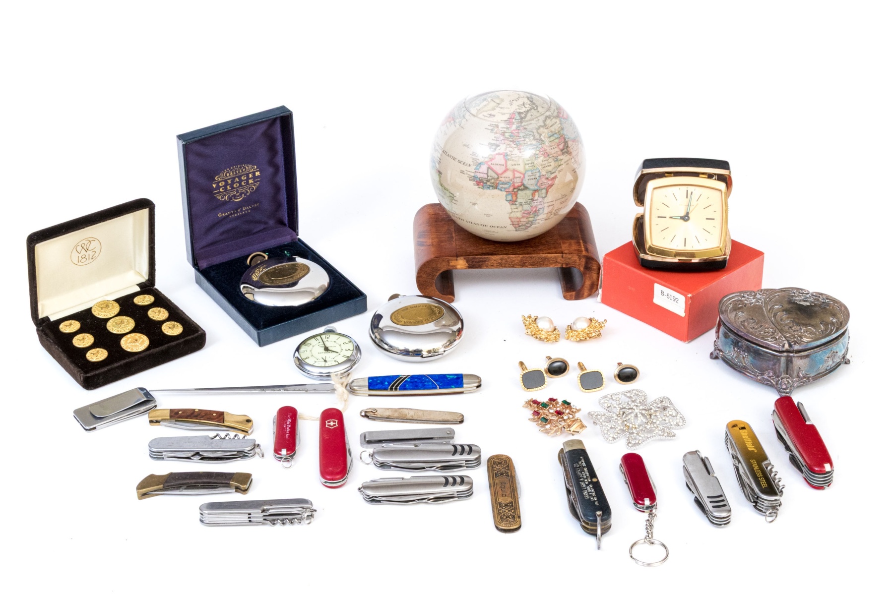 Comprised of: three pocket watches including bulova case watch, sixteen pocket knives including Swiss army amongst others, nine buttons including town of Newtown set, costume pearl earrings, two pairs of cufflinks, two pins, and a floating globe amongst other table top items.