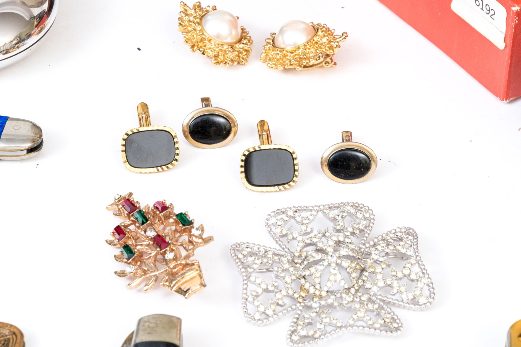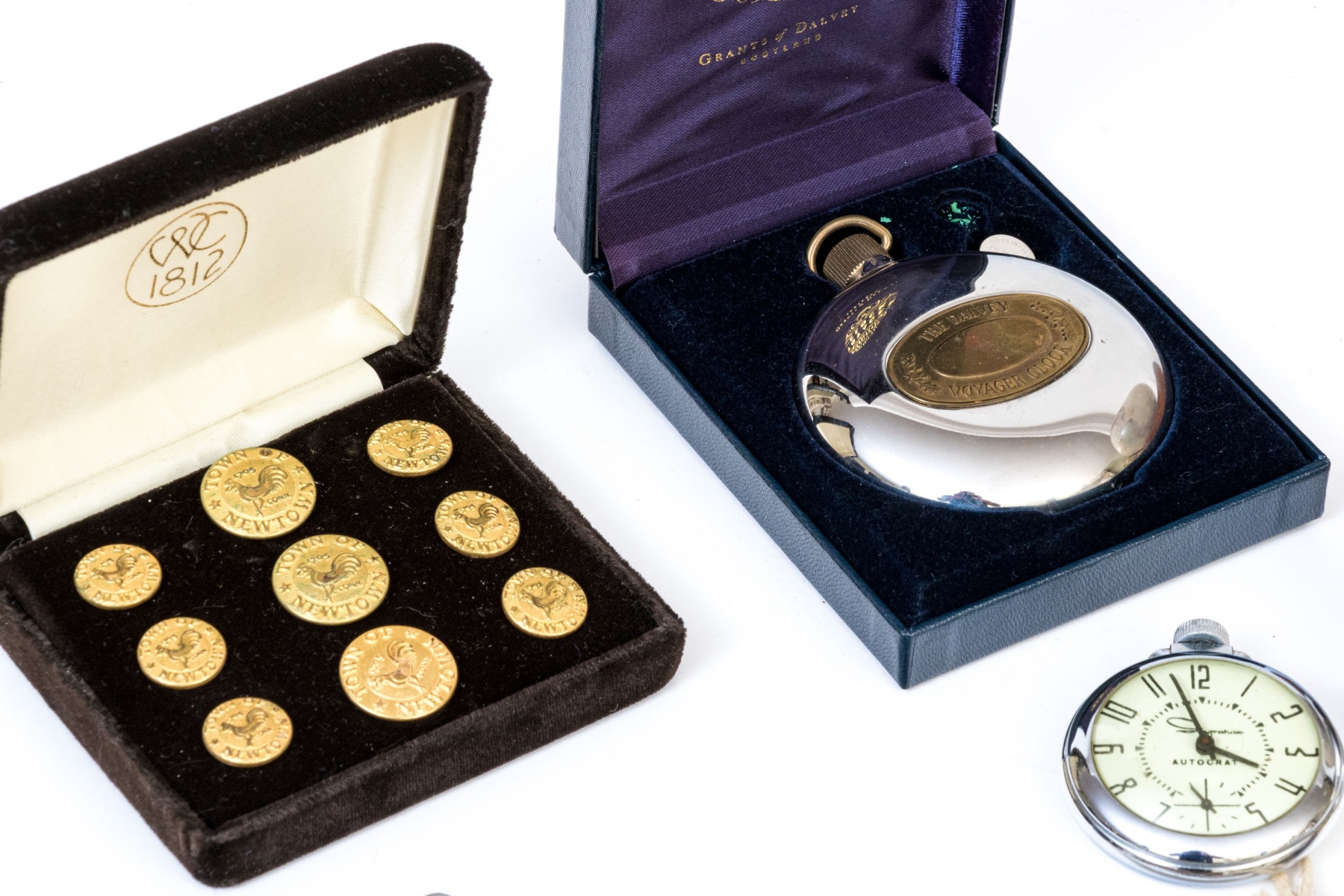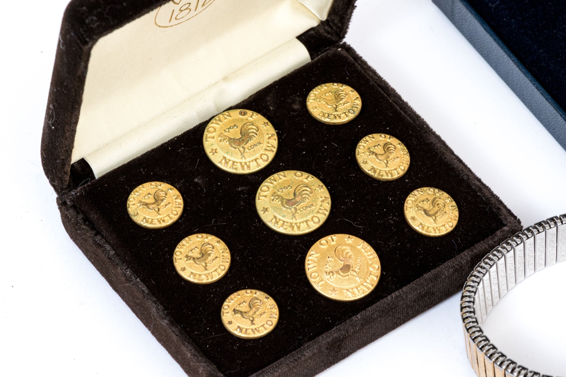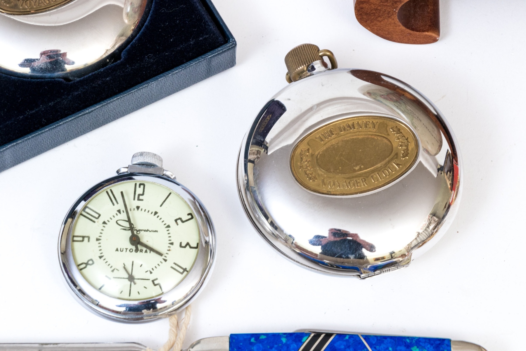 Comprised of: three pocket watches including bulova case watch, sixteen pocket knives including Swiss army amongst others, nine buttons including town of Newtown set, costume pearl earrings, two pairs of cufflinks, two pins, and a floating globe amongst other table top items.
