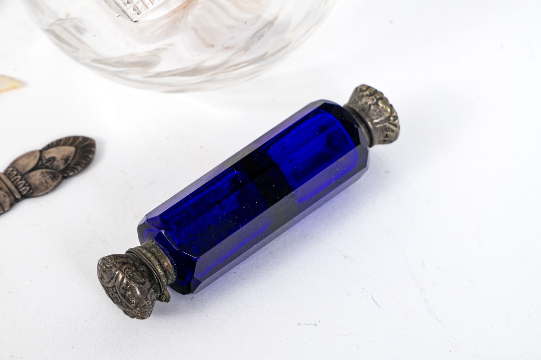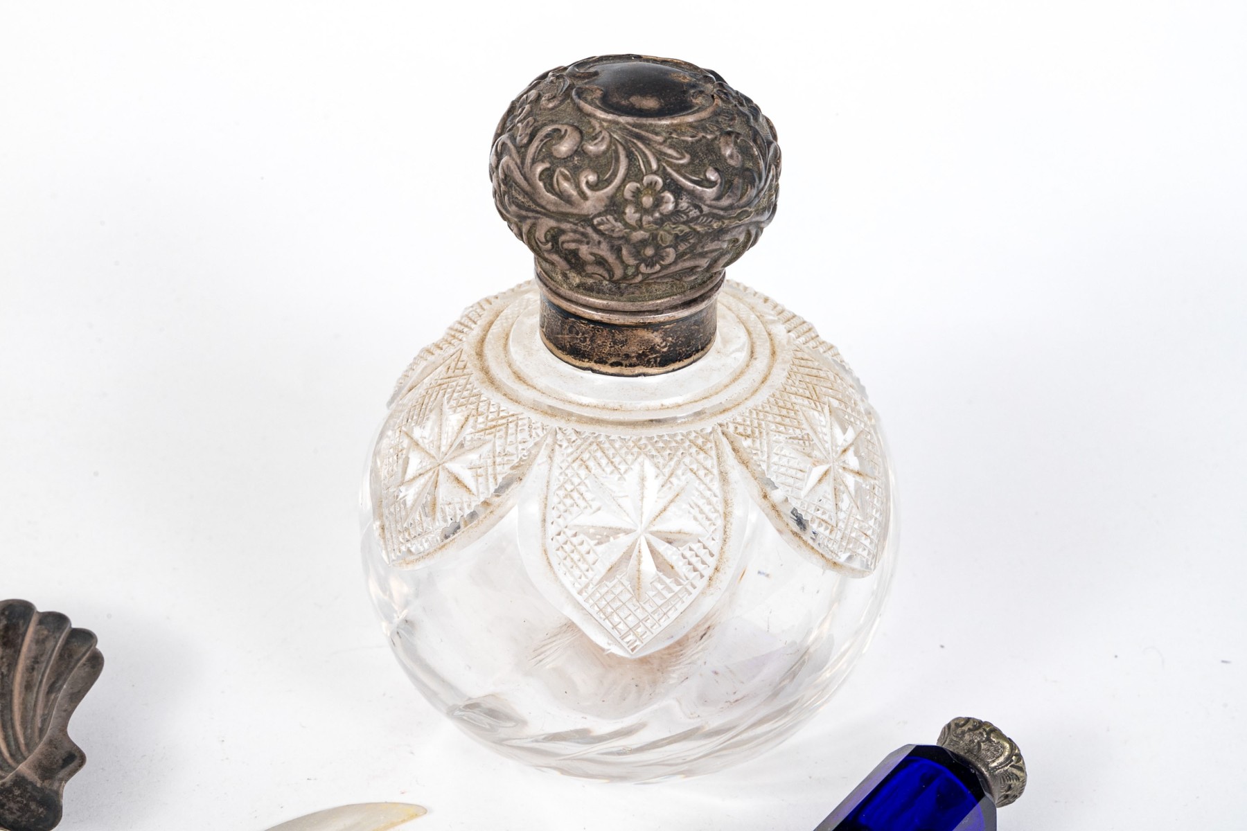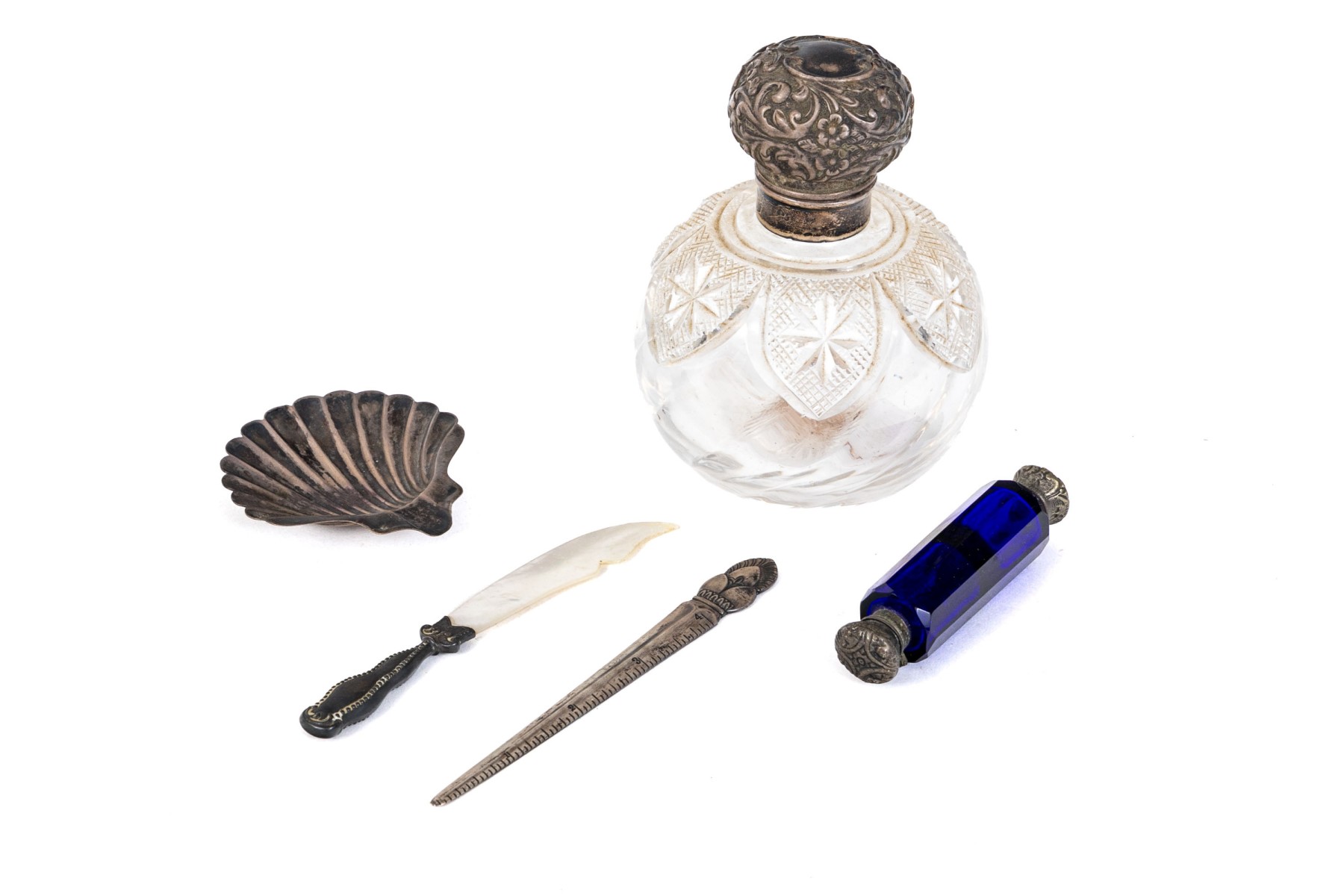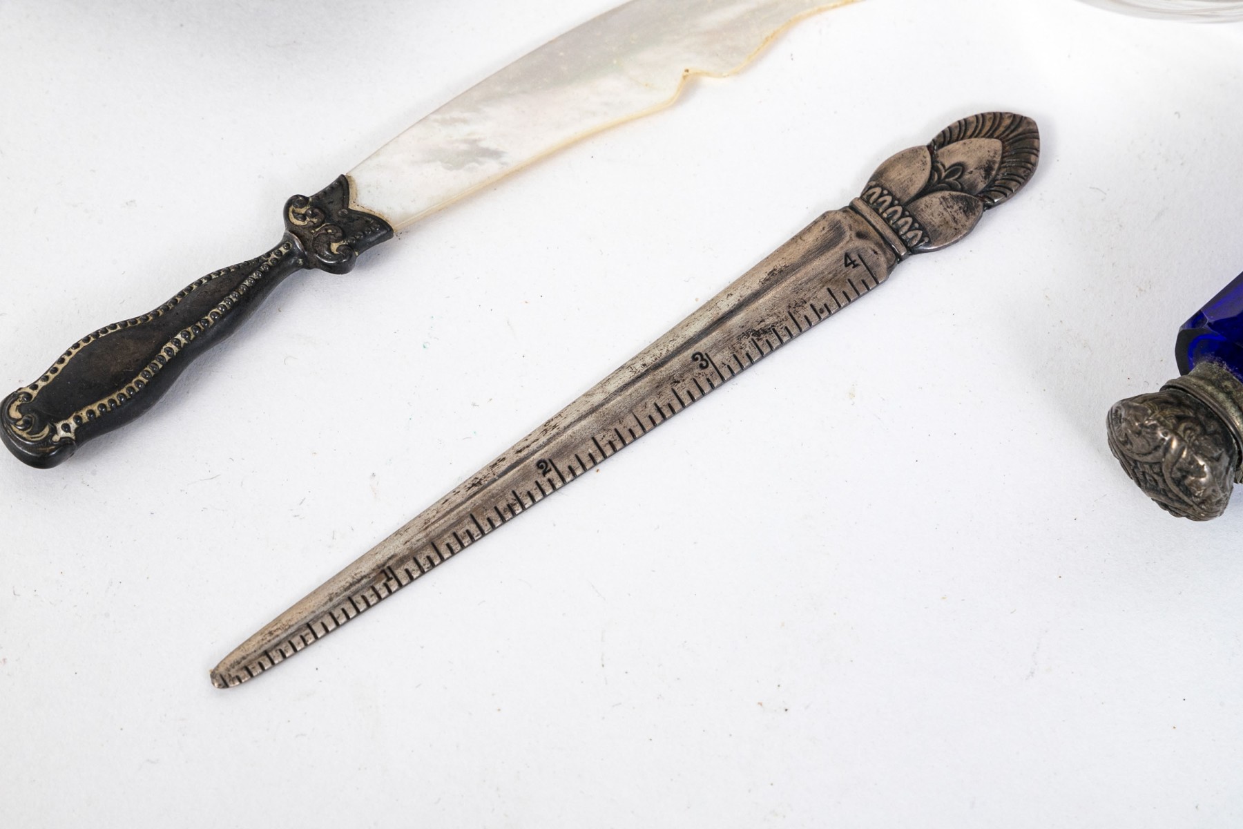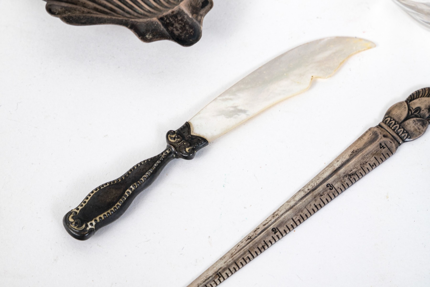 Includes a sterling marked shell dish, a M.O.P. metallic mounted letter opener, a ruler letter opener, a cobalt plate mounted vial, and a cut crystal with hinged lid repousse silver hinged lid.