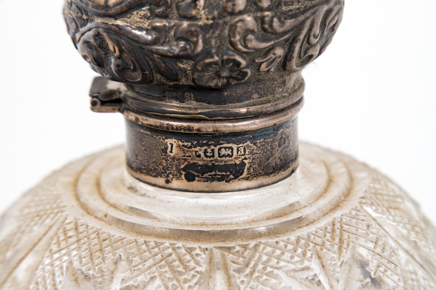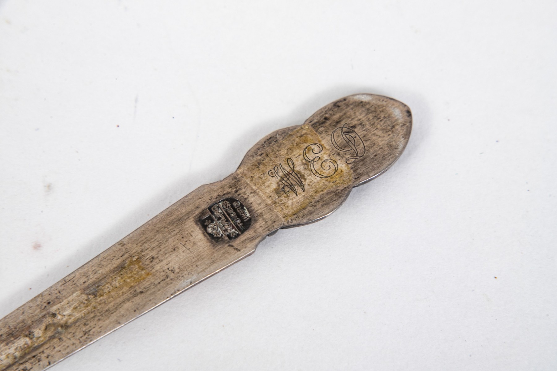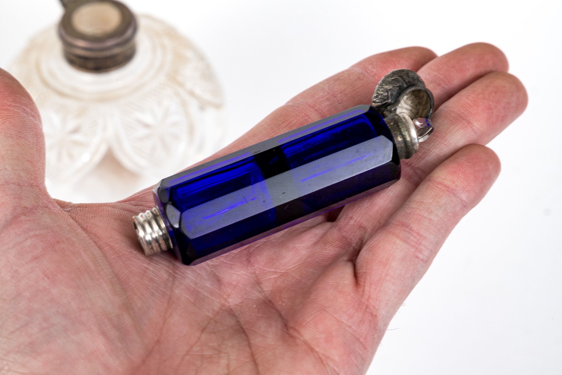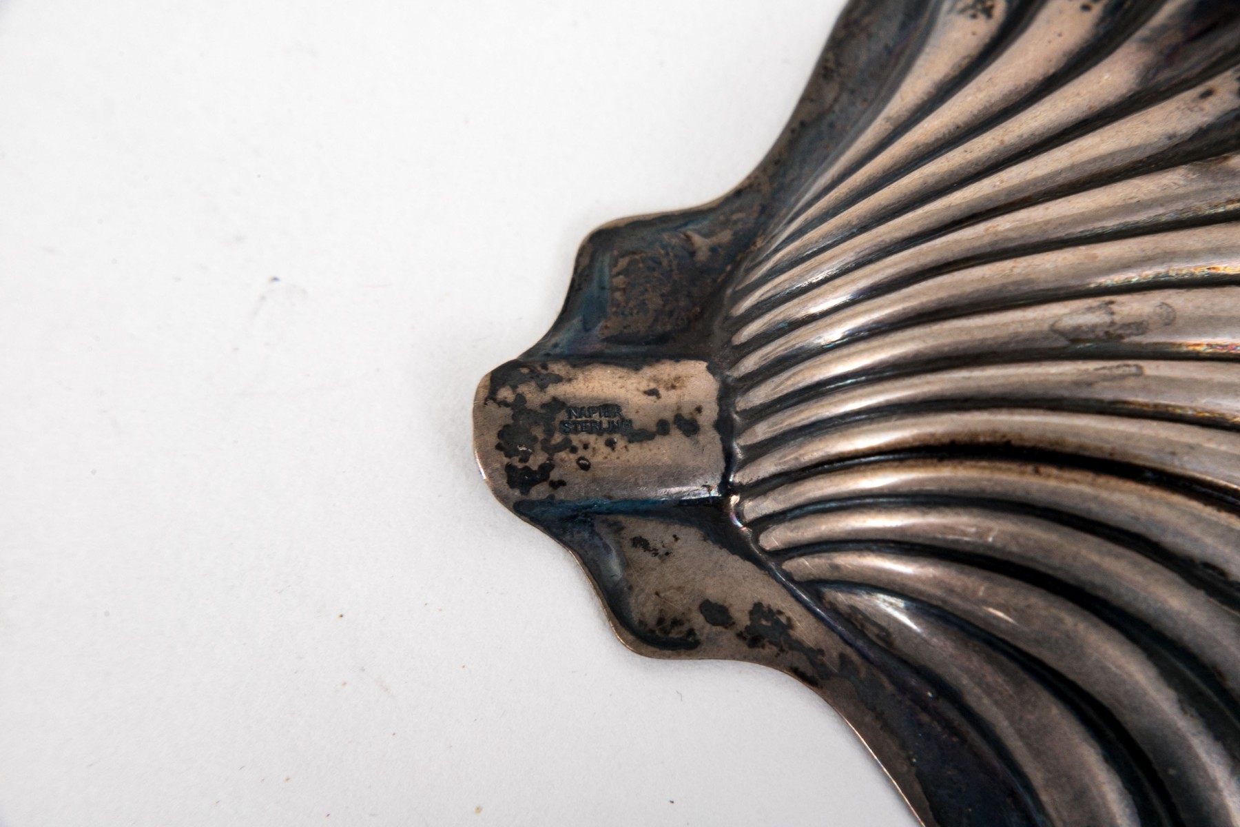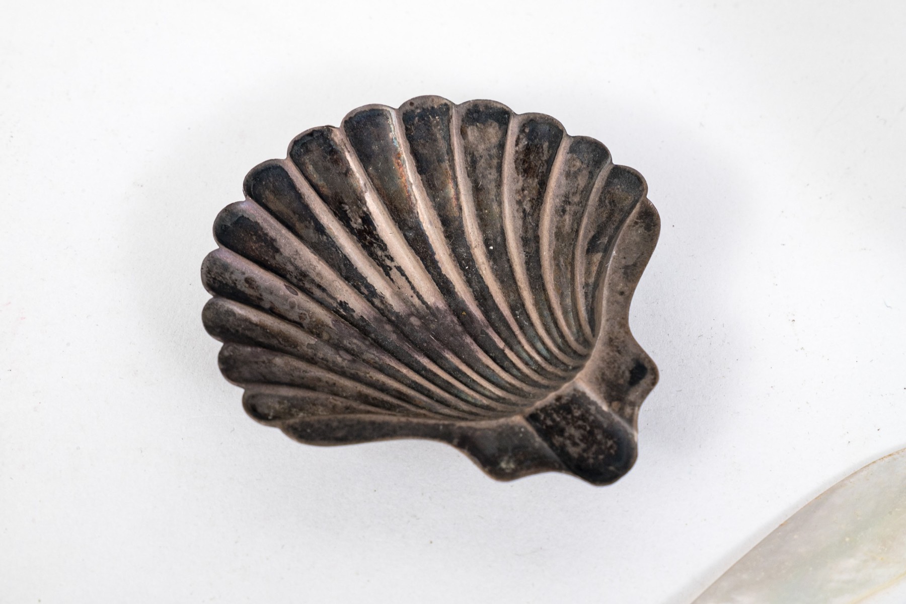 Includes a sterling marked shell dish, a M.O.P. metallic mounted letter opener, a ruler letter opener, a cobalt plate mounted vial, and a cut crystal with hinged lid repousse silver hinged lid.