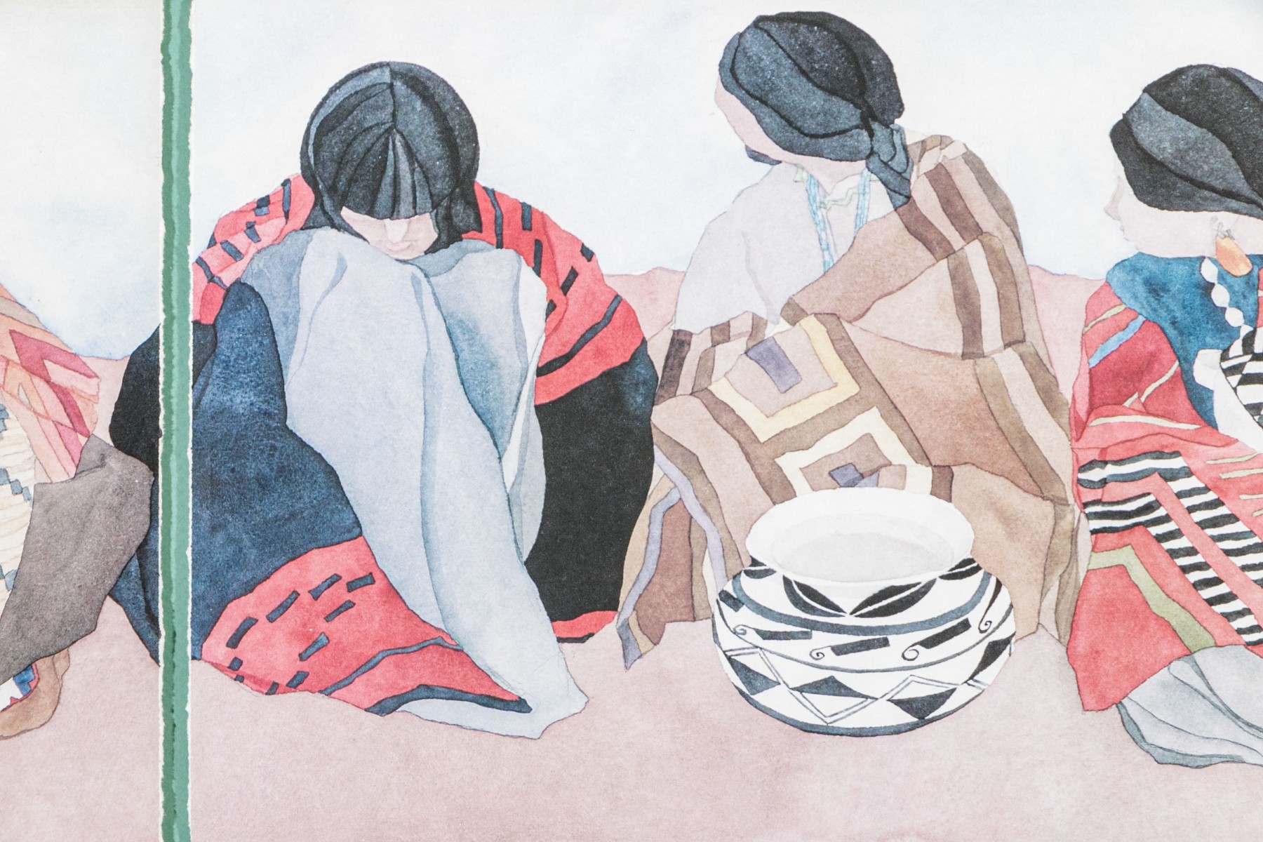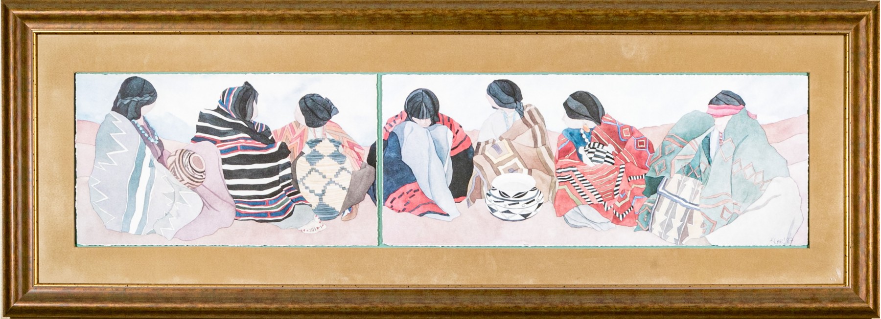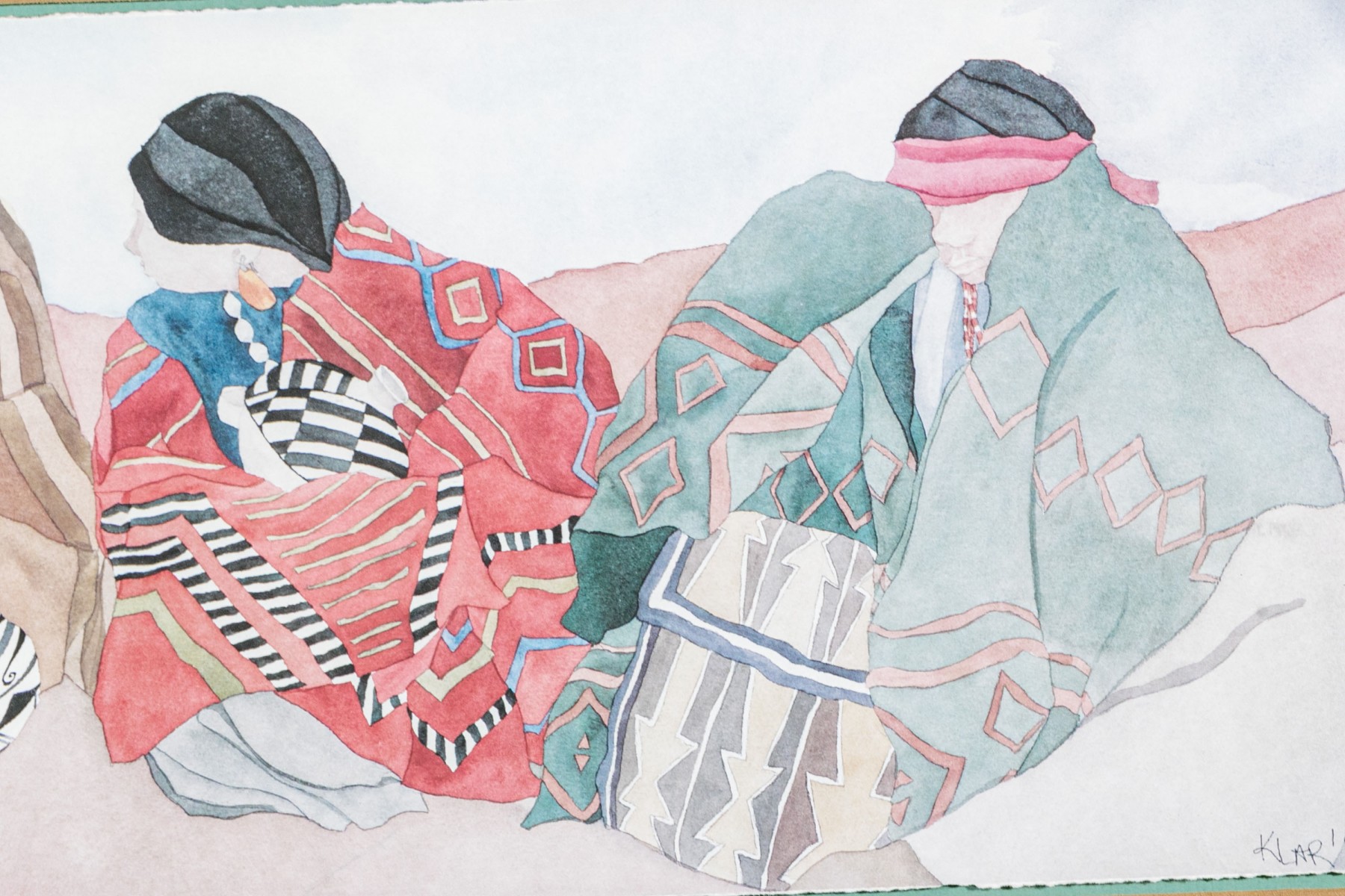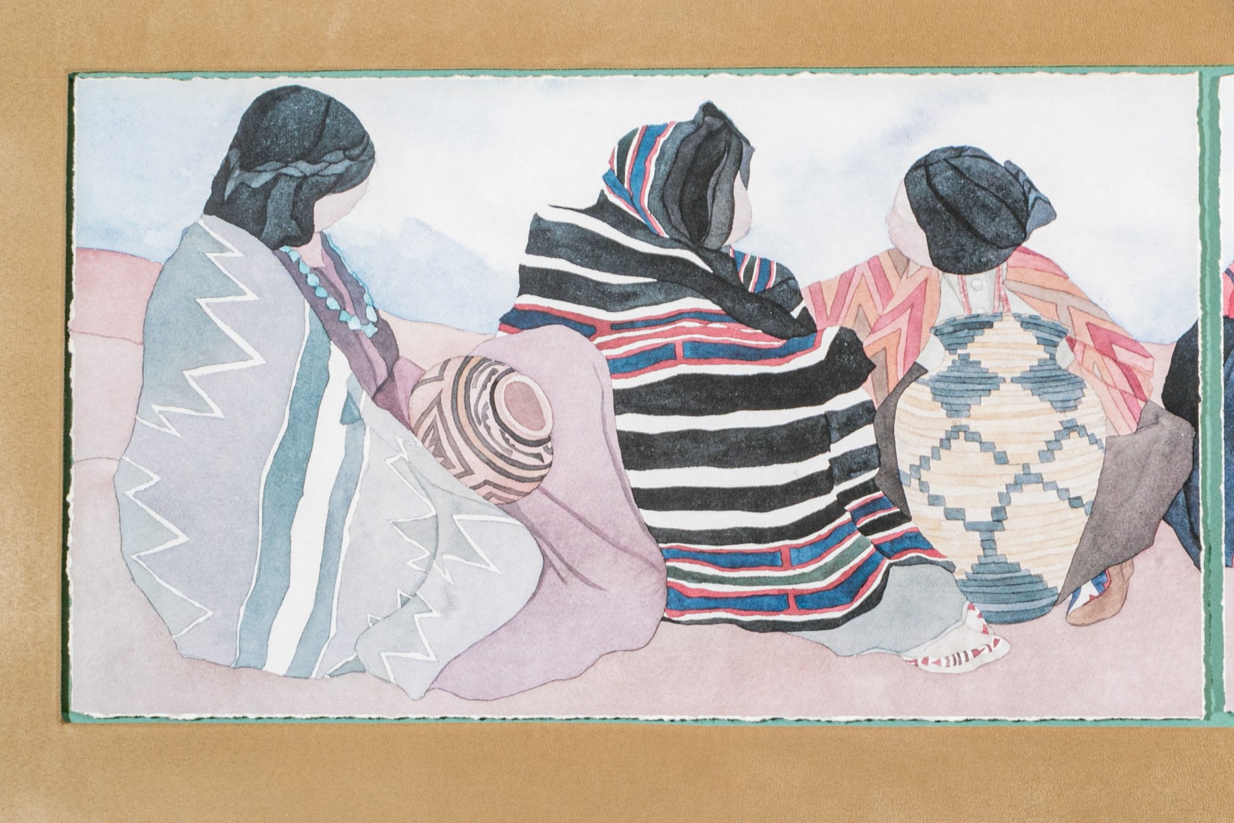 Irene Klar (Canadian, b. 1950) watercolor painting of Native American figural subjects paper, matted and framed. Signed “Klair”, Dated 87’ on lower right.