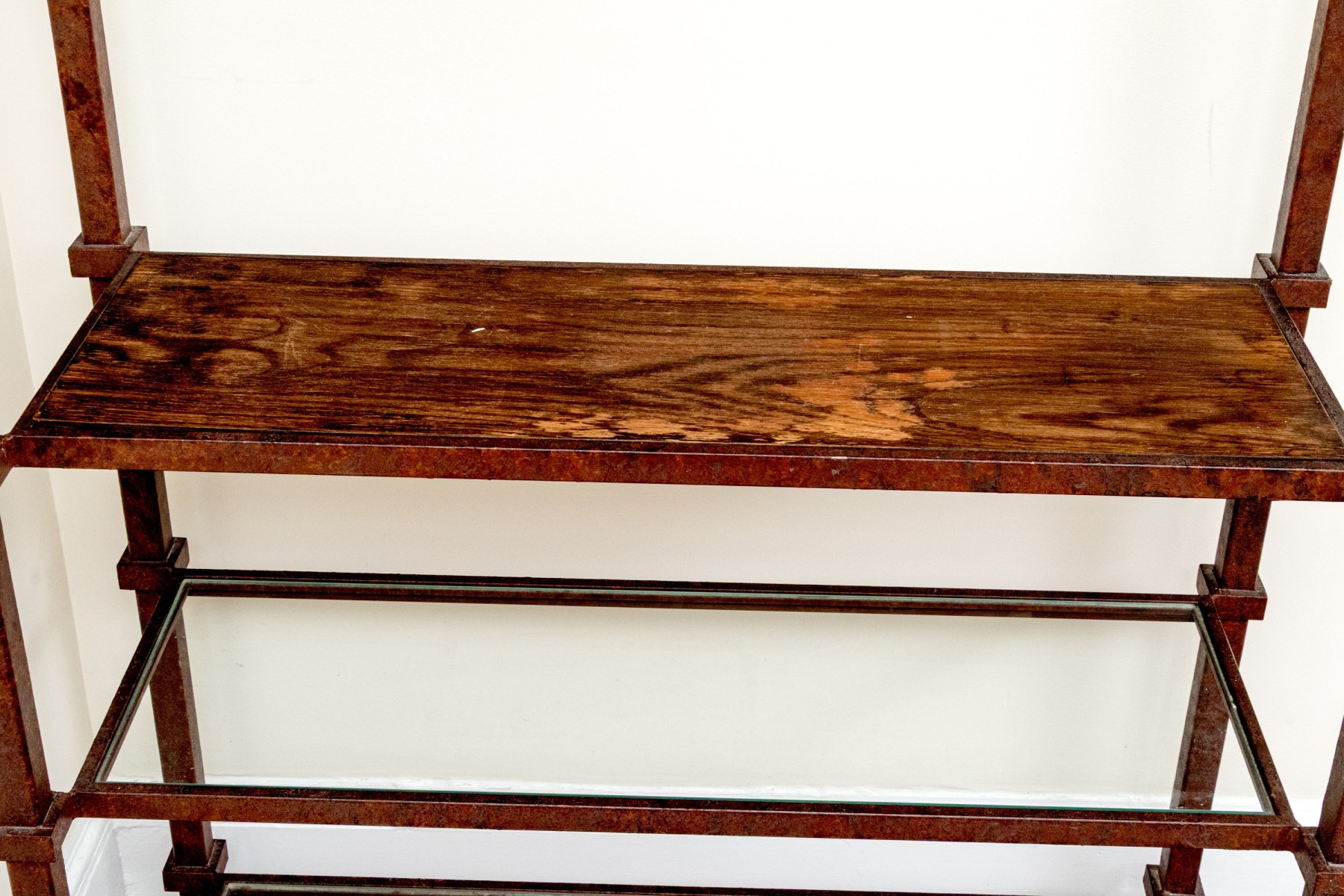 A handsome industrial chic etagere designed with a rustic iron frame topped with square finials, supporting three glass top shelves, a single shelf in medium brown oak, and two lower glass shelves. The sleek profile and multi-material design makes for a versatile piece that is both stylish and functional.