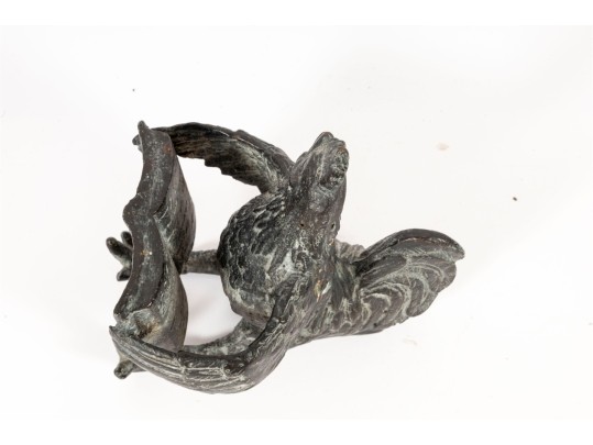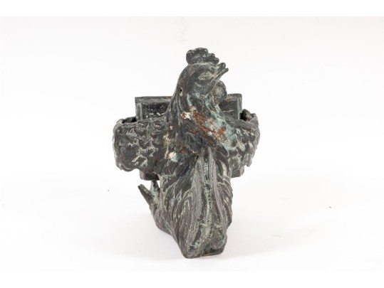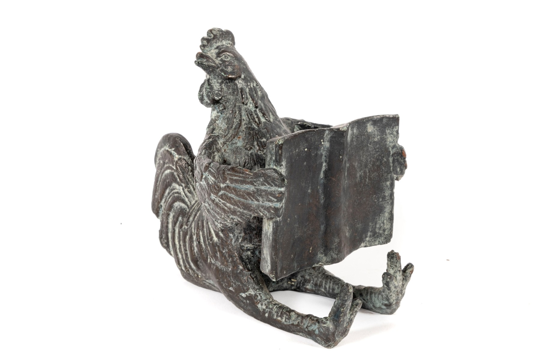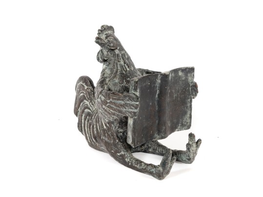 A quaint iron sculpture/casting of a literate rooster -- ideal for use as a desktop ornament, paperweight, or decorative bookend.