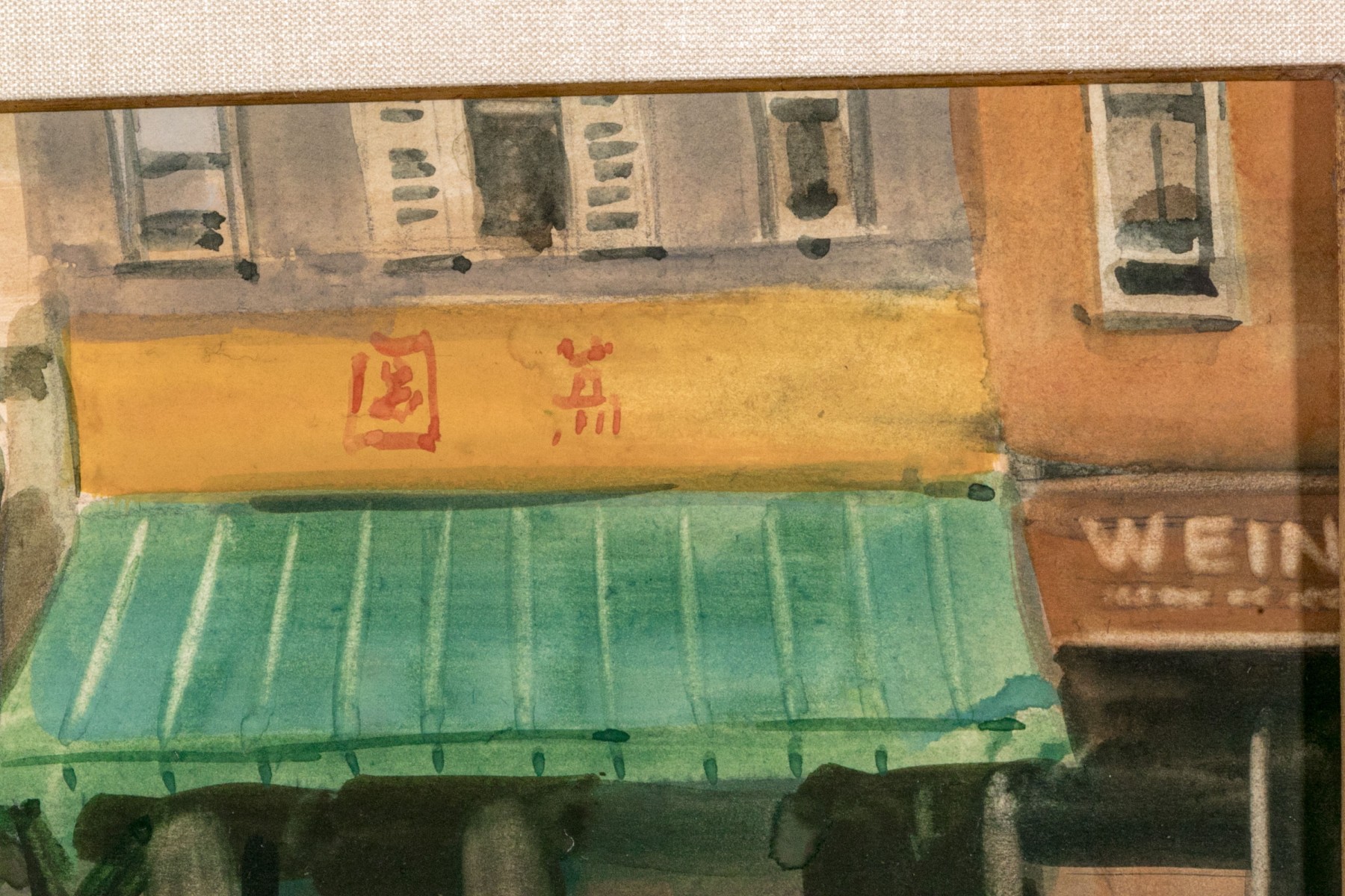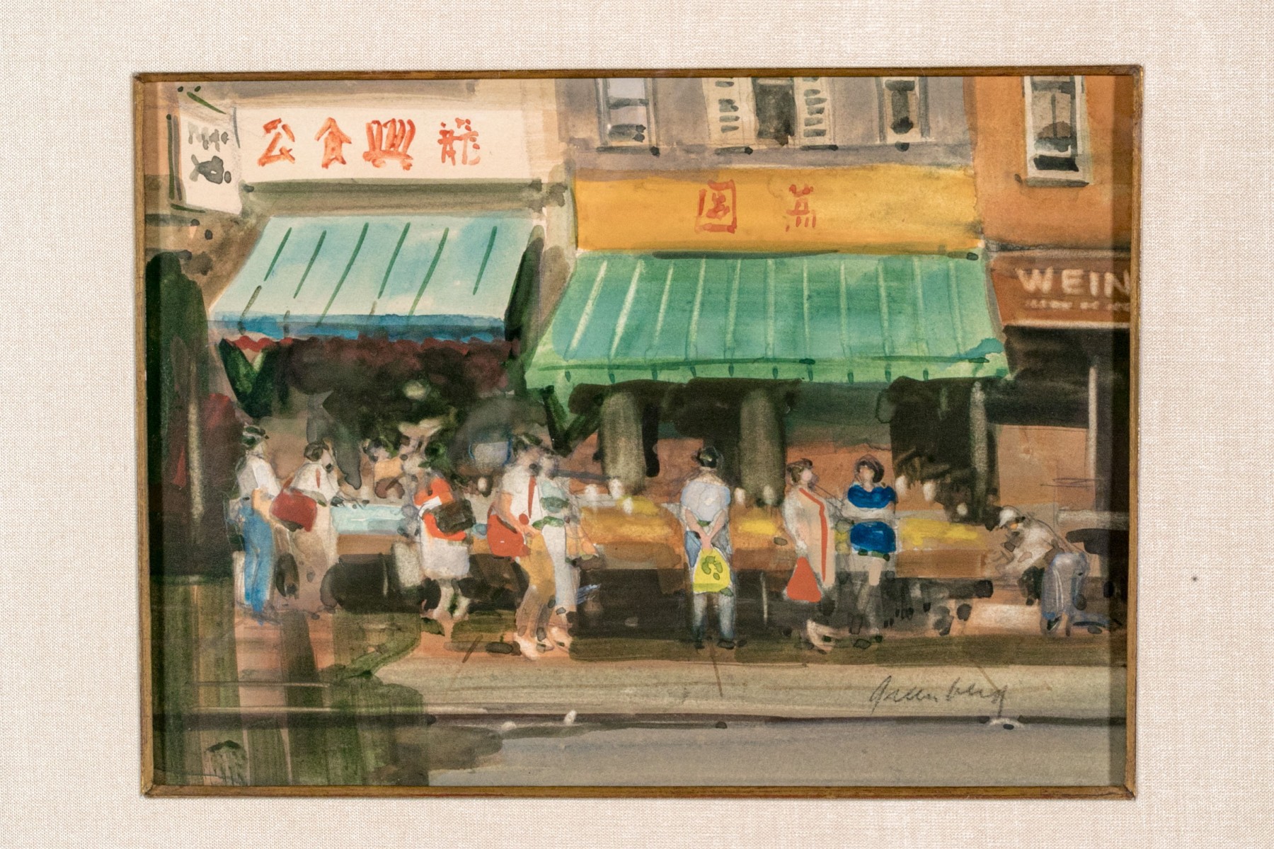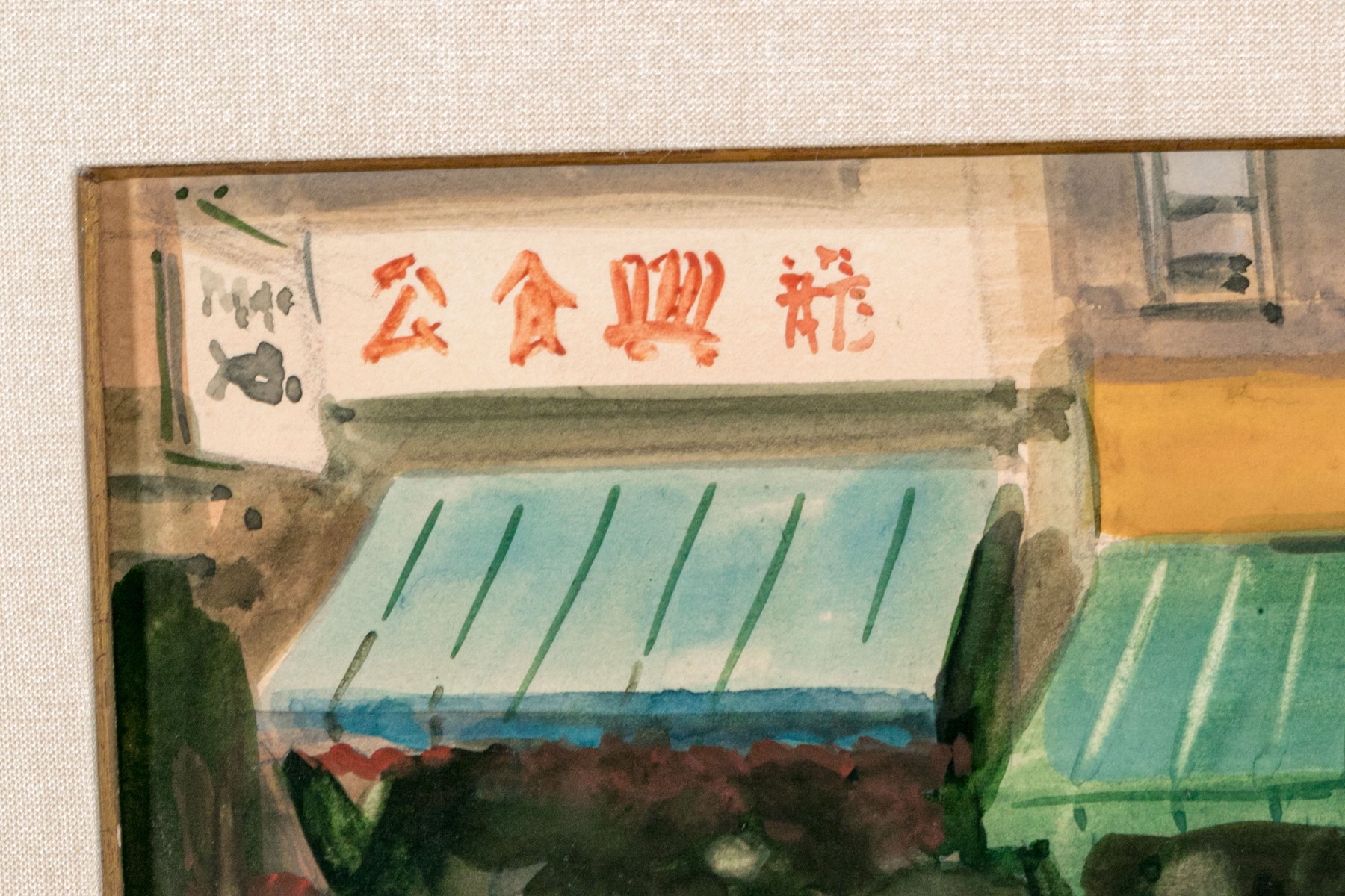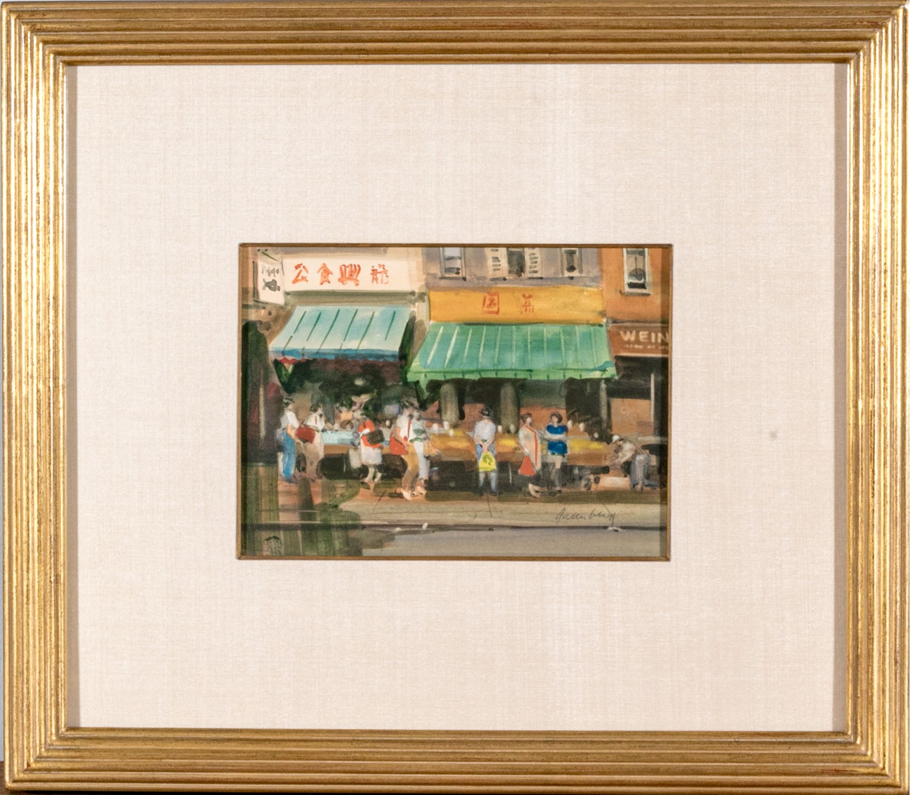 Watercolor on paper, depicting a street scene of Canal Street in New York City's China Town.