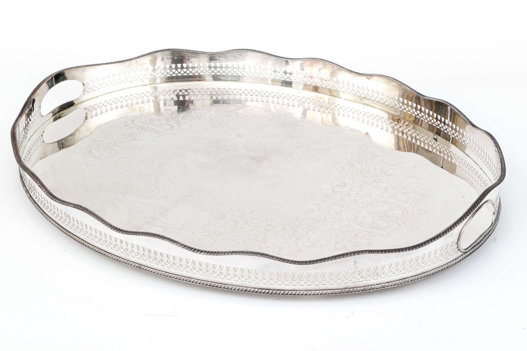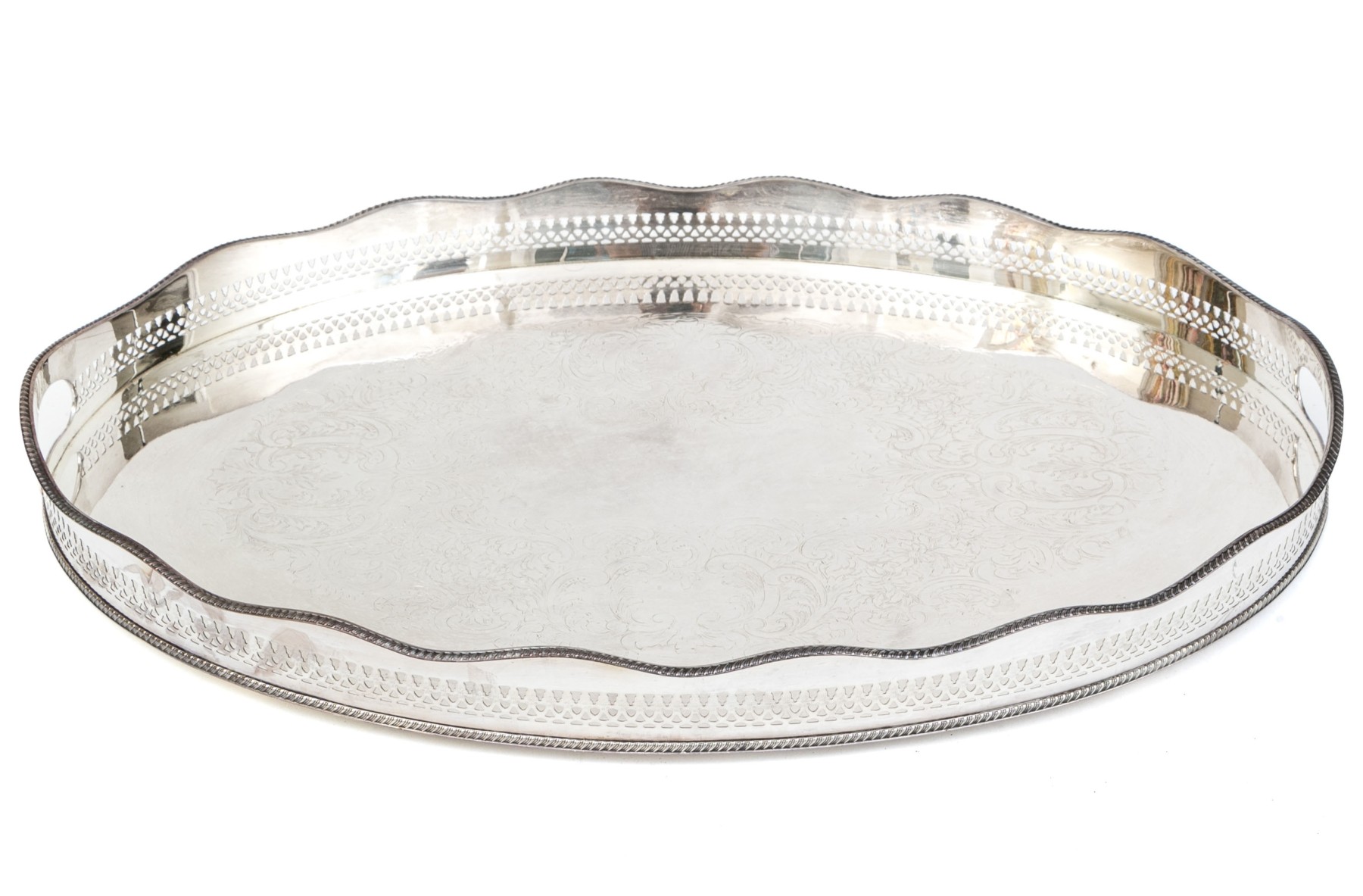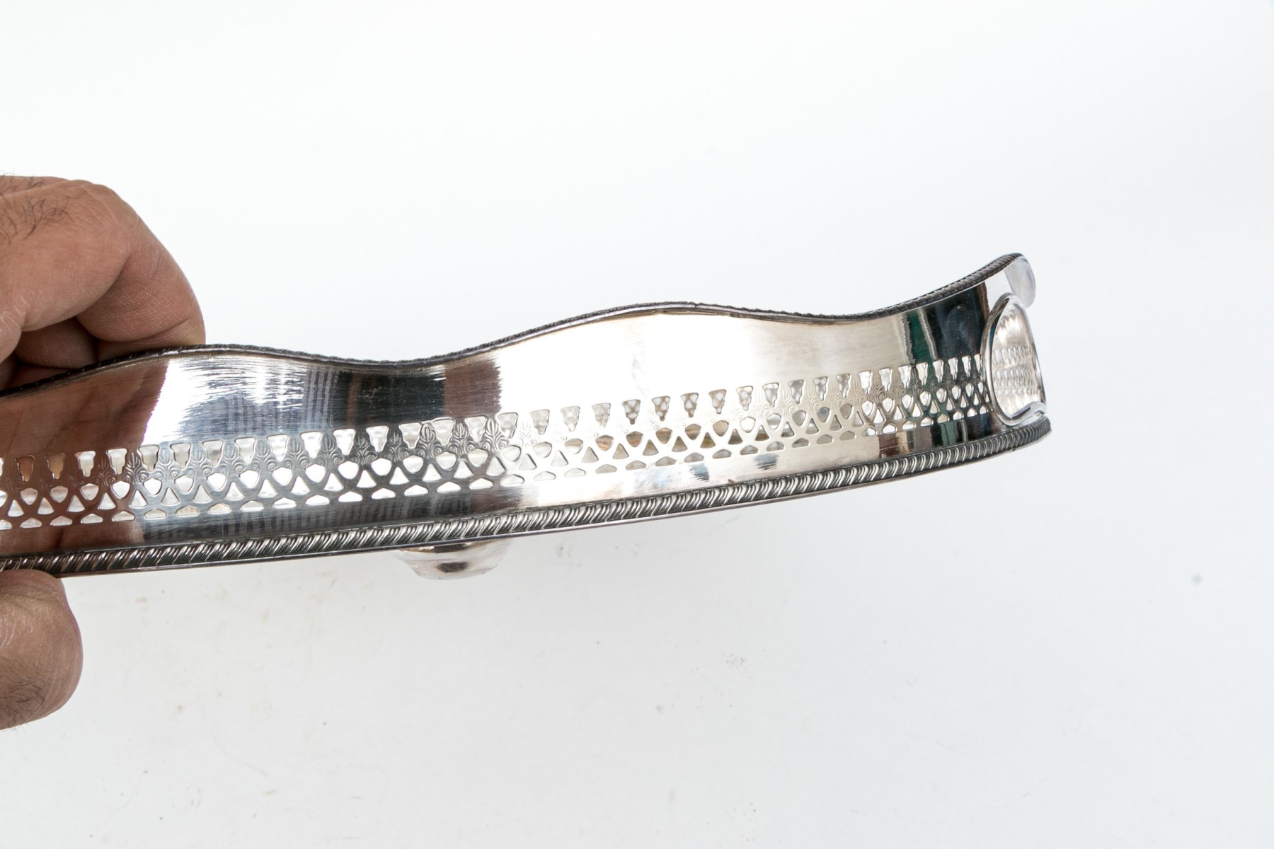 Israel Freeman & Son English oval silver plated tray with a scalloped and reticulated rim sporting elegant gadrooned trims over bun feet. The sides are pierced with open handles.