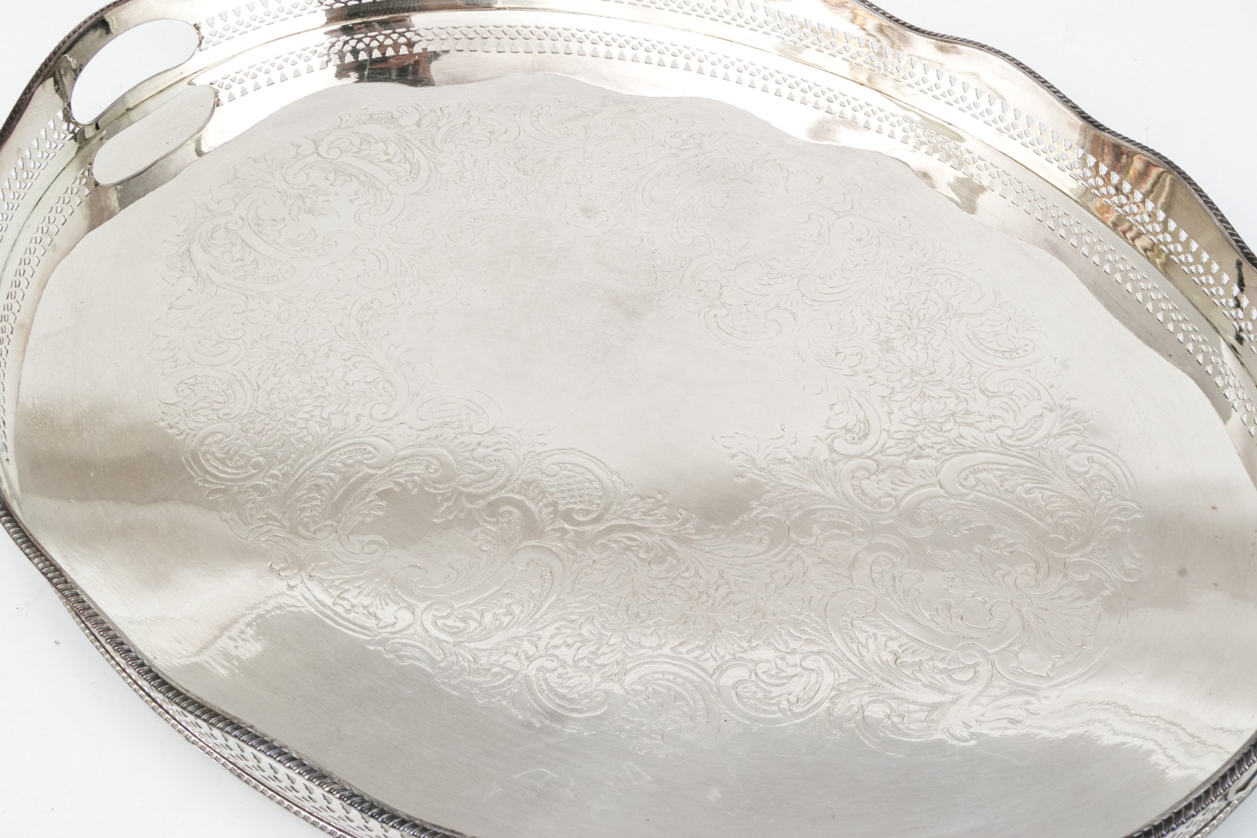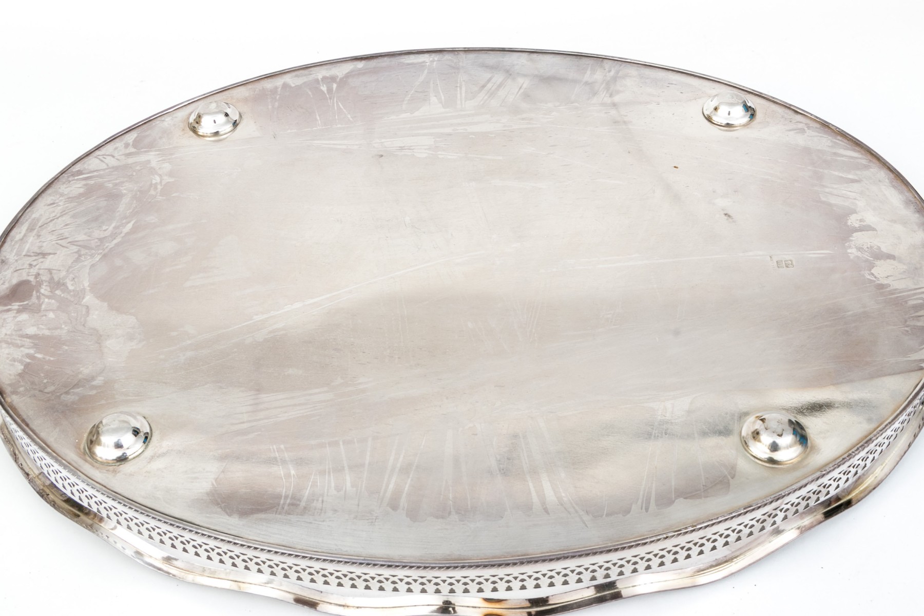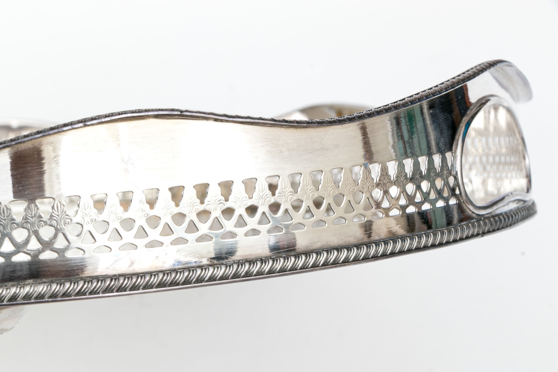 Israel Freeman & Son English oval silver plated tray with a scalloped and reticulated rim sporting elegant gadrooned trims over bun feet. The sides are pierced with open handles.