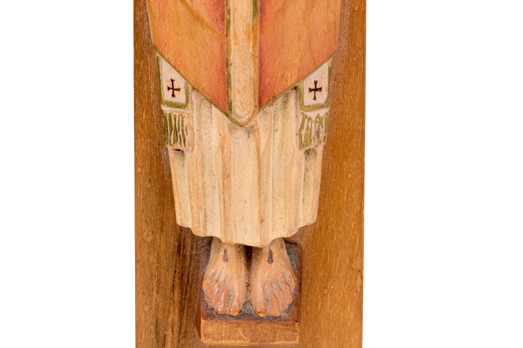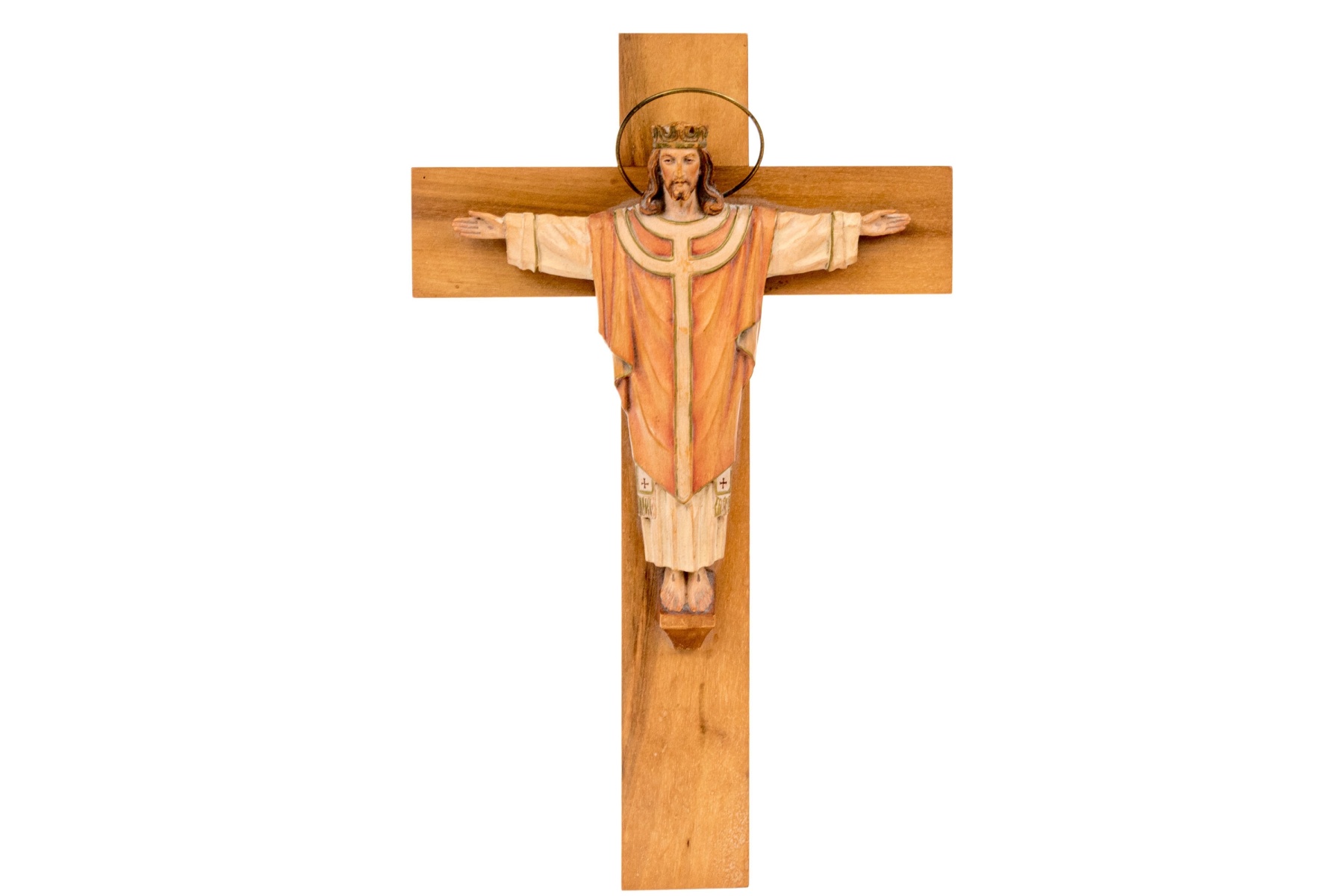 A well crafted Anri carved wood crucifix depicting a crowned figure of Jesus with a wire halo wearing a pale orange and cream white robe against a simple plank cross. Bearing a sticker label to the verso.