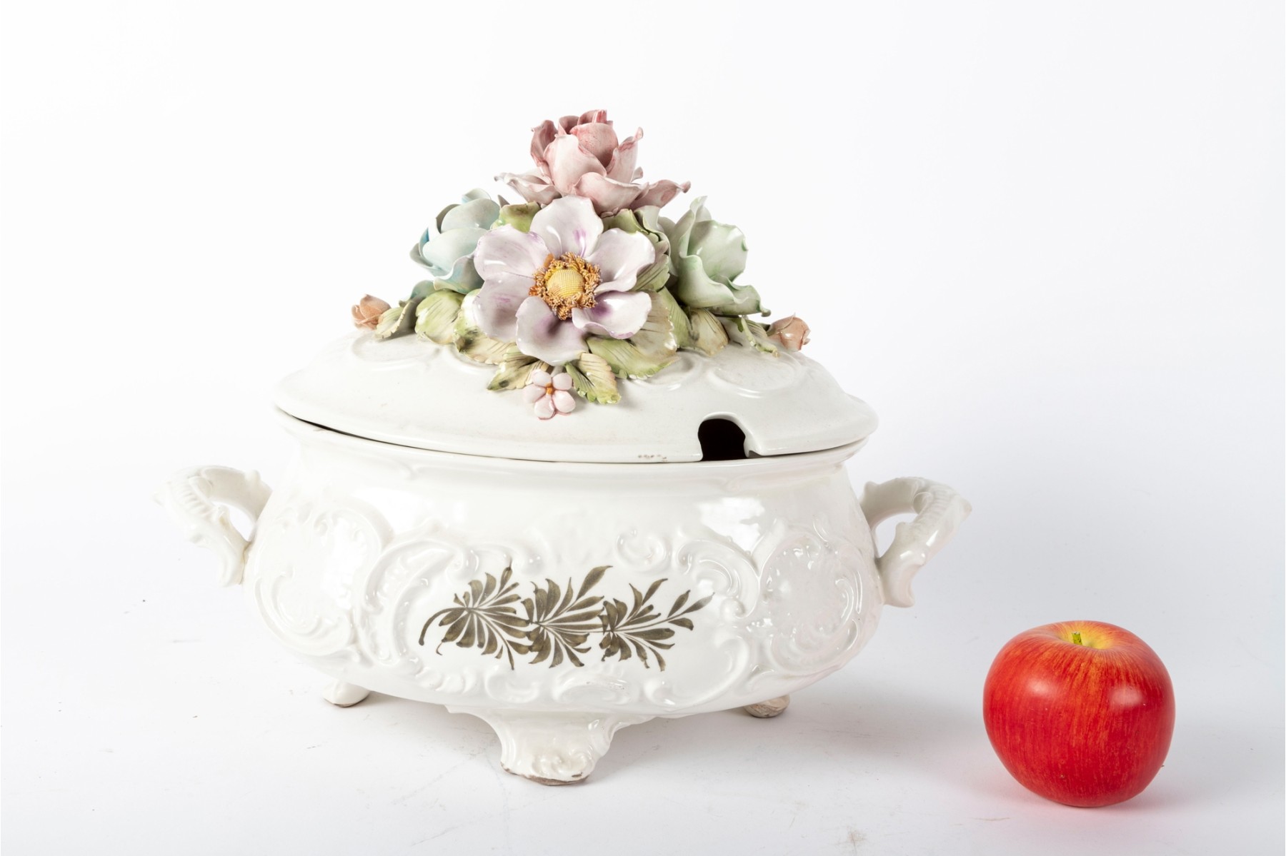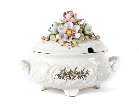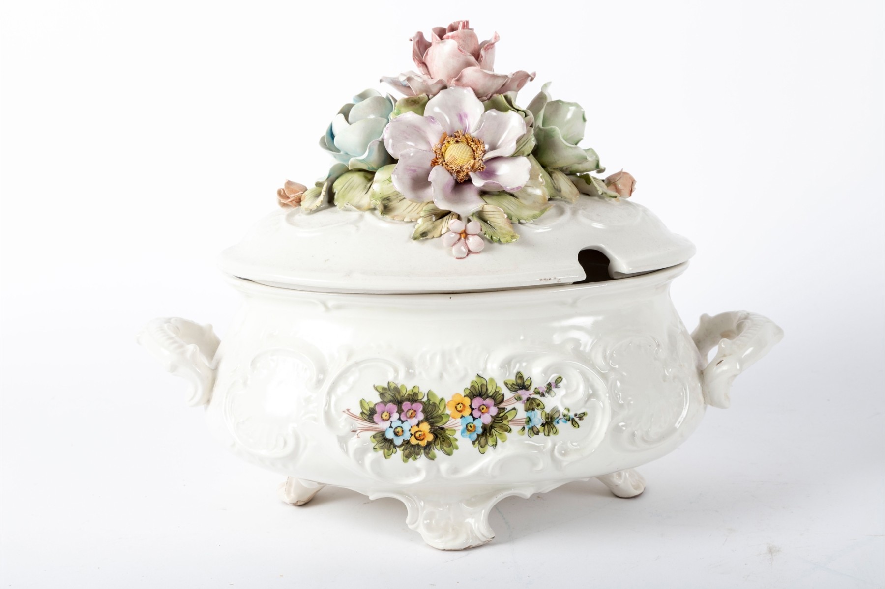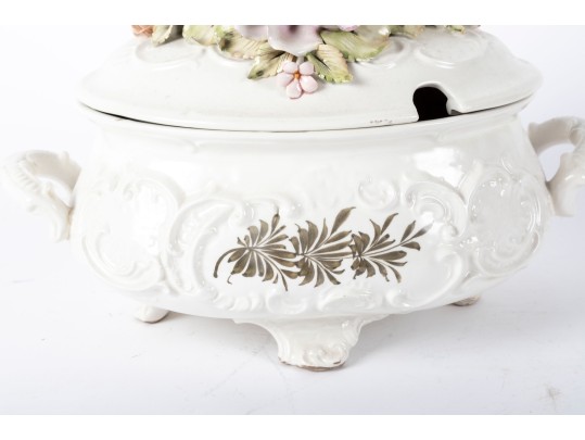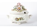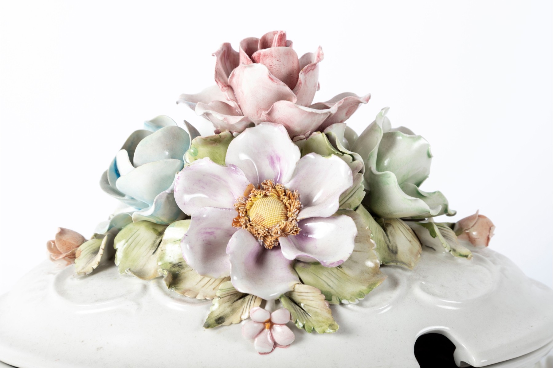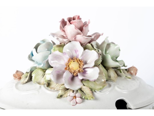 An Italian Capodimonte-style porcelain tureen featuring an ornate, embossed body with scrollwork and floral motifs. The white glaze is accented with gold detailing, while the lid is crowned with a cluster of delicately hand-painted pastel flowers.