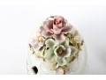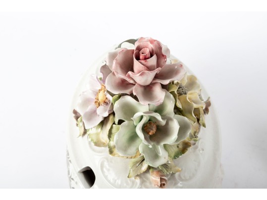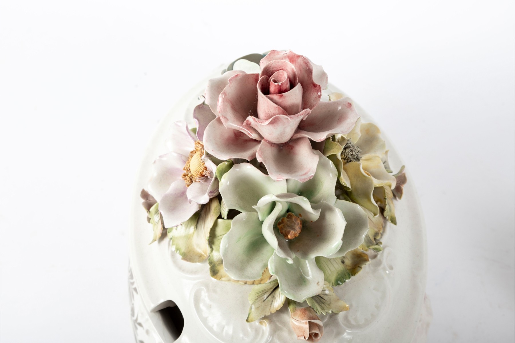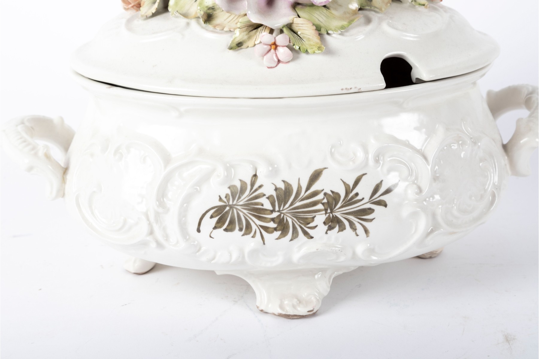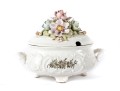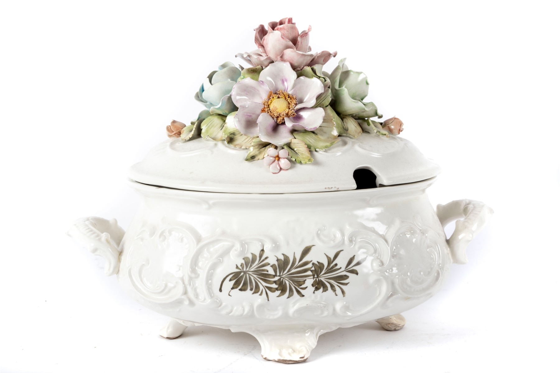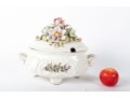 An Italian Capodimonte-style porcelain tureen featuring an ornate, embossed body with scrollwork and floral motifs. The white glaze is accented with gold detailing, while the lid is crowned with a cluster of delicately hand-painted pastel flowers.