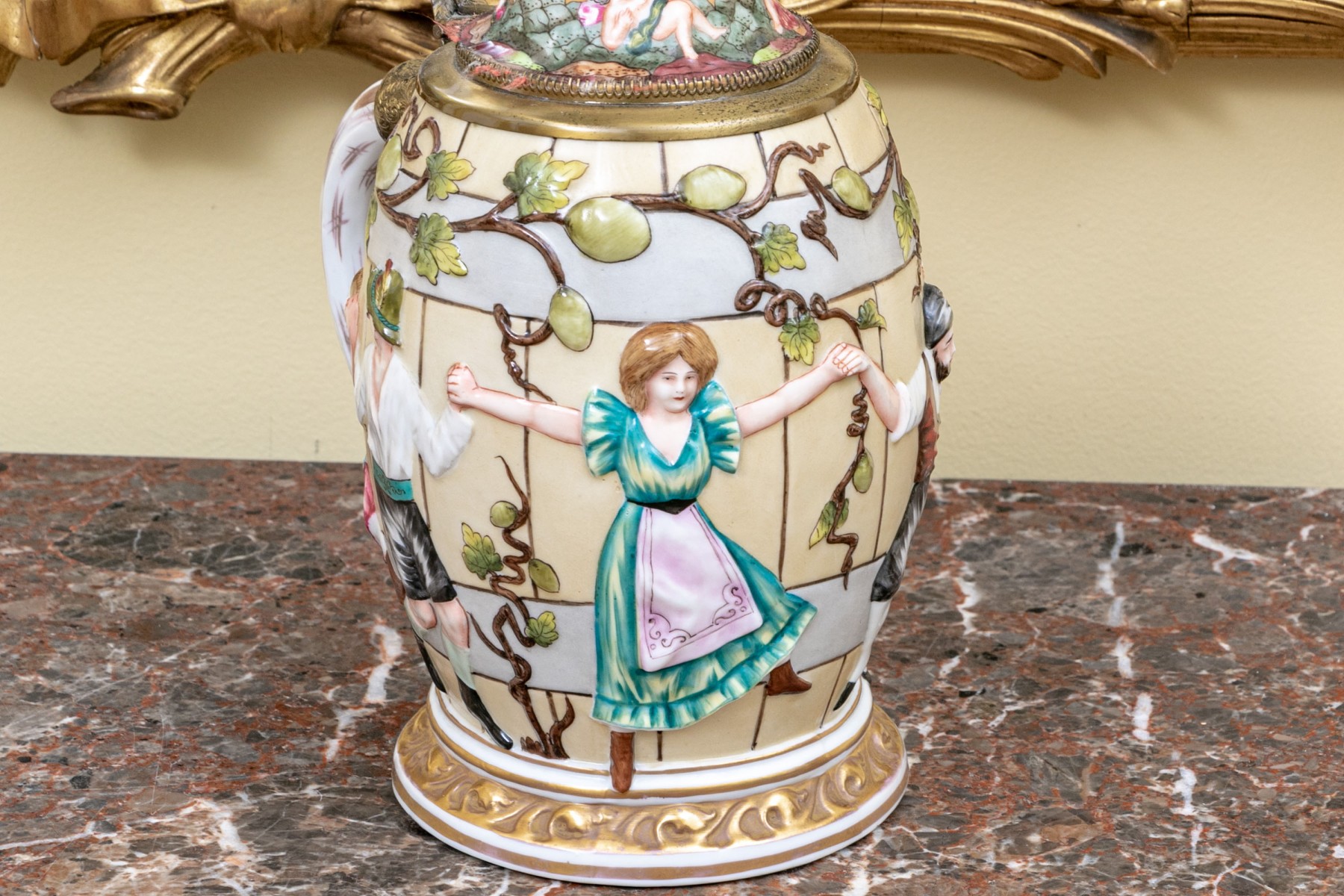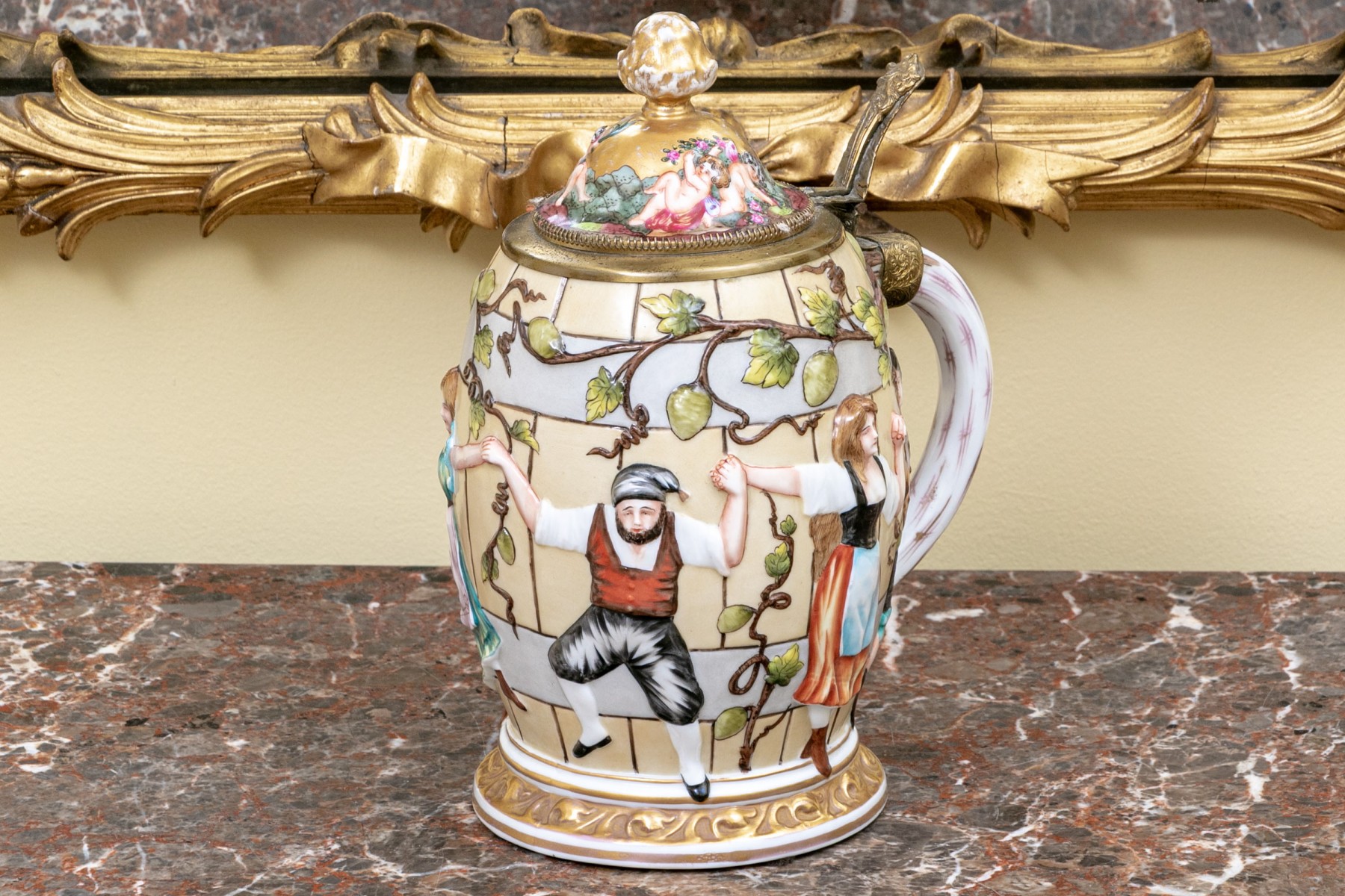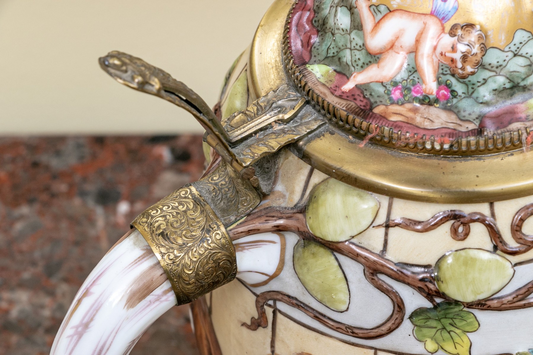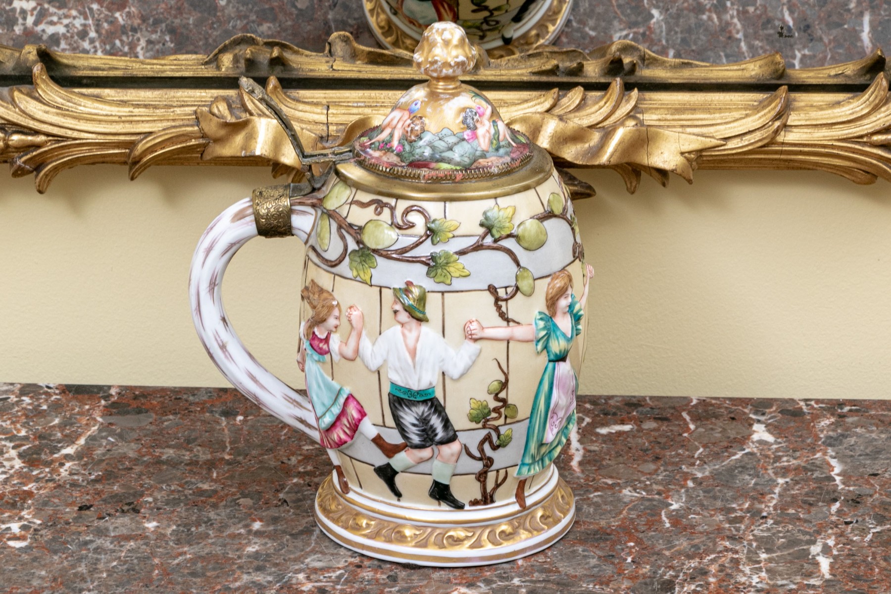 An impressive Italian Crown Naples Capodimonte polychrome finished, moulded tankard, with hinged lid and a handle.