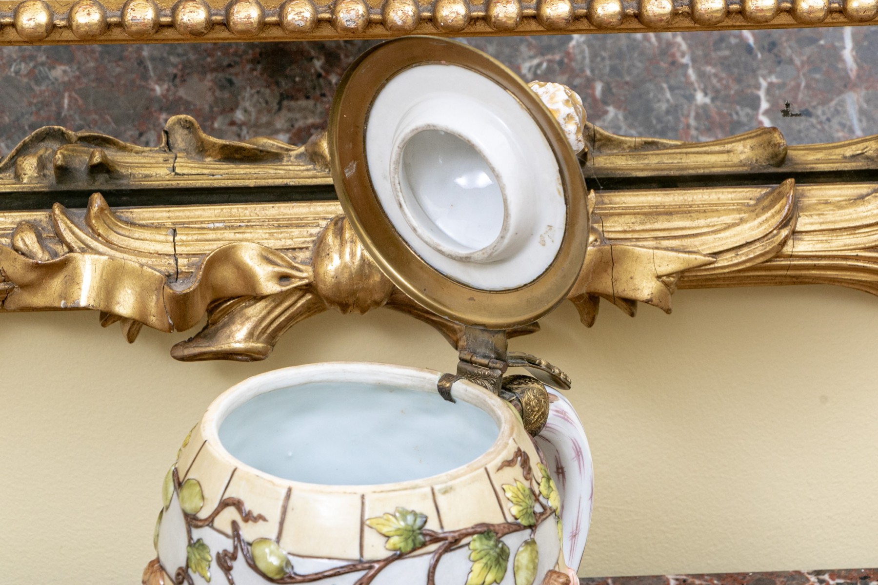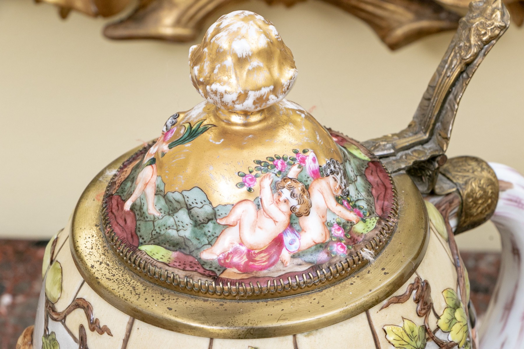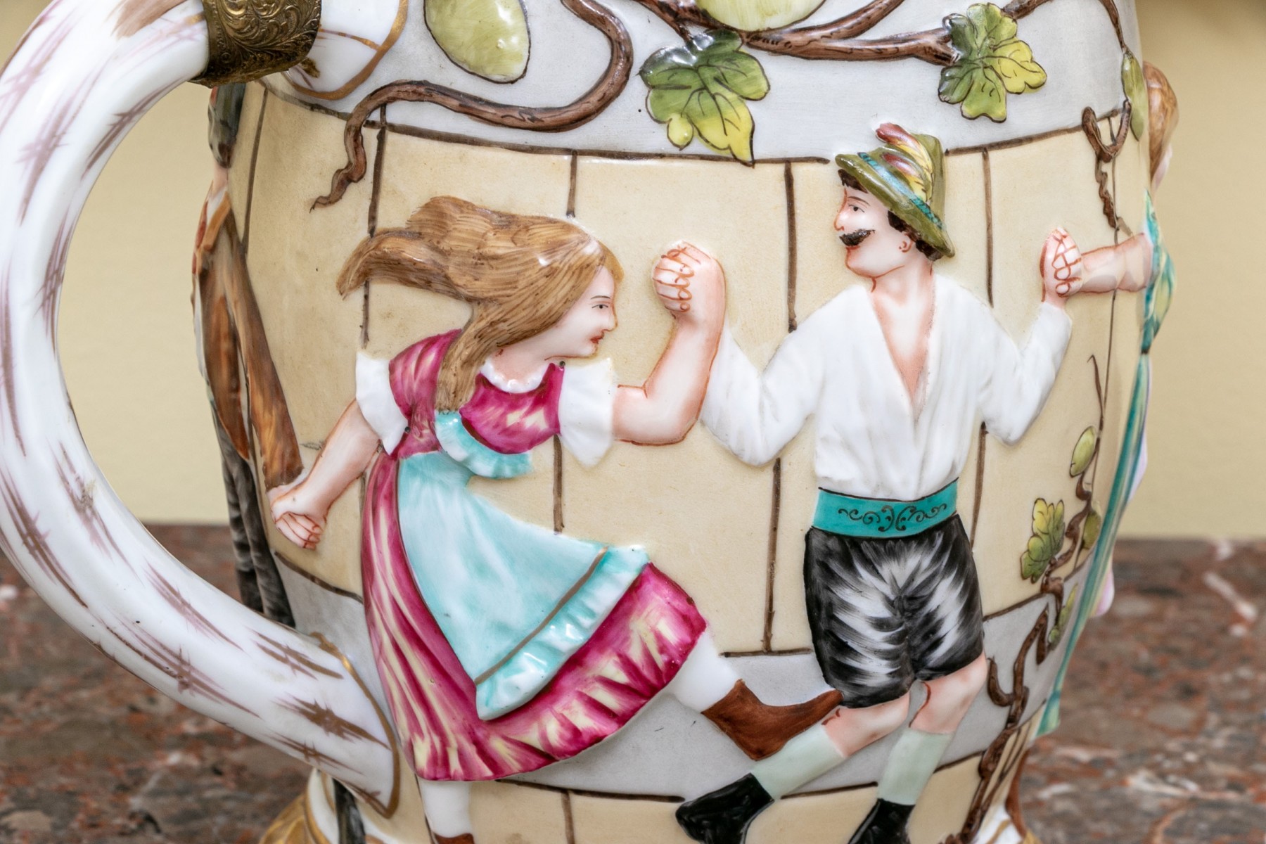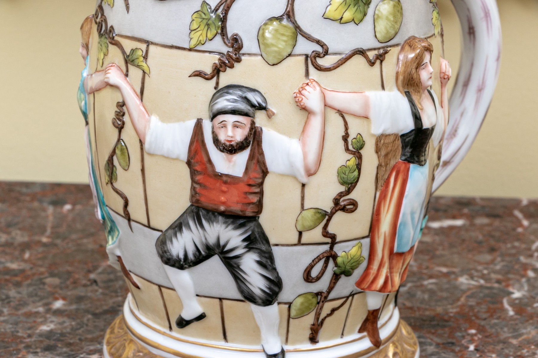 An impressive Italian Crown Naples Capodimonte polychrome finished, moulded tankard, with hinged lid and a handle.