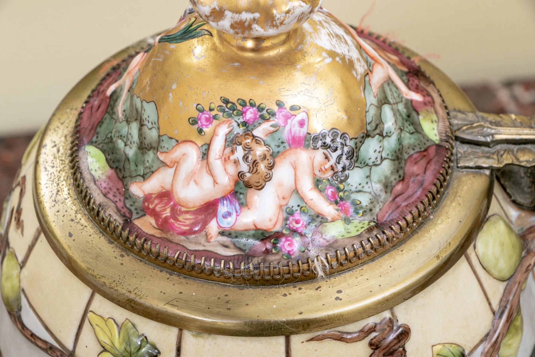 the gilt finished mounted lid features cherub motif with a flame form, gilt finished knop finial. The well potted handle with a well cast thumb pull to raise the hinged lid.
