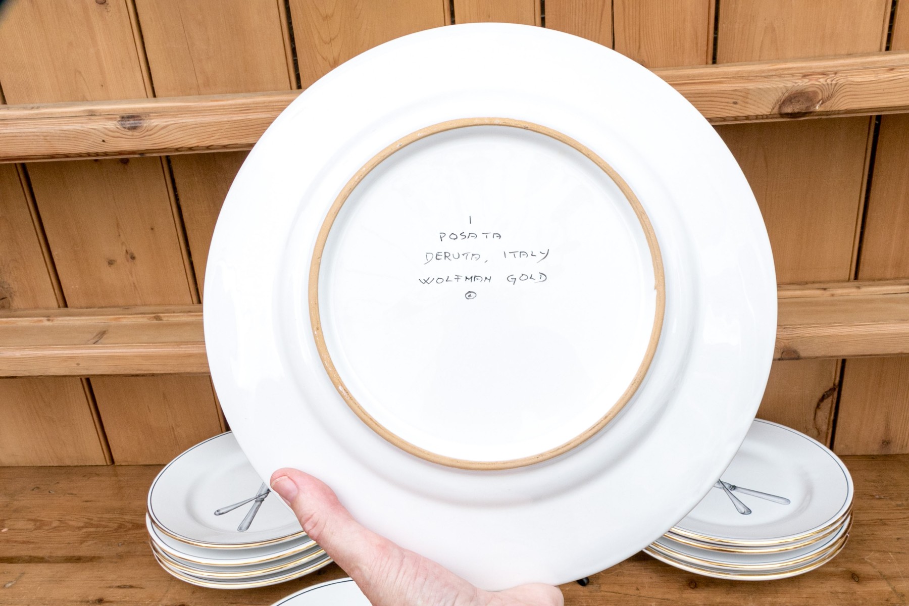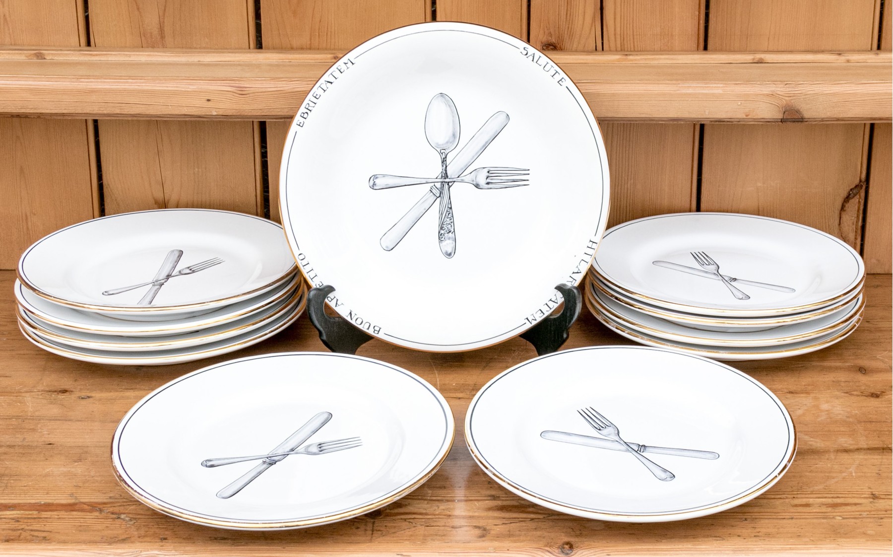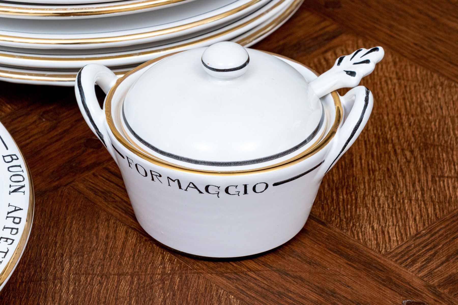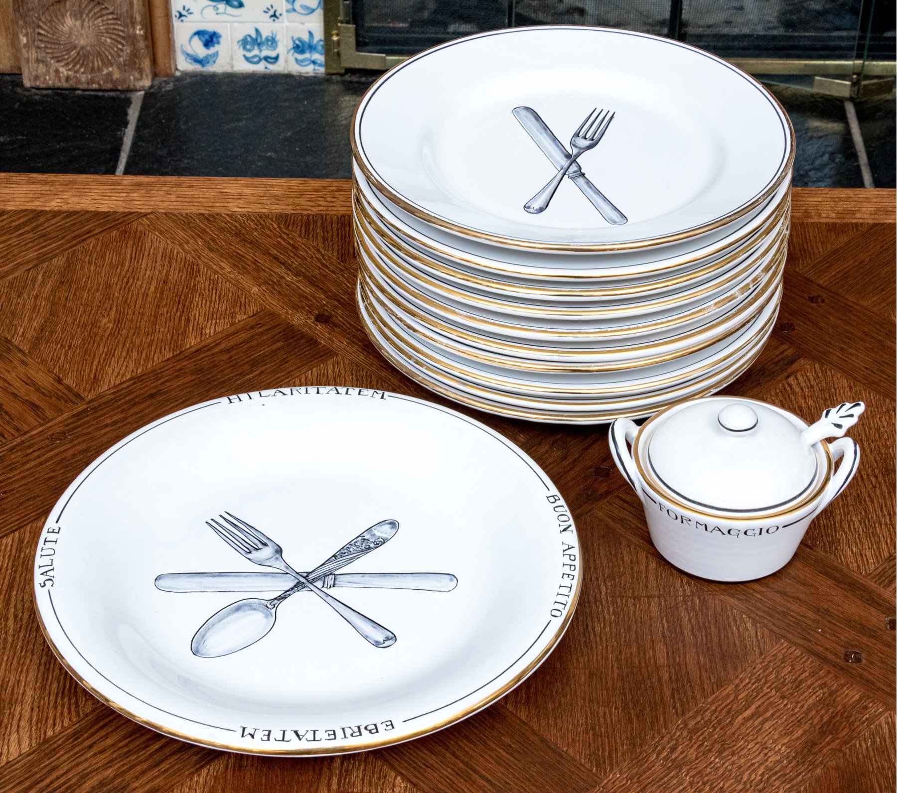 Set of ten, ample pasta plates (11 1/2" diameter), a larger serving bowl (12 1/2" diameter) and the all important cheese server (diameter 4 1/2 x 4"H). Buon appetito!