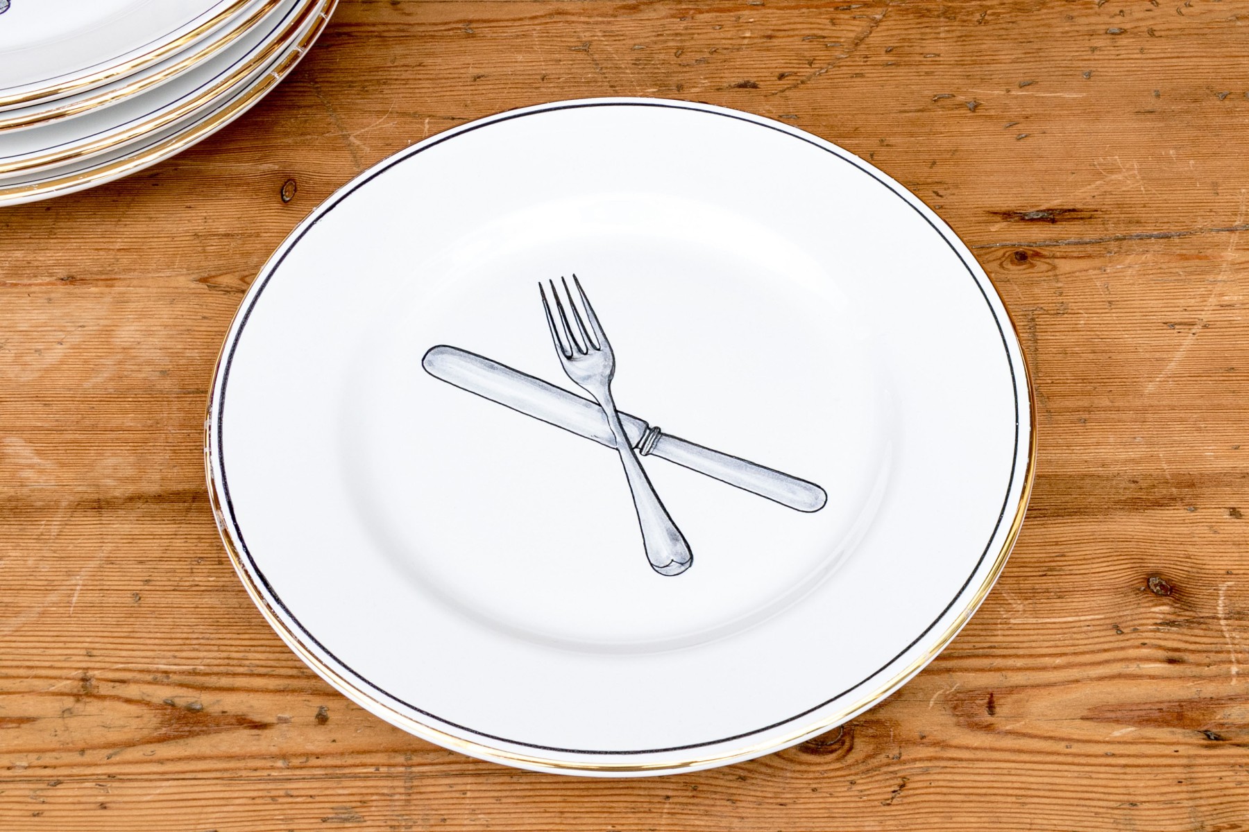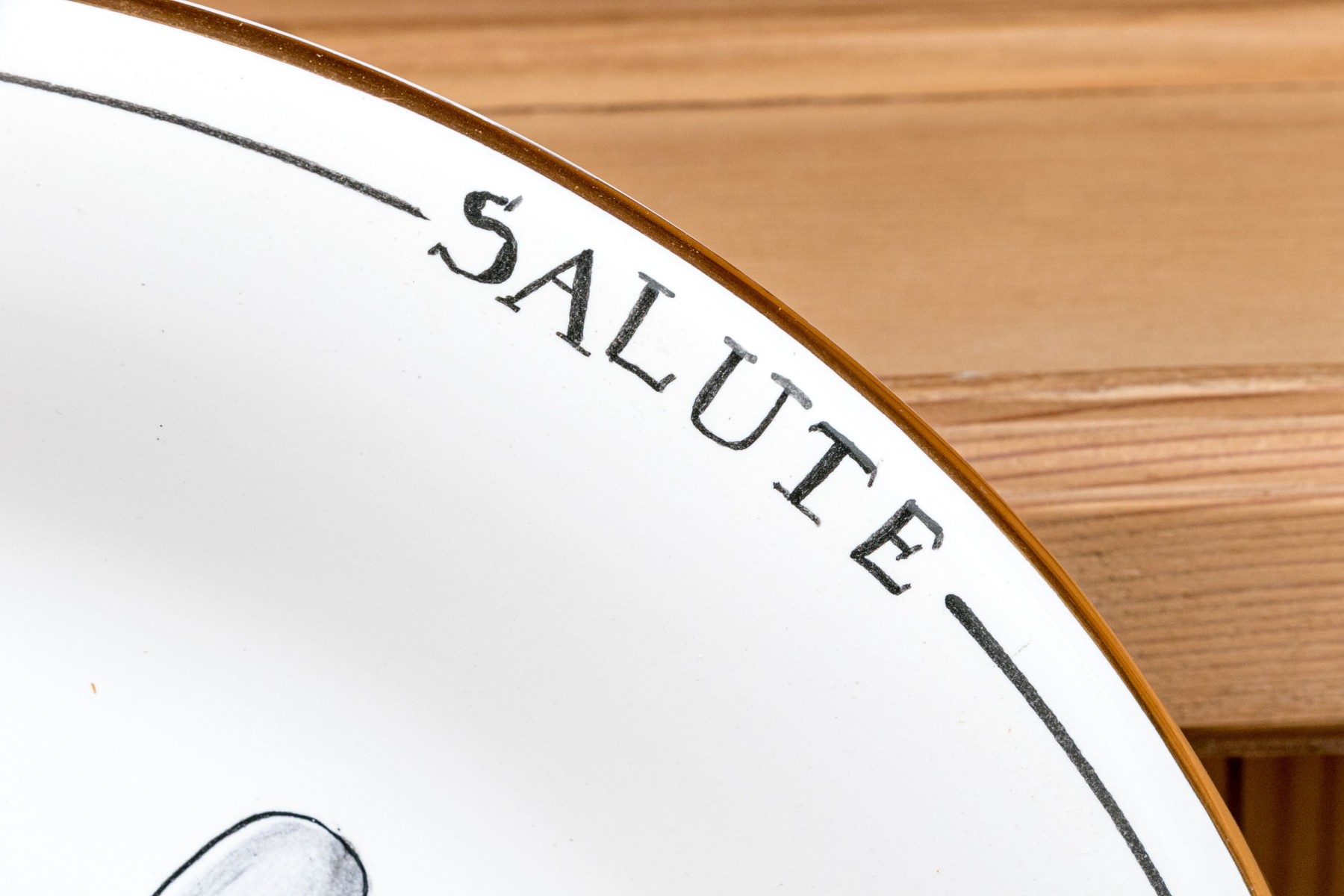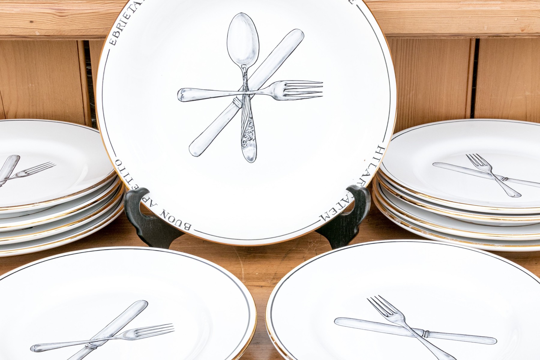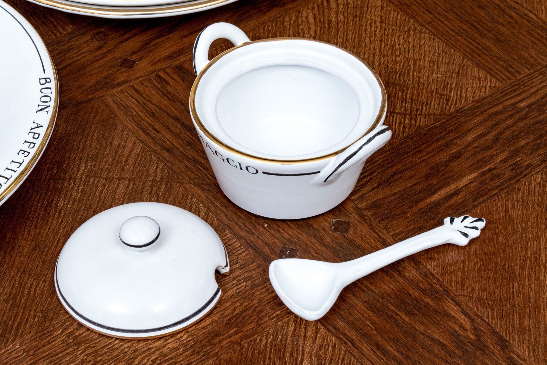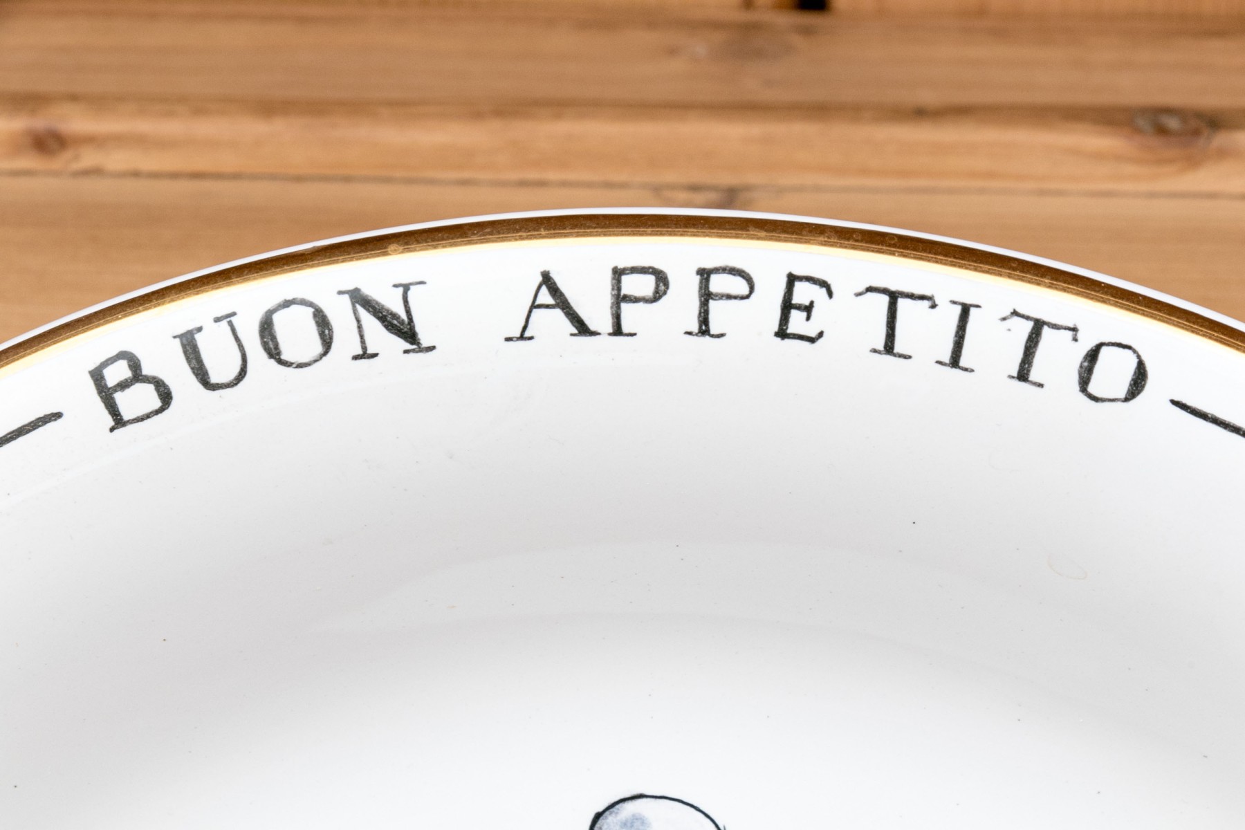 Set of ten, ample pasta plates (11 1/2" diameter), a larger serving bowl (12 1/2" diameter) and the all important cheese server (diameter 4 1/2 x 4"H). Buon appetito!