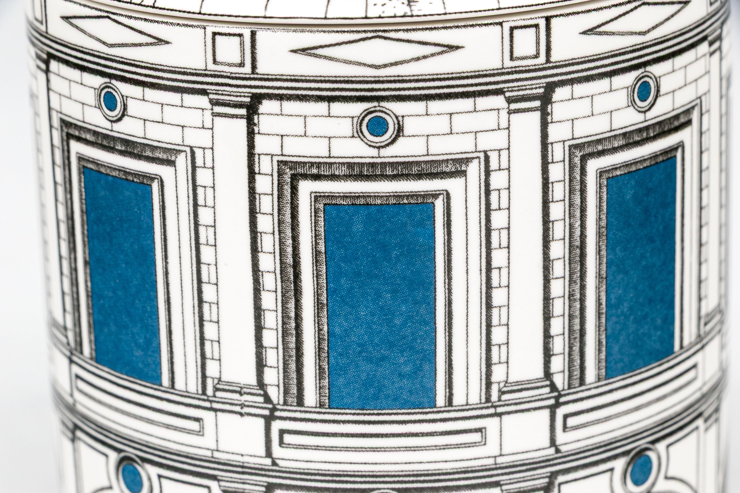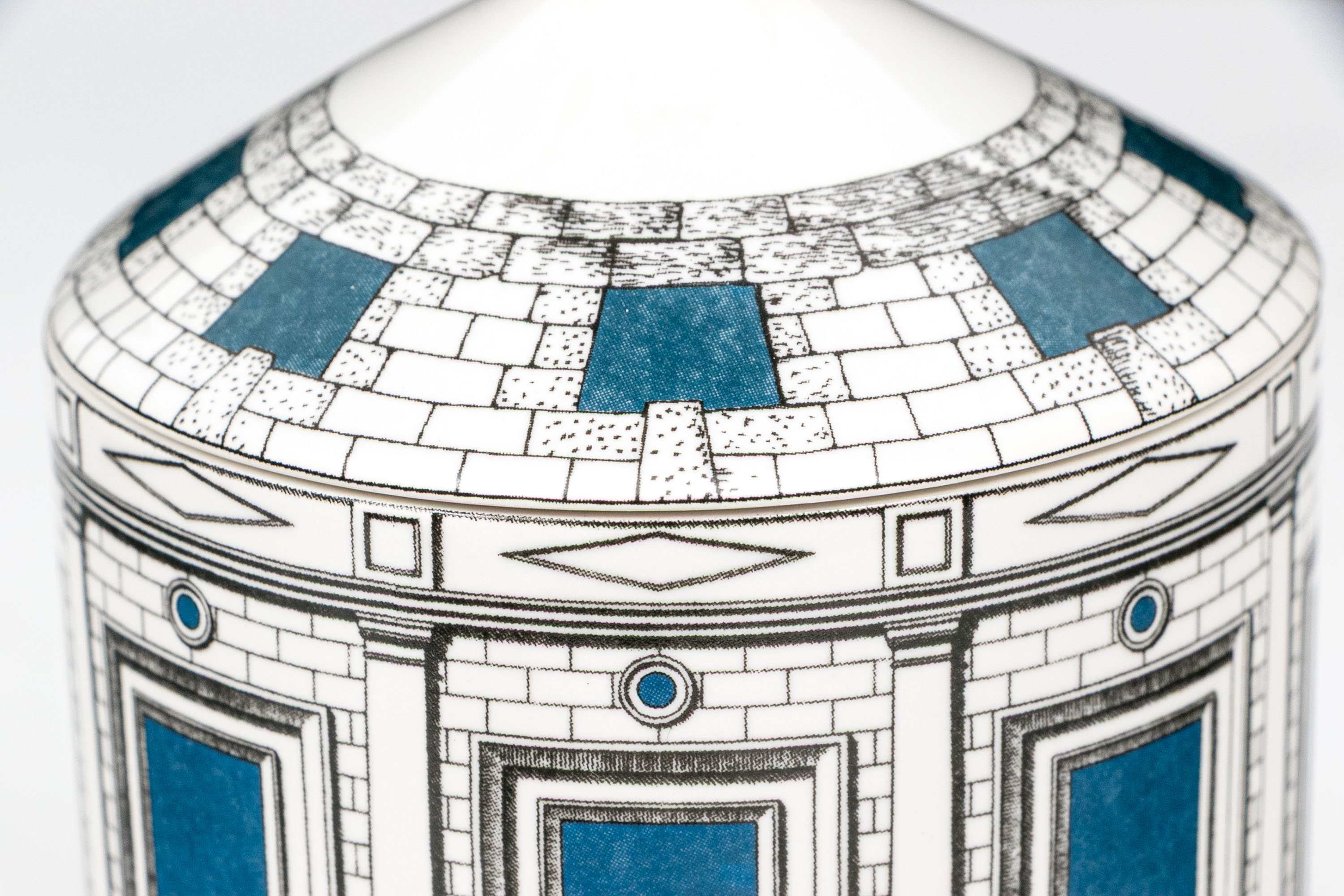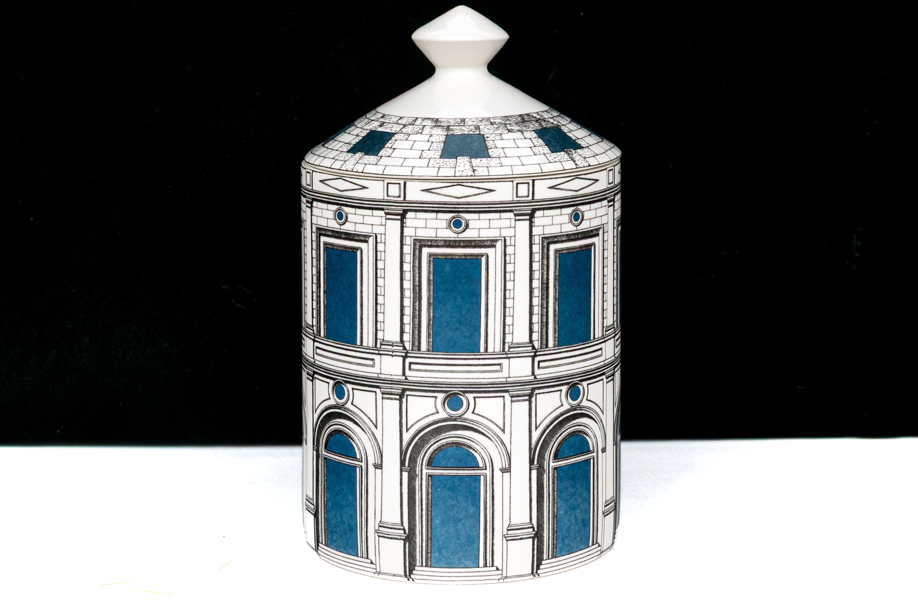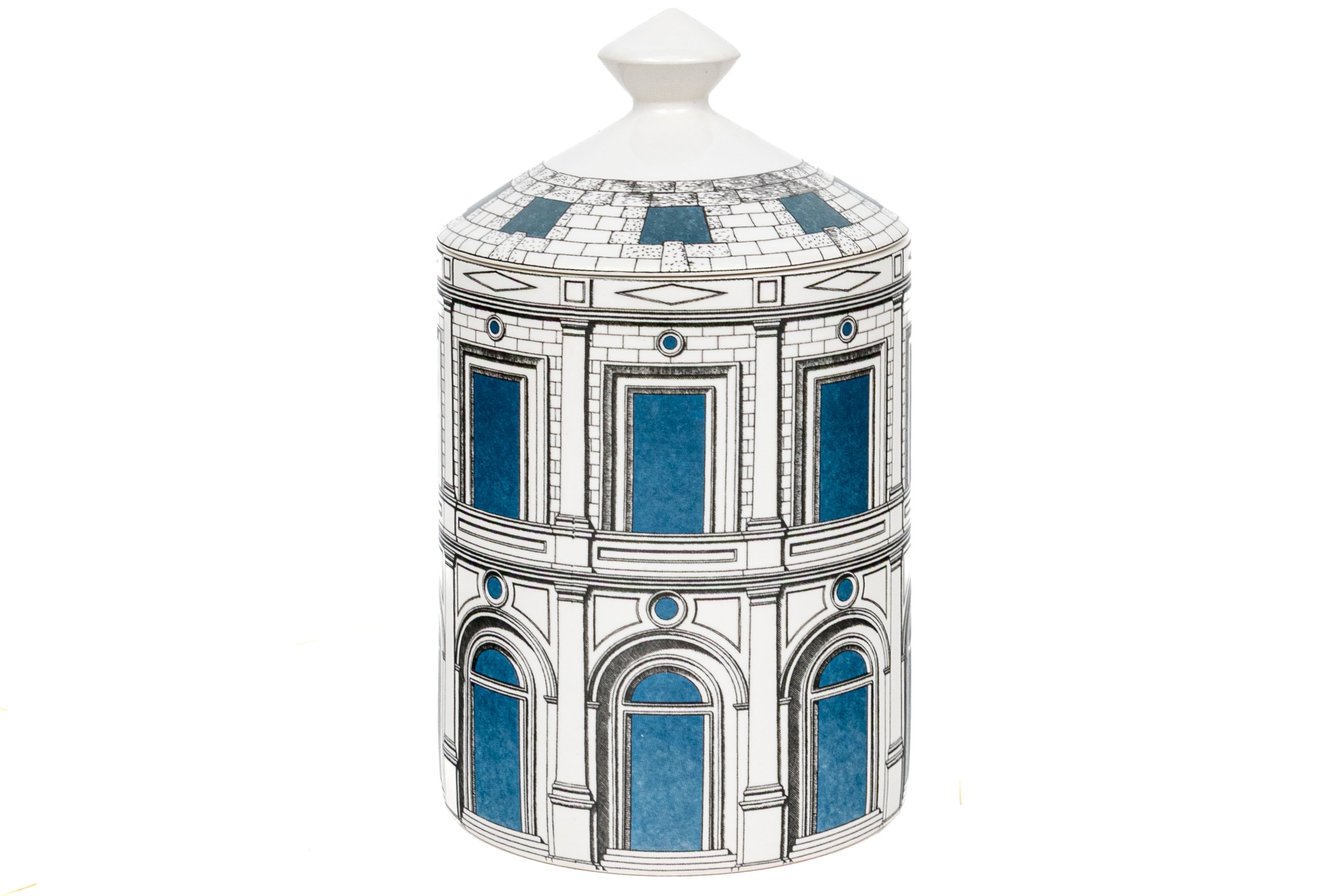 Decorative ceramic case with lid in architectural decorative motif. Lid with knob finial. Marked underfoot.
