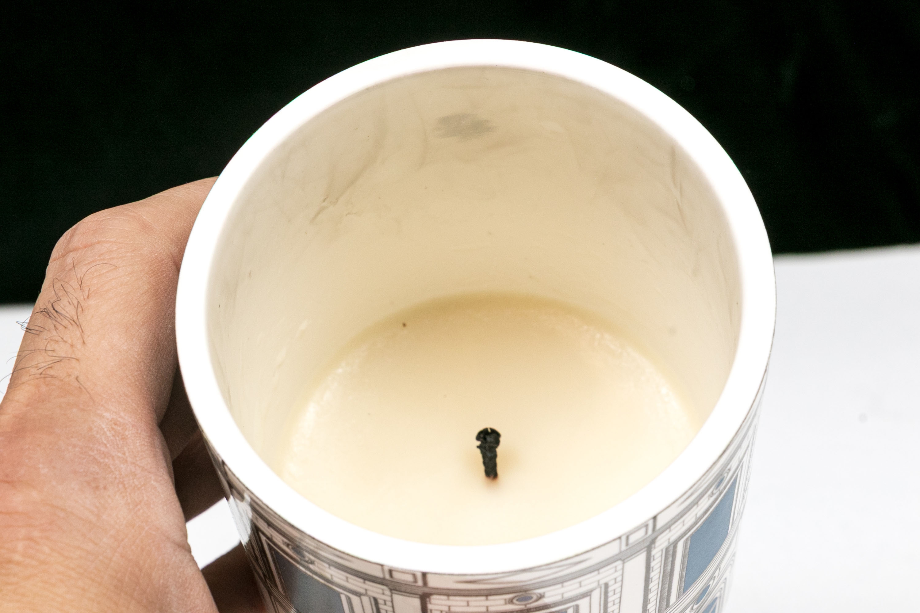 Candle has been used but still smells nice and has more left and could be re used and filled with wax of your choosing.
