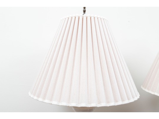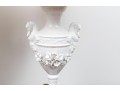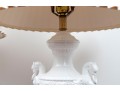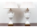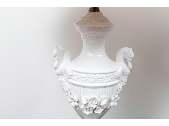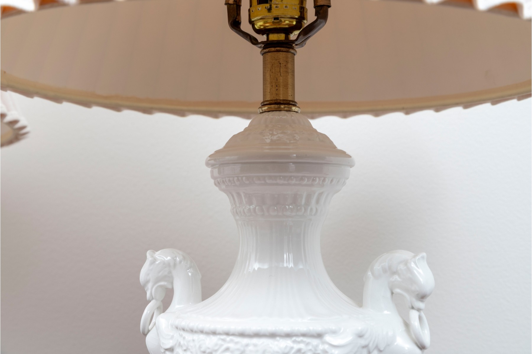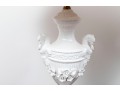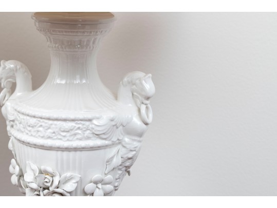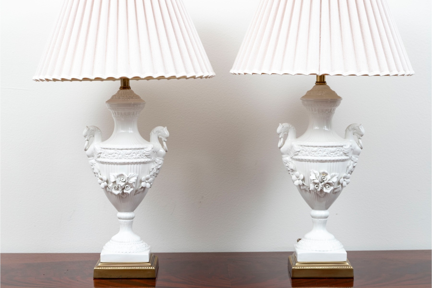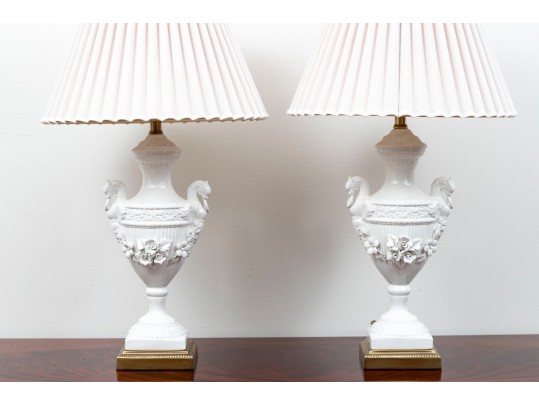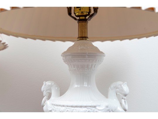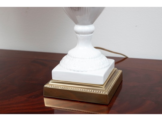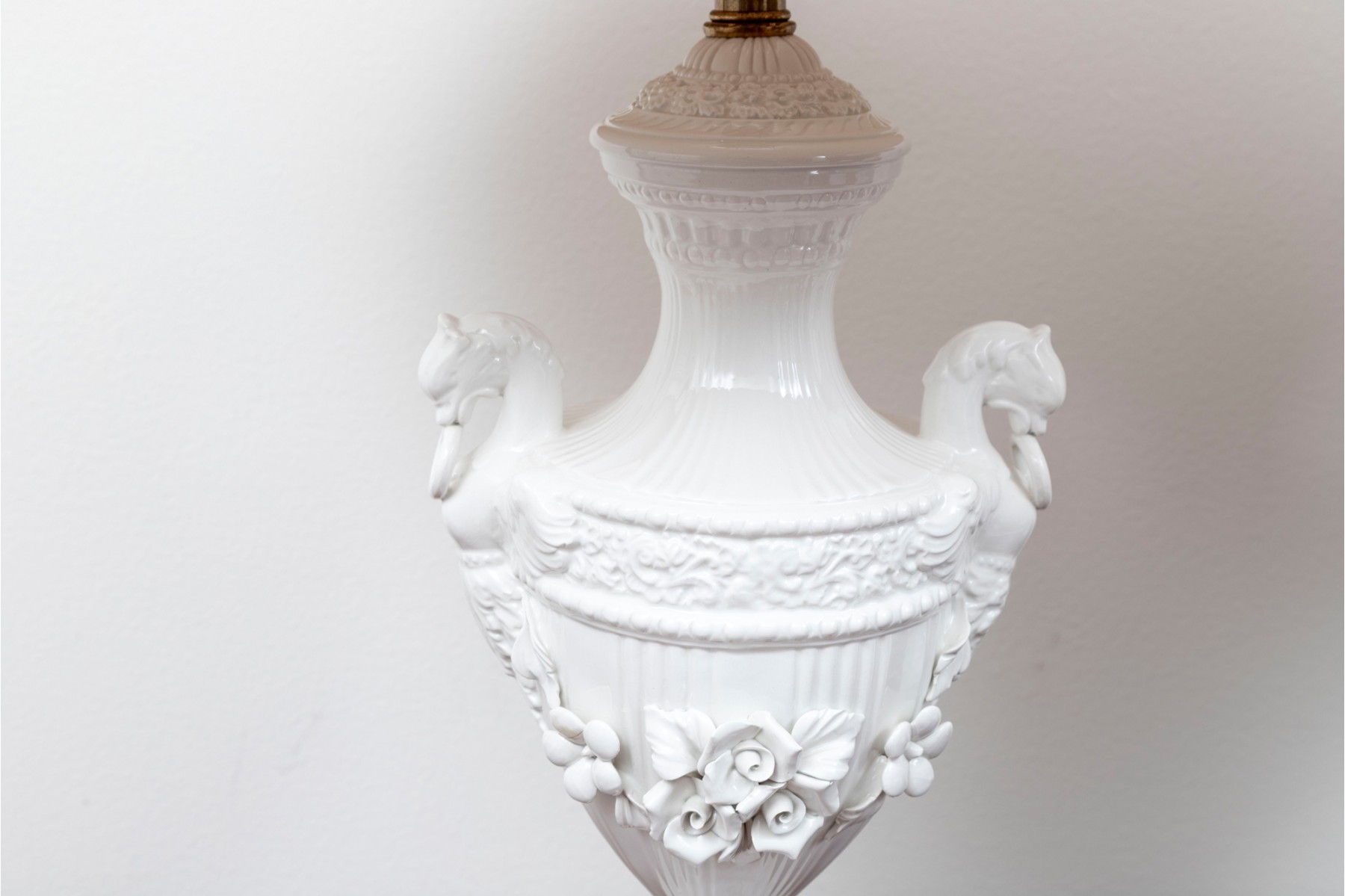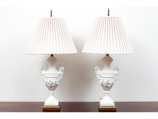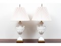 Two stunning Italian ceramic urn-form table lamps crafted from fine, white-glazed ceramic with brass mountings. Finials, harps and shades included.