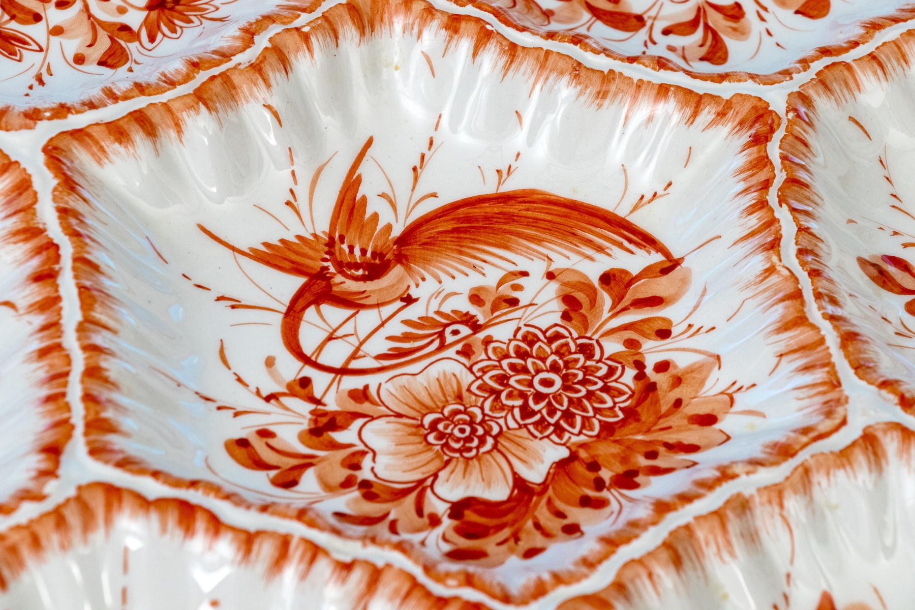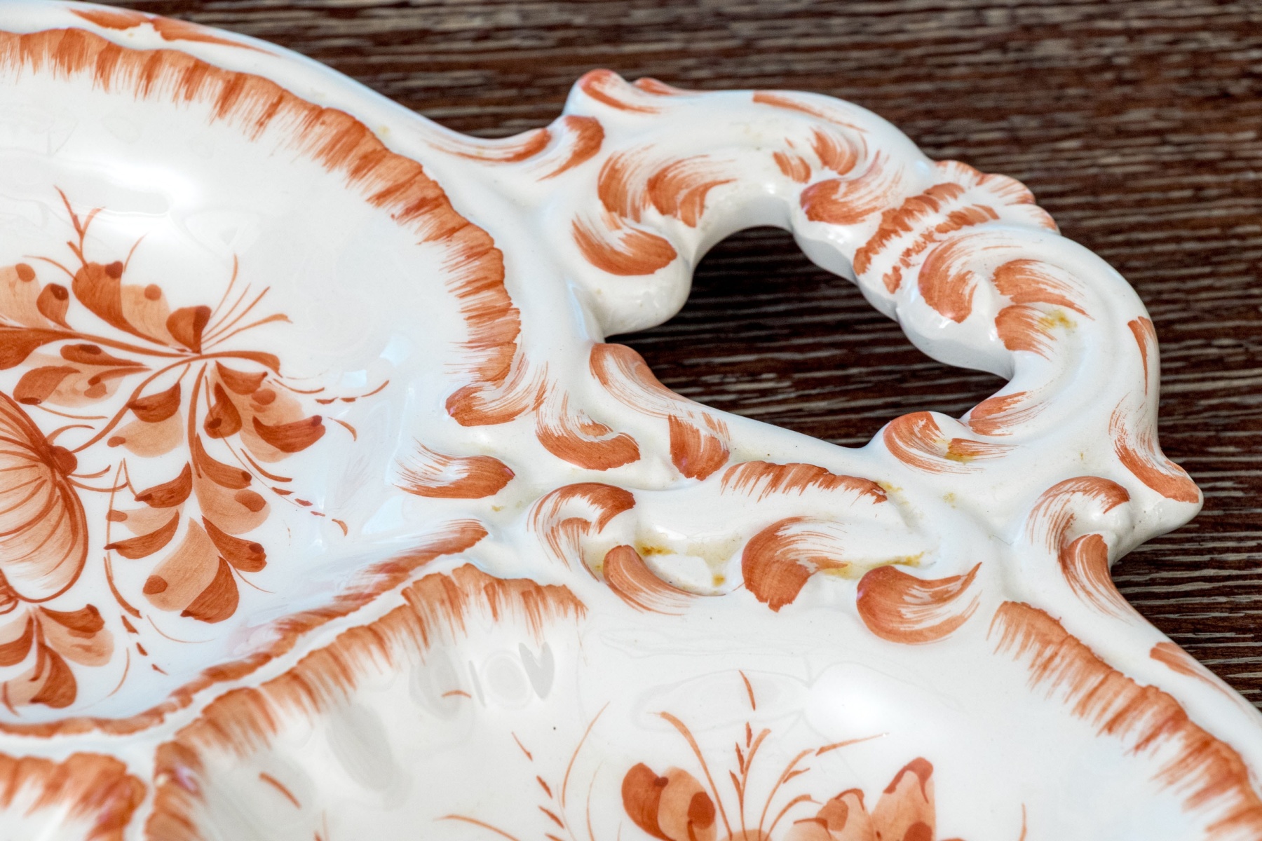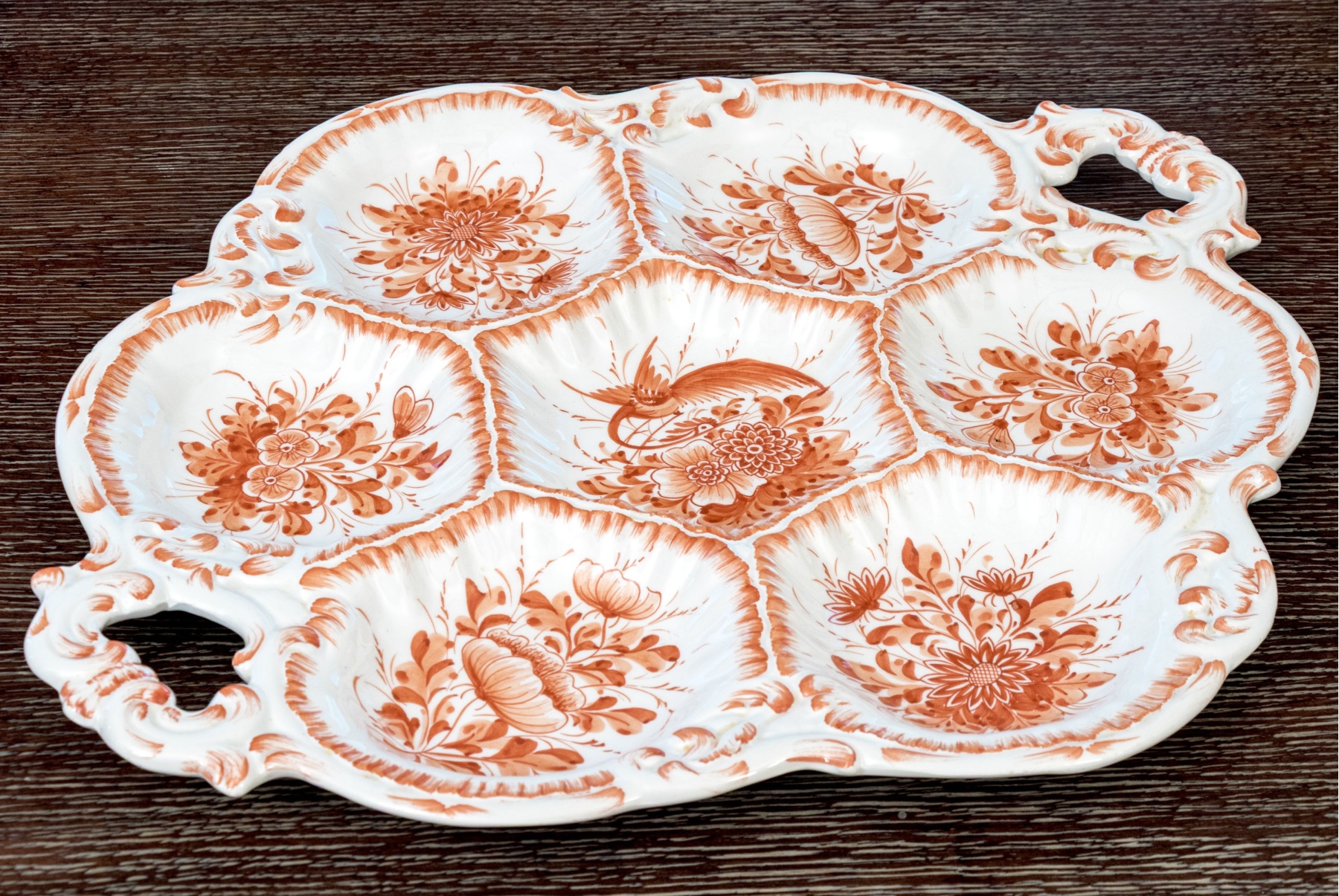 A vintage Lord & Taylor Italian hand-painted ceramic compartmentalized and twin handled serving platter. Perfect for hors d'oeuvres, the twin handled serving platter features a distinctive floral decorative motif in burnt orange tones. With seven seven depressed bowls for serving, the serving tray is perfect for appetizers or hors d'oeuvres.