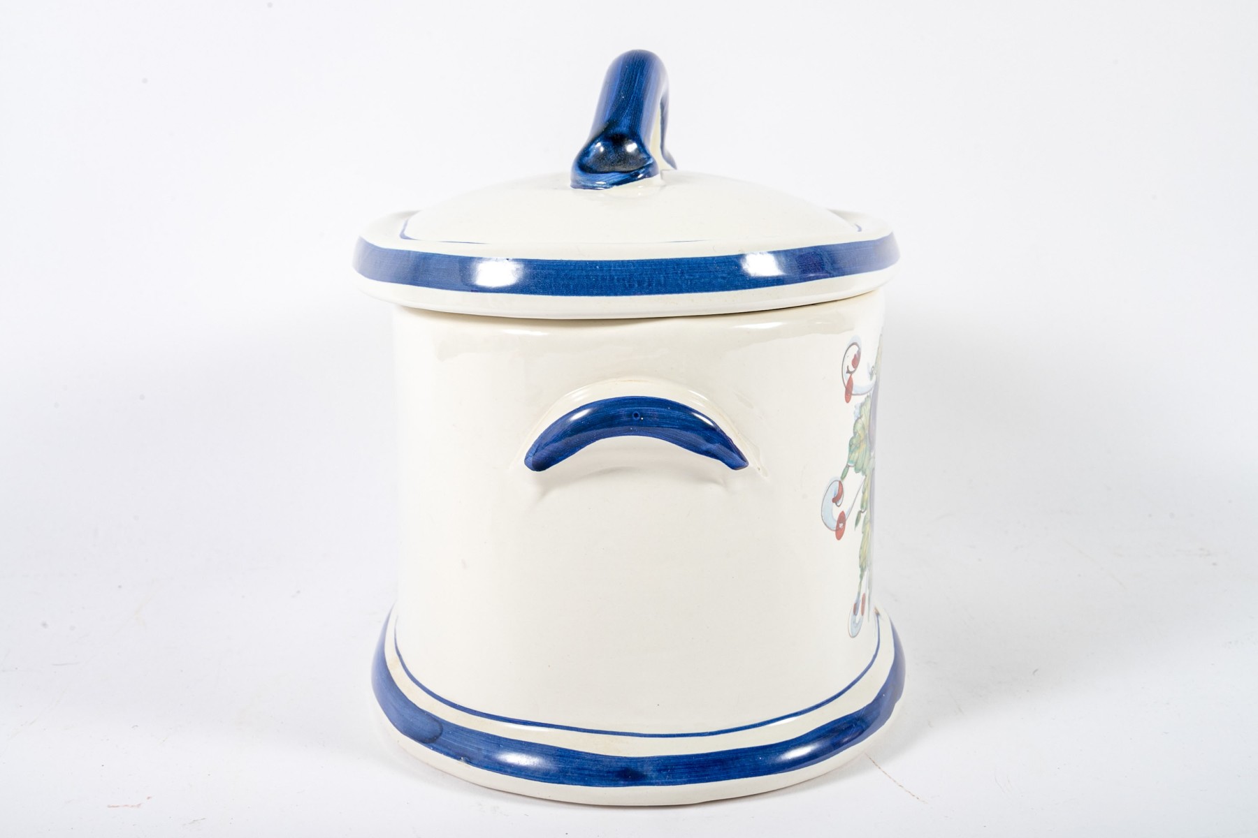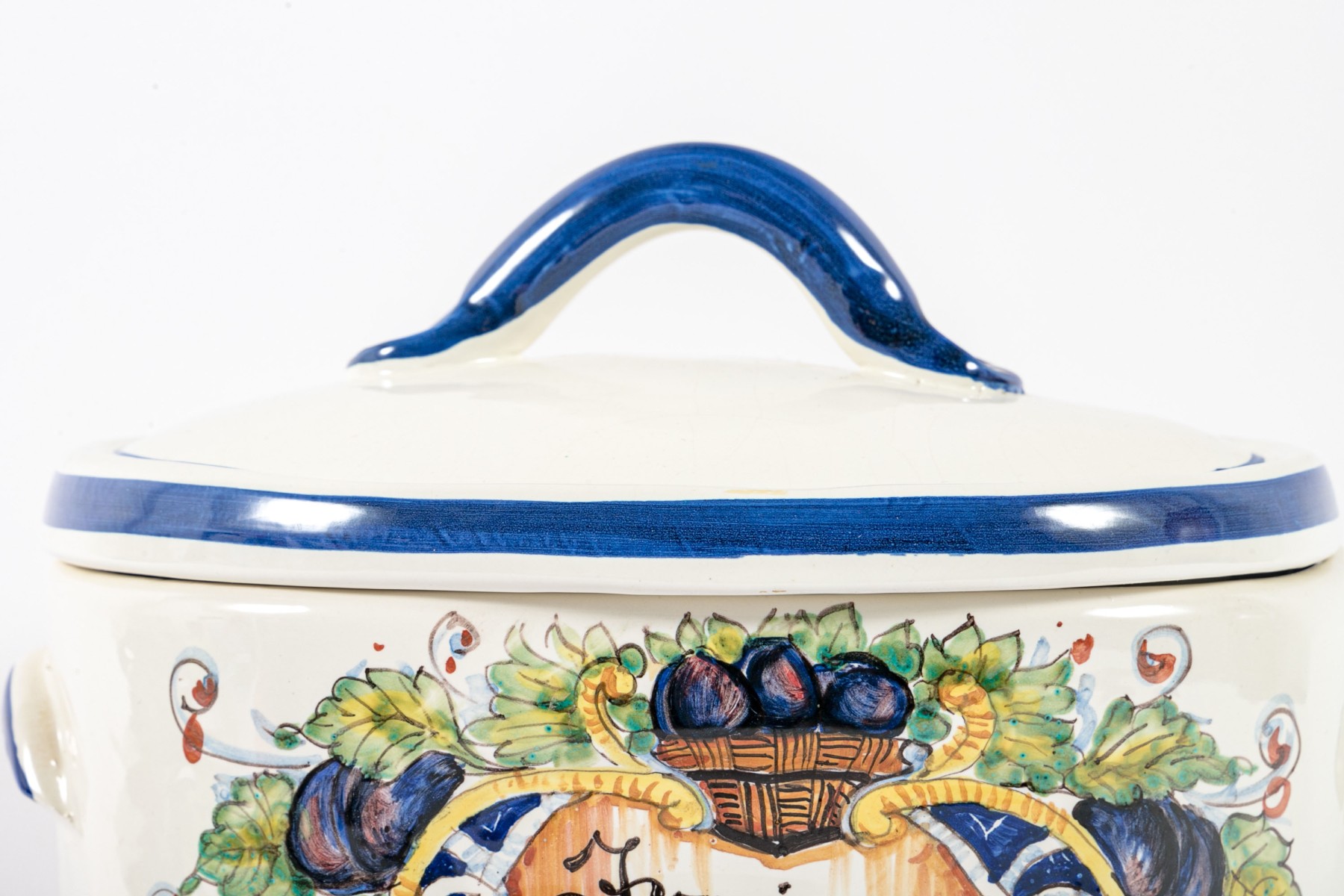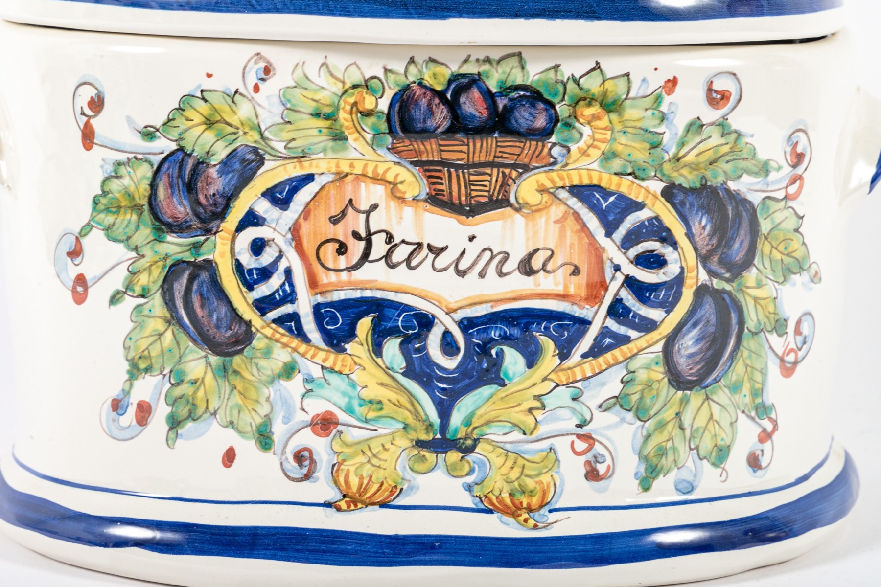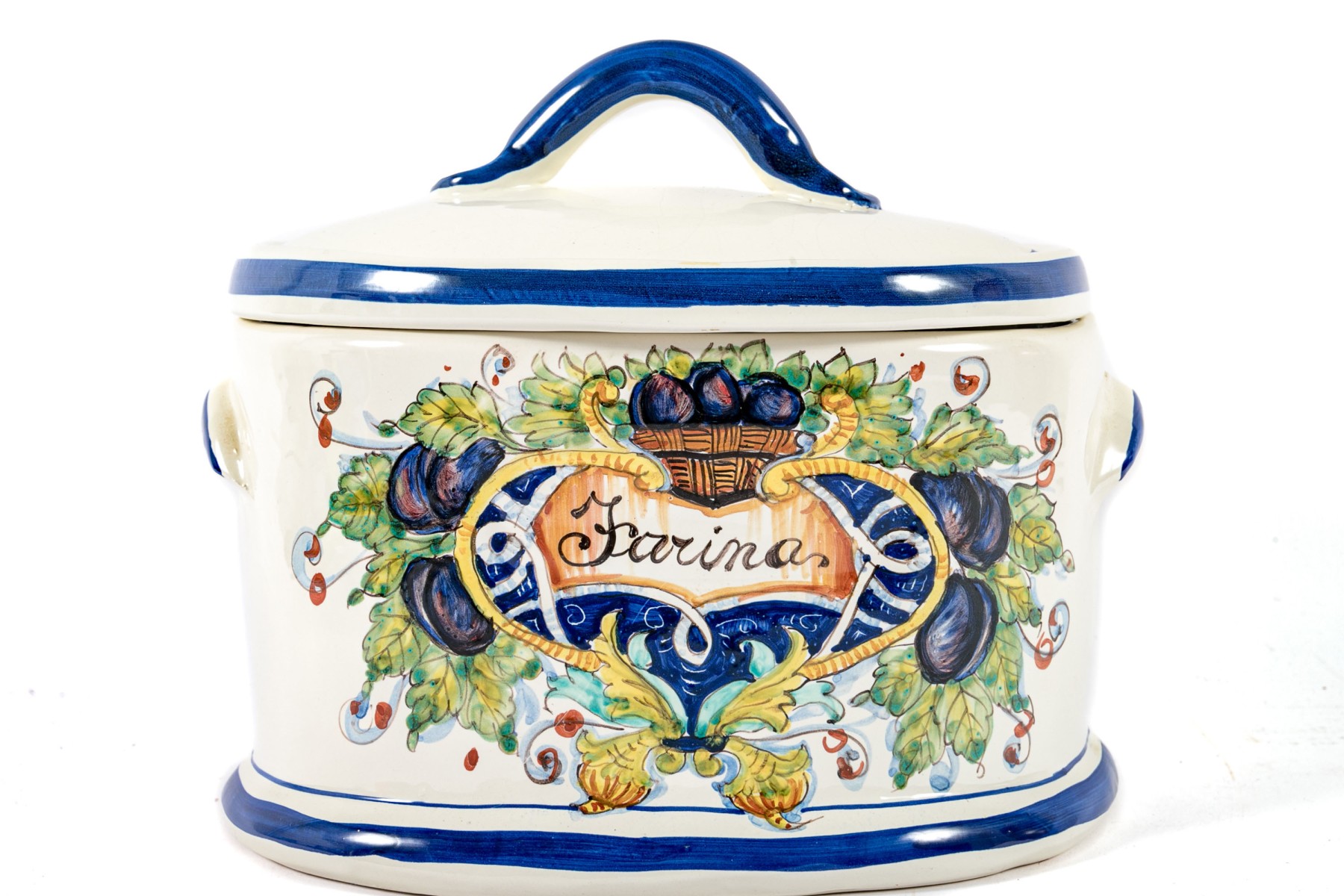 A fabulous Italian ceramic canister for flour, displaying a white, oval form with stout bracket handles at the sides and a high-arching handle on the lid. Hand-detailed with a majolica styled scene of fruit and foliage around a central "Farina" label. Hand-marked Italy on the underside.
