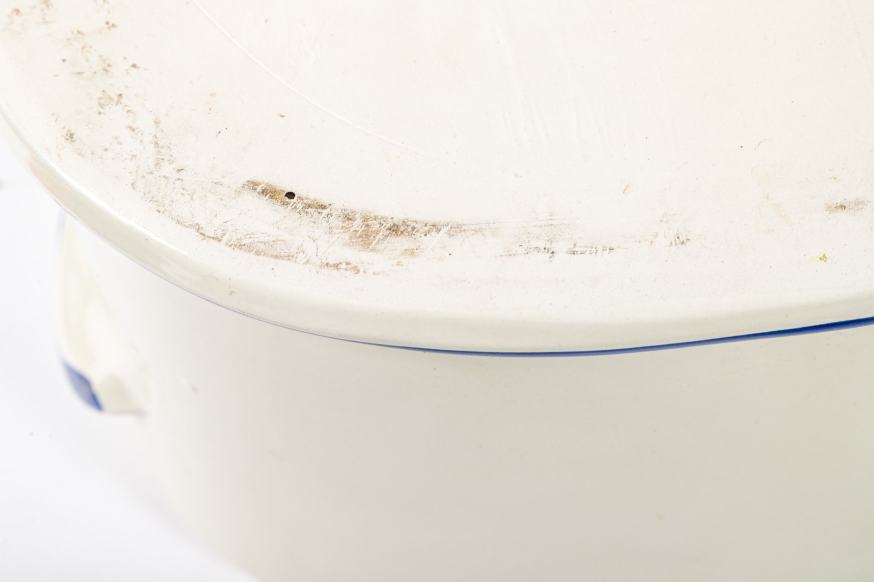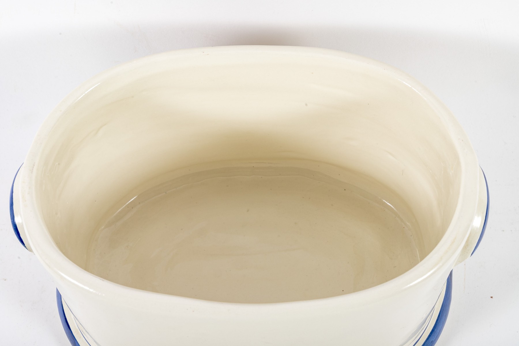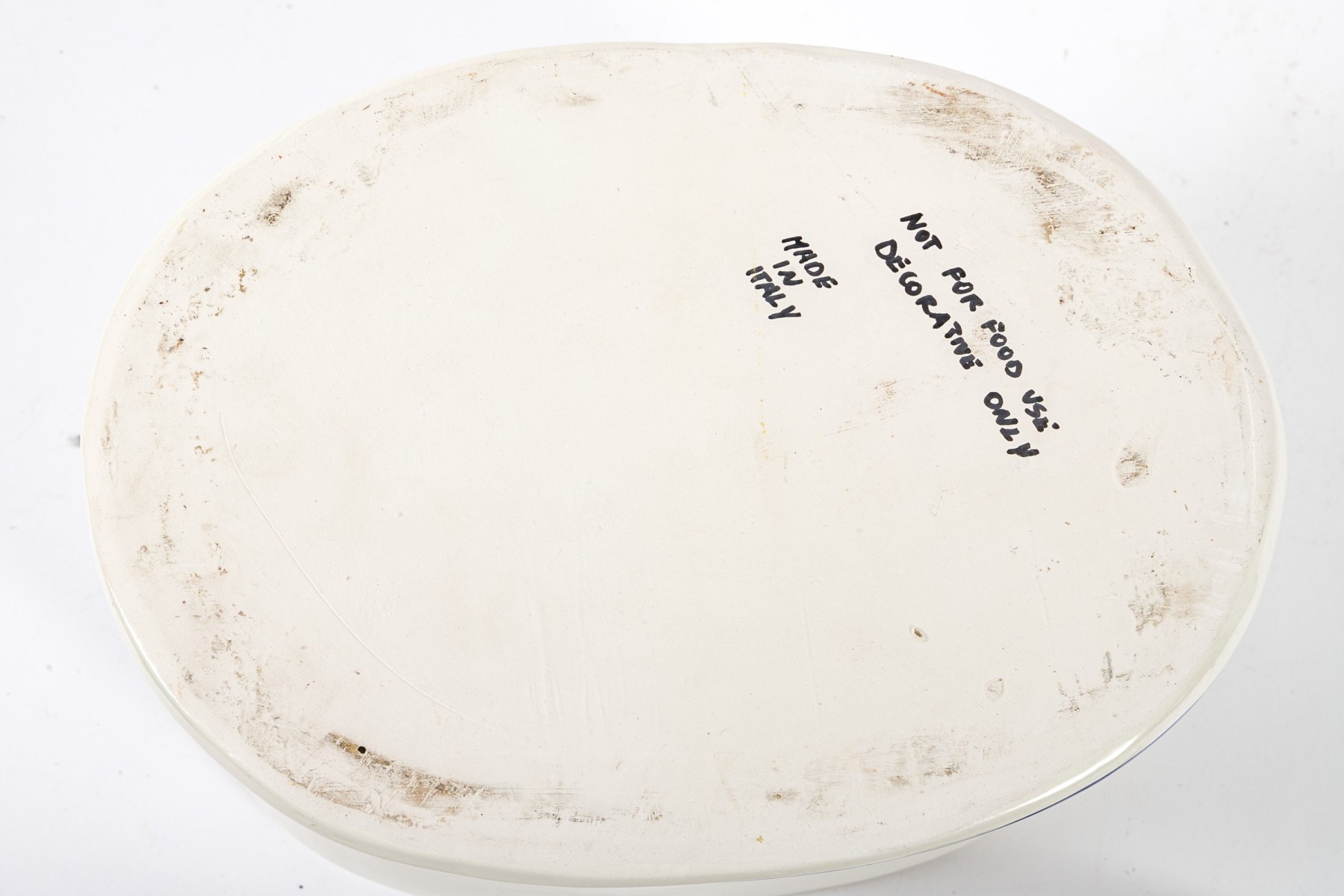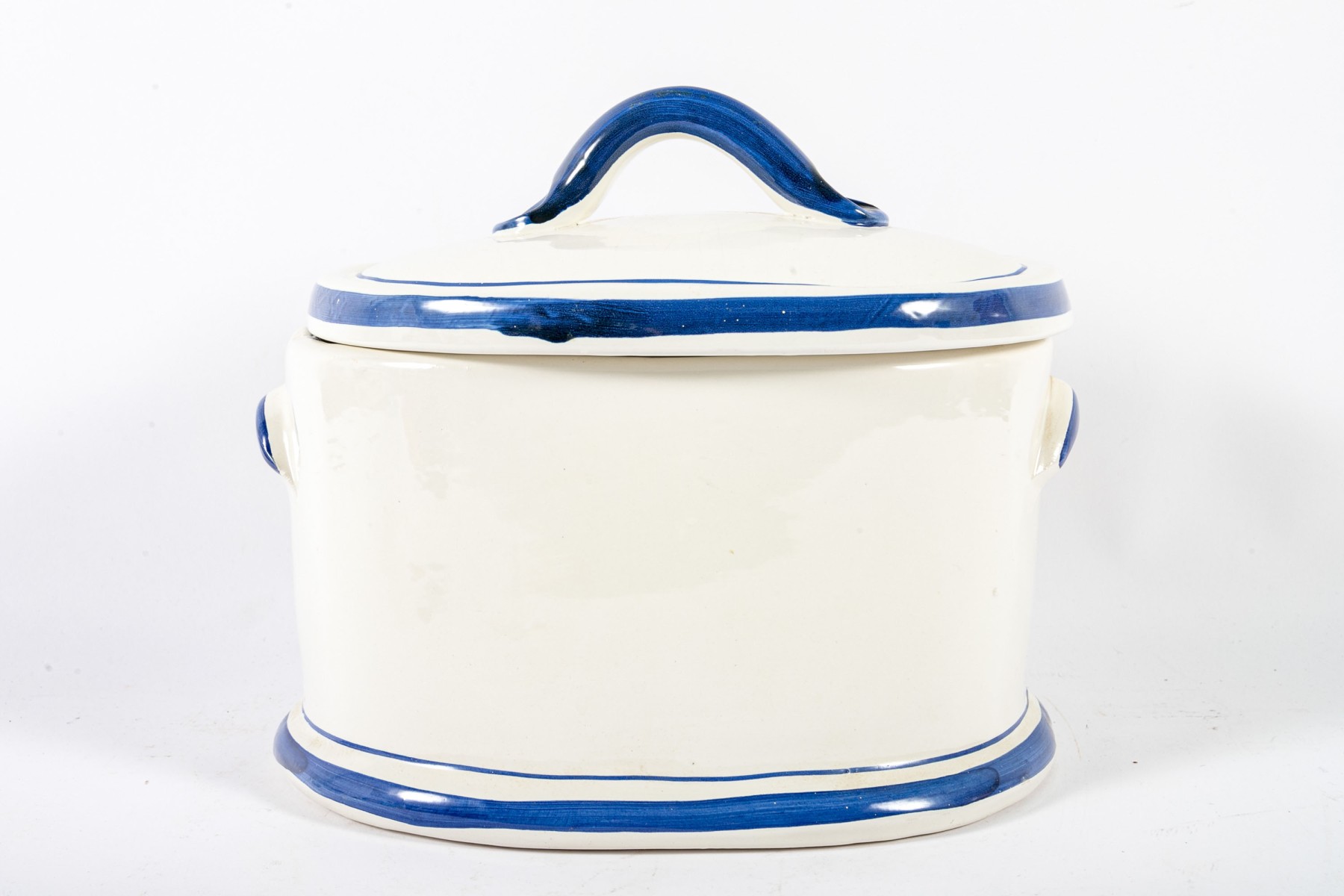 A fabulous Italian ceramic canister for flour, displaying a white, oval form with stout bracket handles at the sides and a high-arching handle on the lid. Hand-detailed with a majolica styled scene of fruit and foliage around a central "Farina" label. Hand-marked Italy on the underside.
