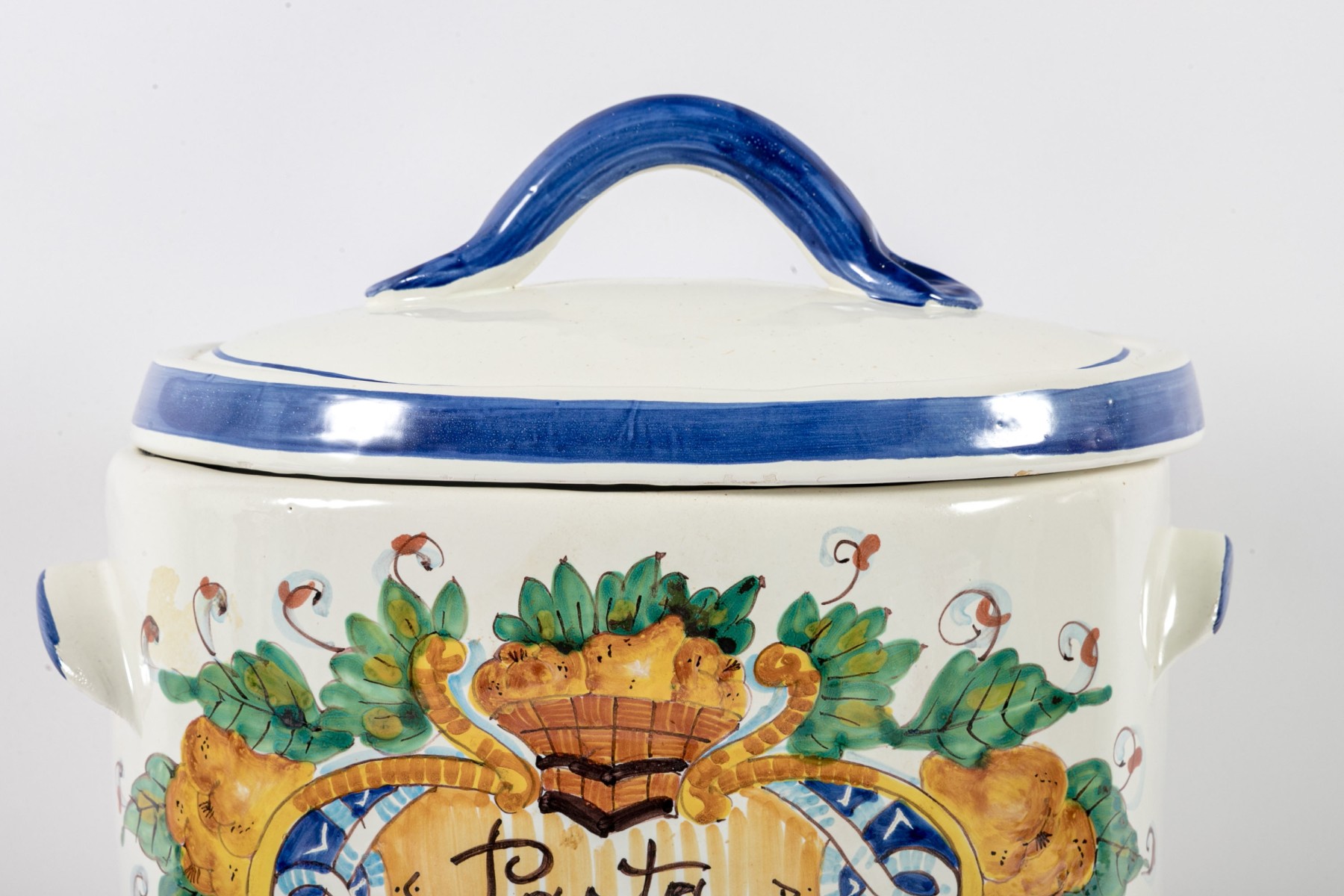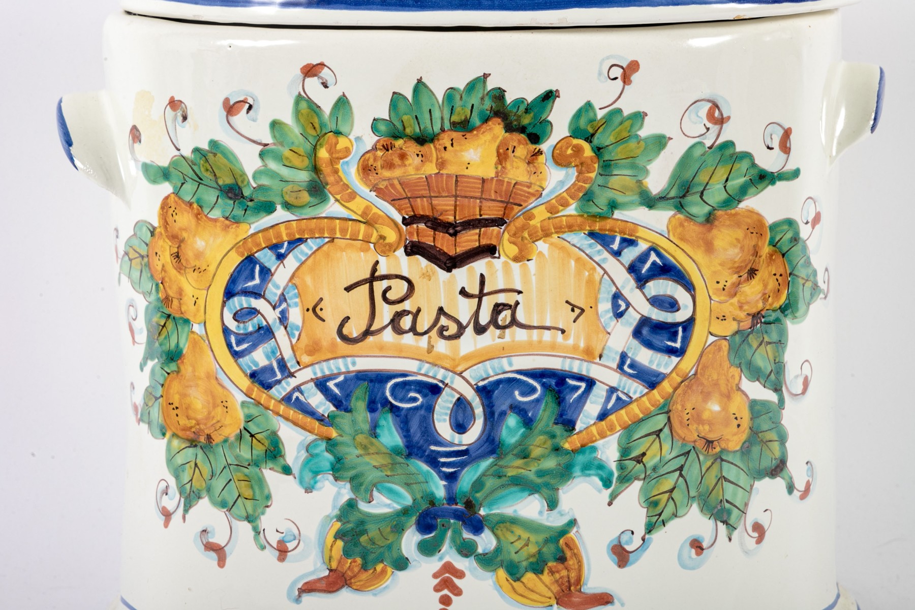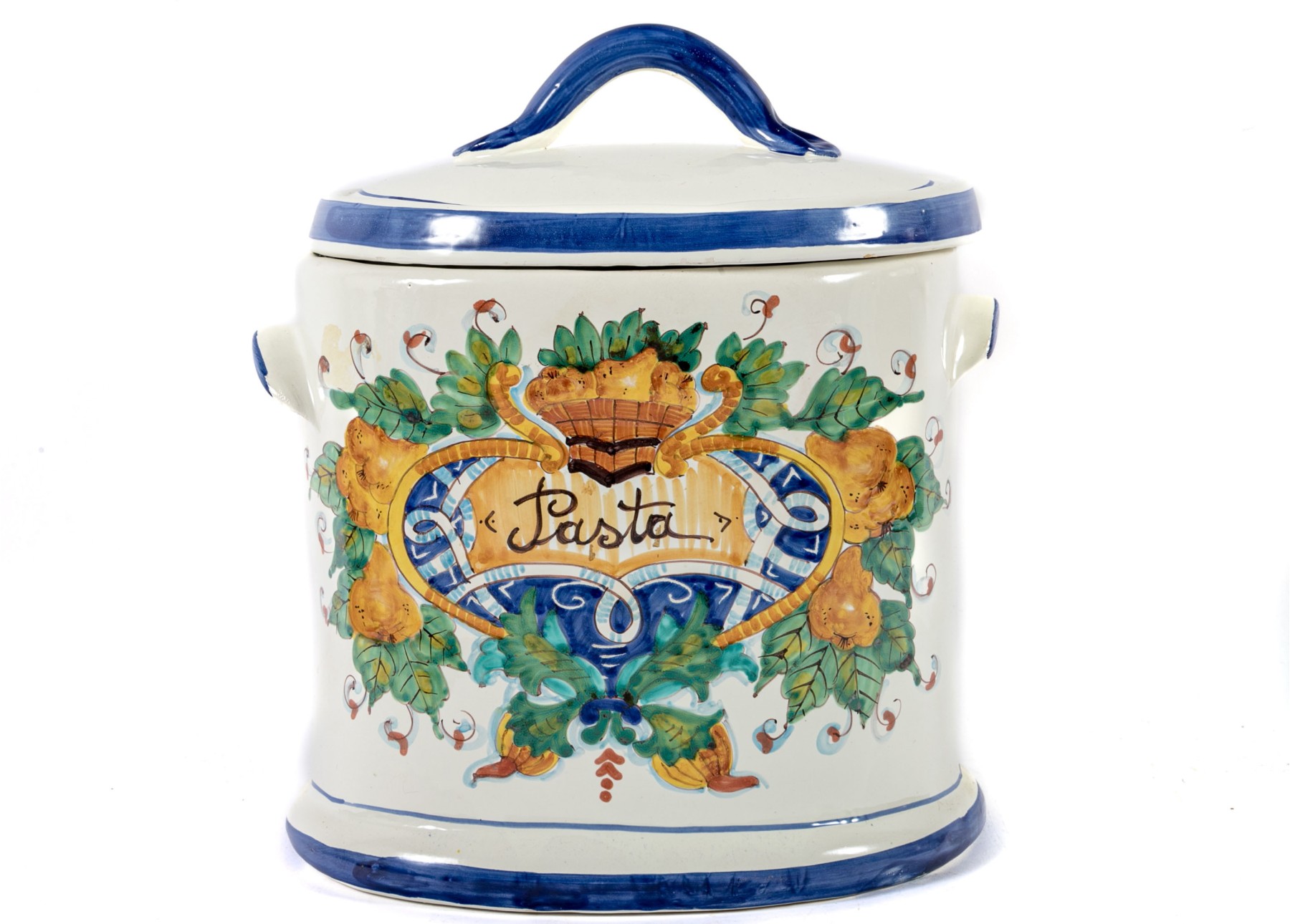 A fabulous Italian ceramic canister for pasta, displaying a tall, white, oval form with stout bracket handles at the sides and a high-arching handle on the lid. Hand-detailed with a majolica styled scene of fruit and foliage around a central "Pasta" label. Hand-marked Italy on the underside.