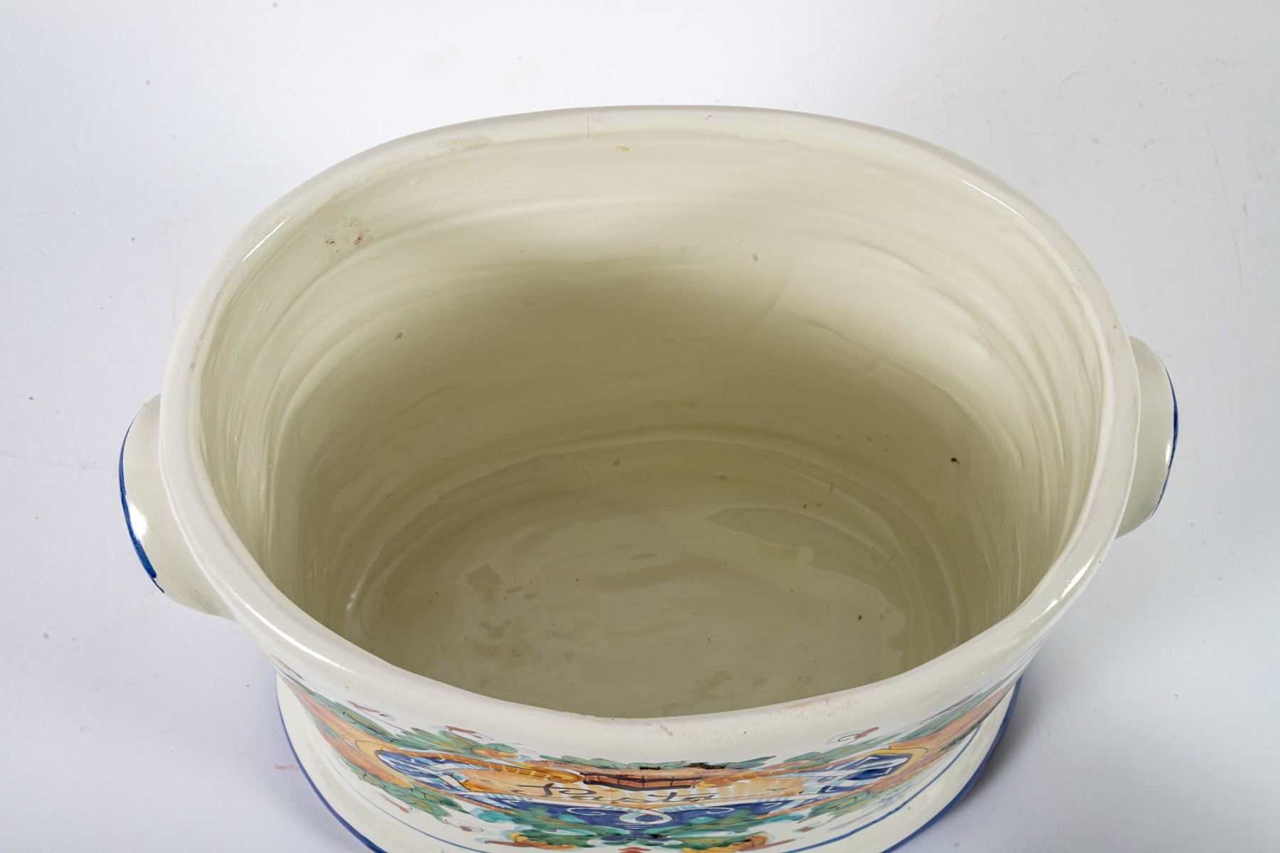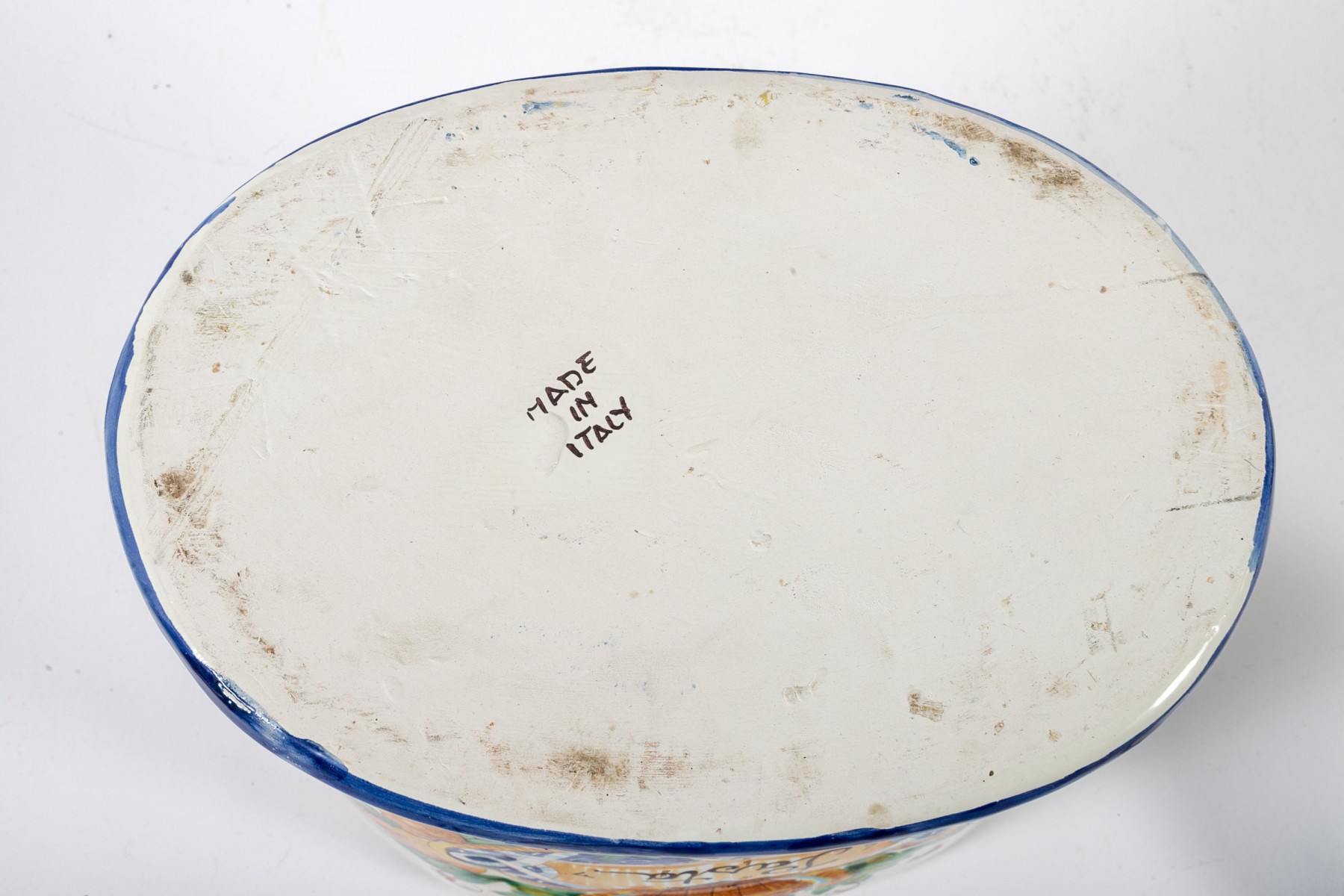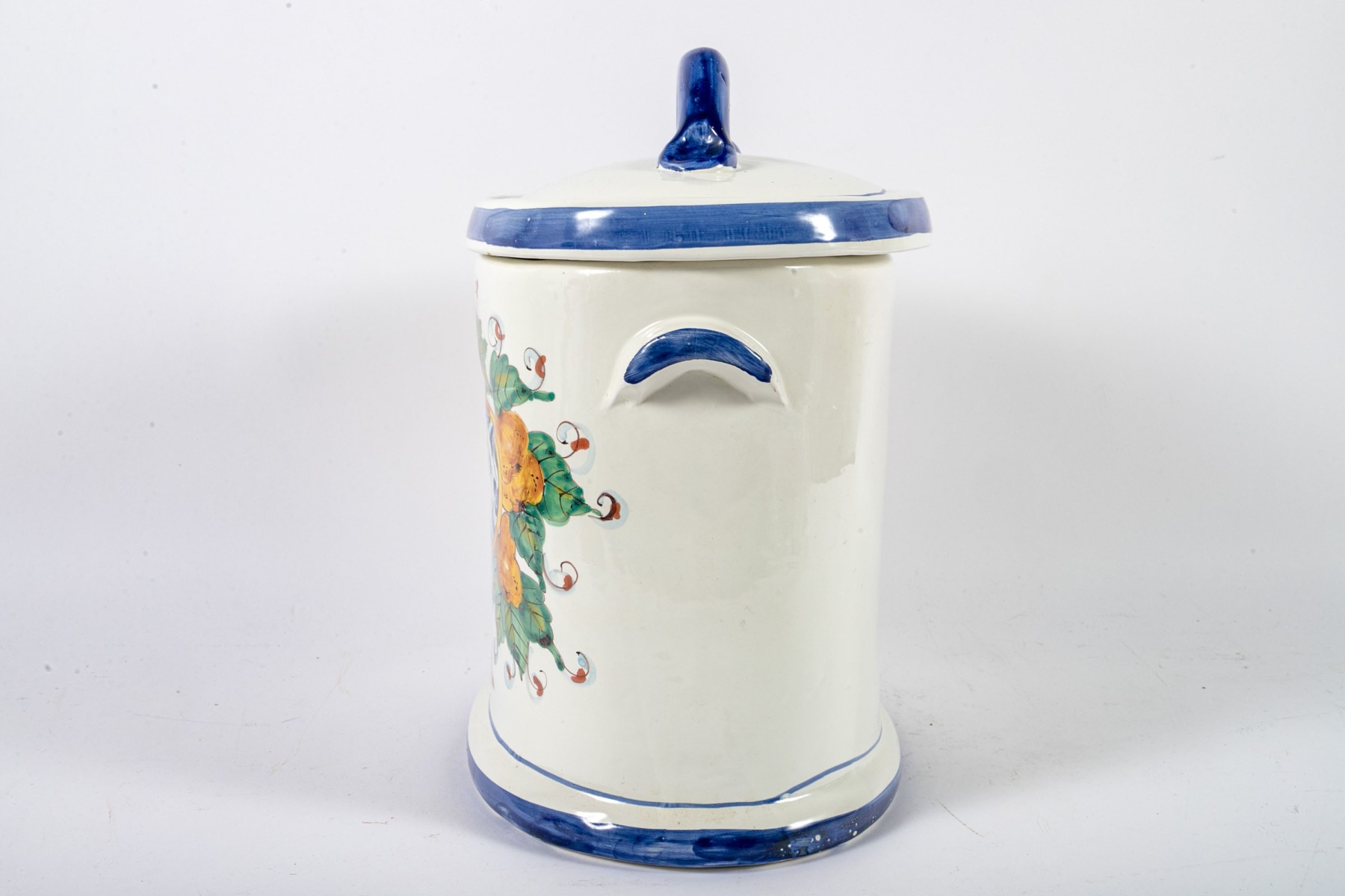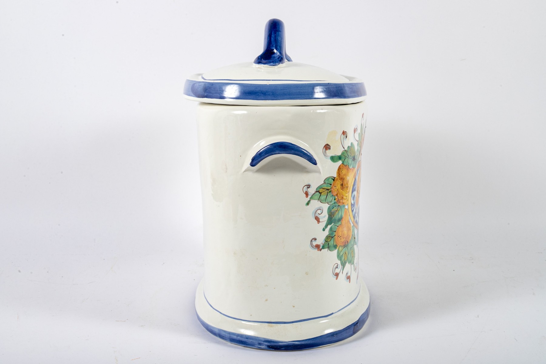 A fabulous Italian ceramic canister for pasta, displaying a tall, white, oval form with stout bracket handles at the sides and a high-arching handle on the lid. Hand-detailed with a majolica styled scene of fruit and foliage around a central "Pasta" label. Hand-marked Italy on the underside.