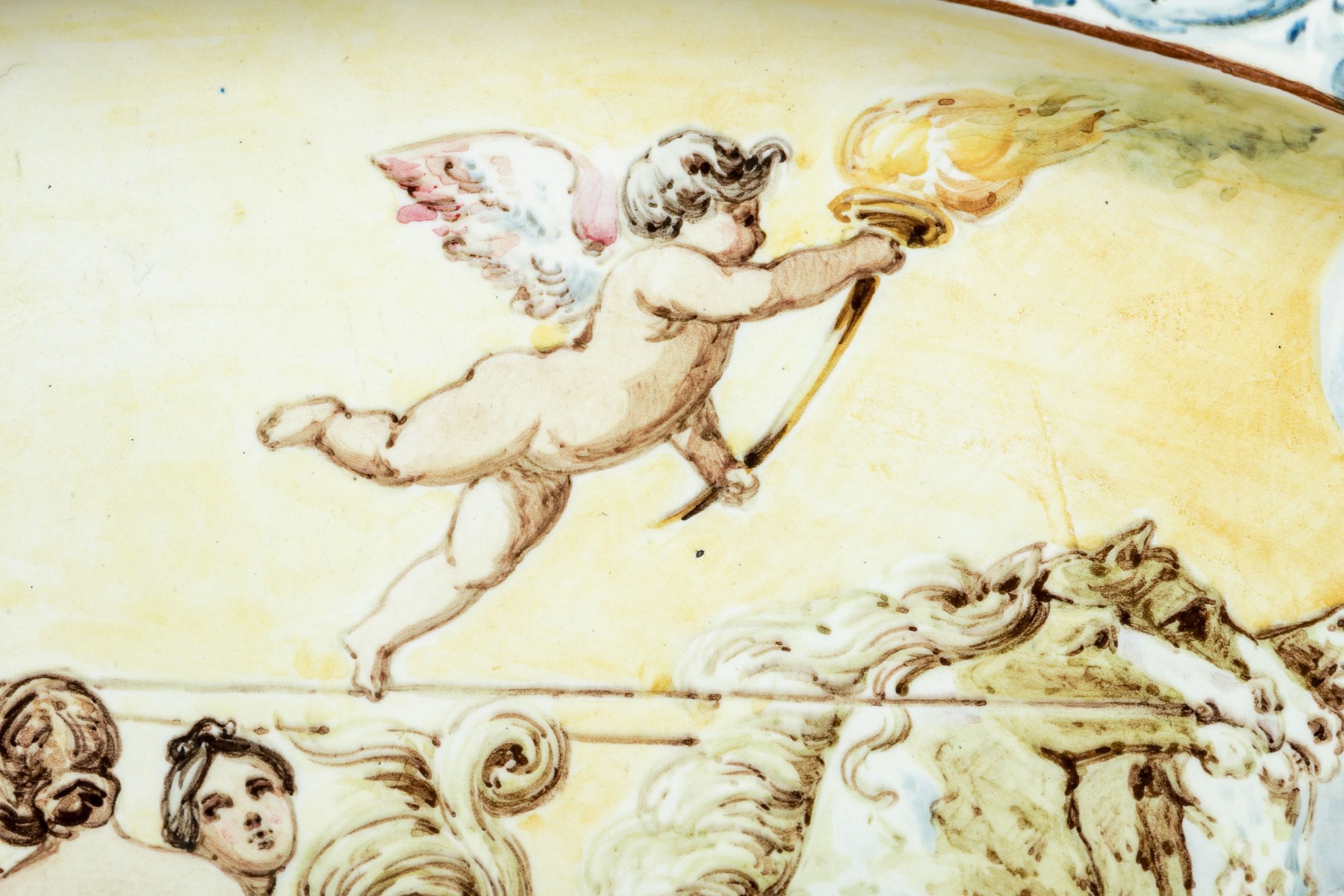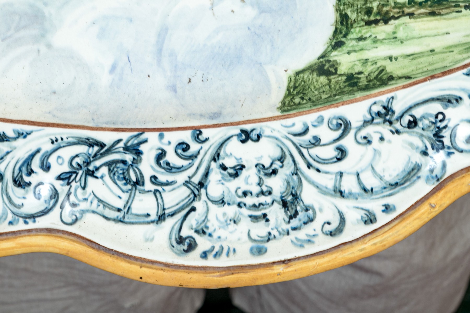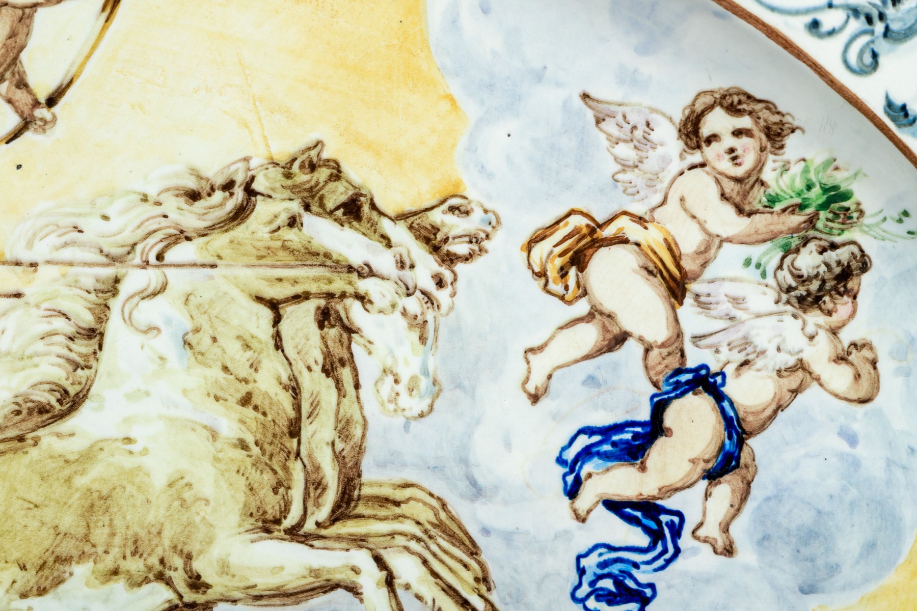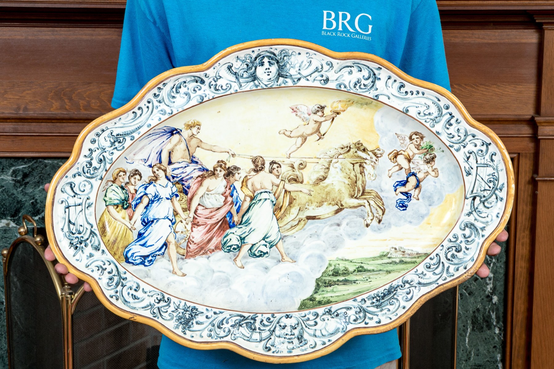 Italian Majolica scalloped oval charger featuring an allegorical motif, portraying a celestial scene with a horse-drawn chariot in the heavens.