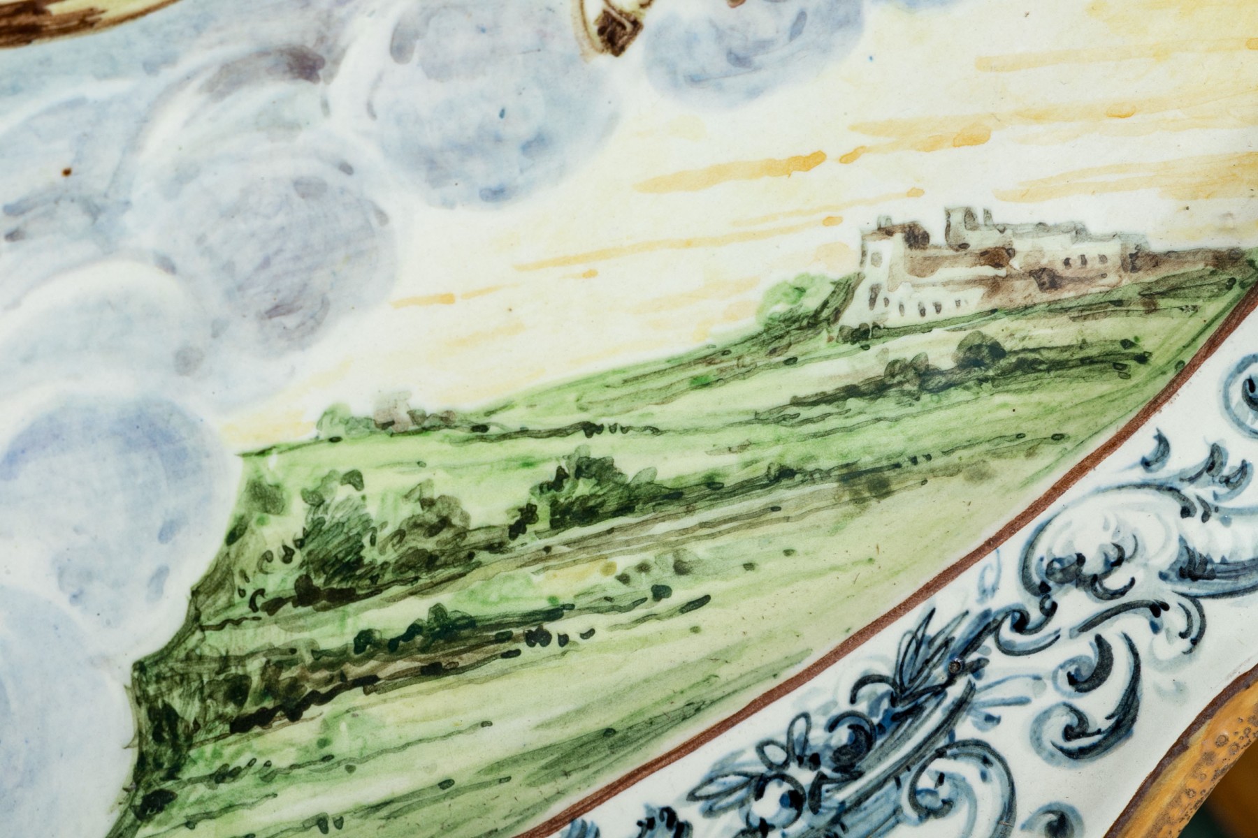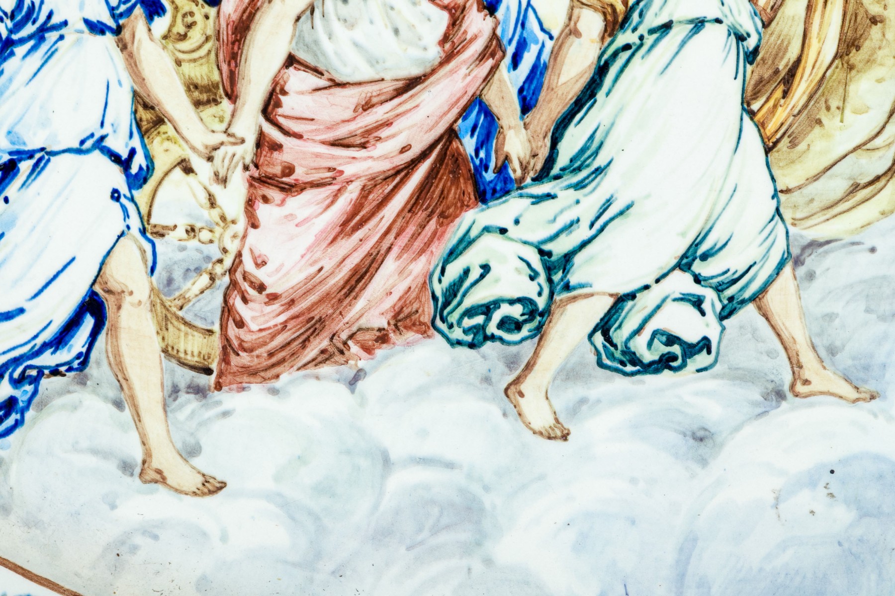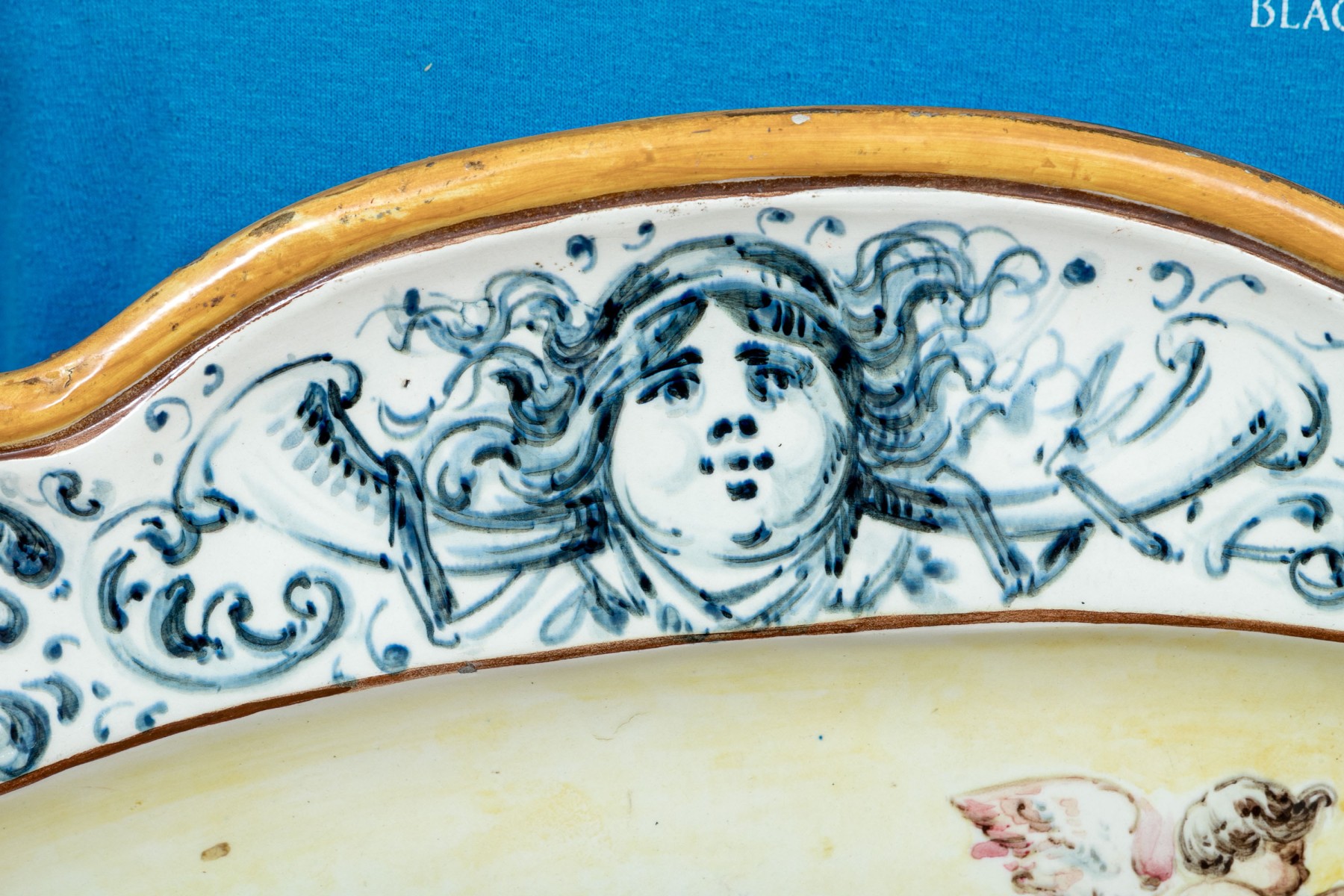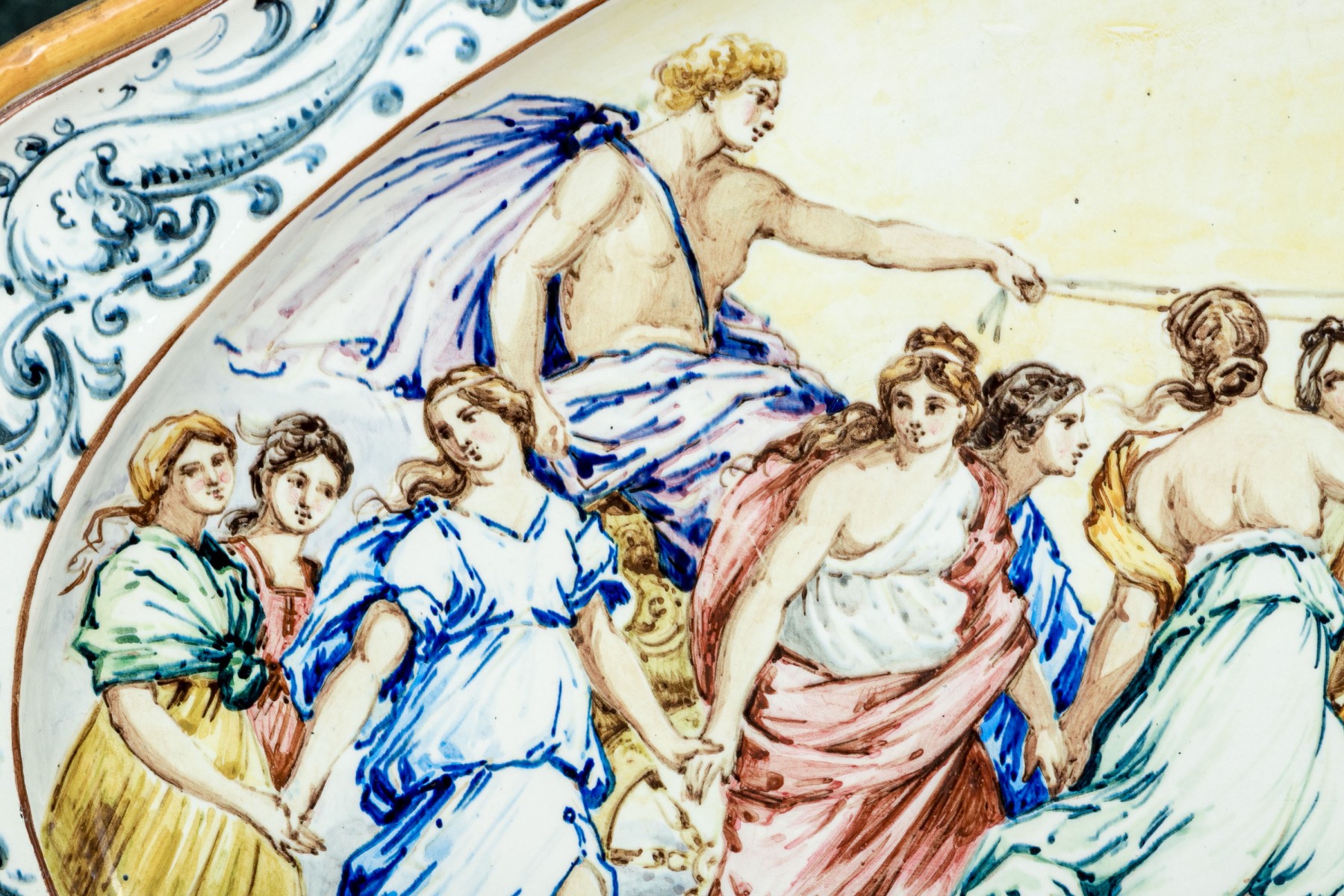 Italian Majolica scalloped oval charger featuring an allegorical motif, portraying a celestial scene with a horse-drawn chariot in the heavens.