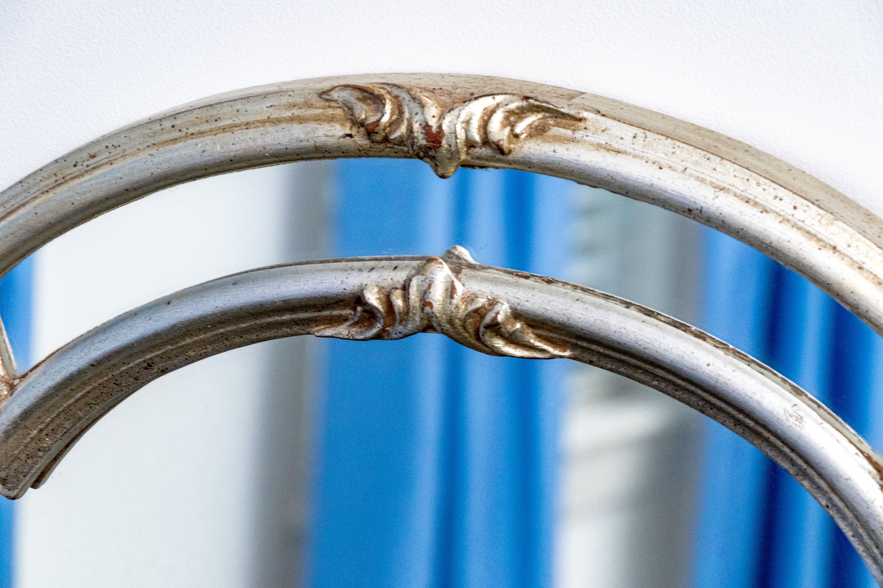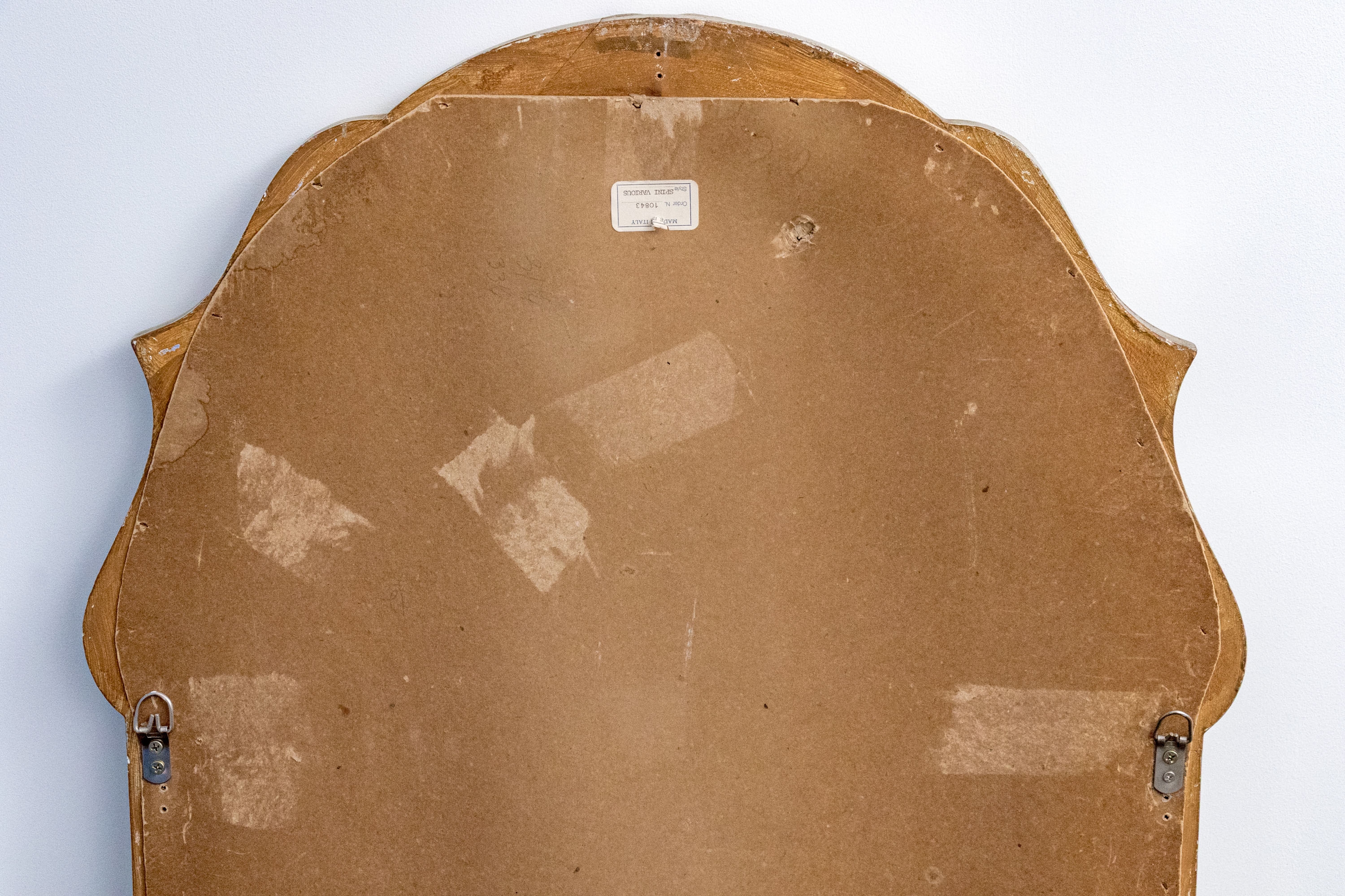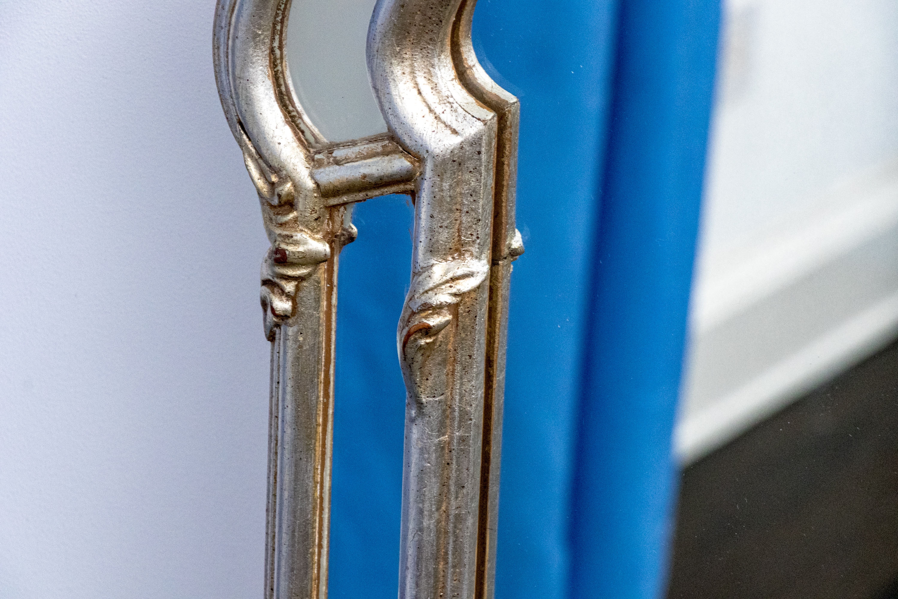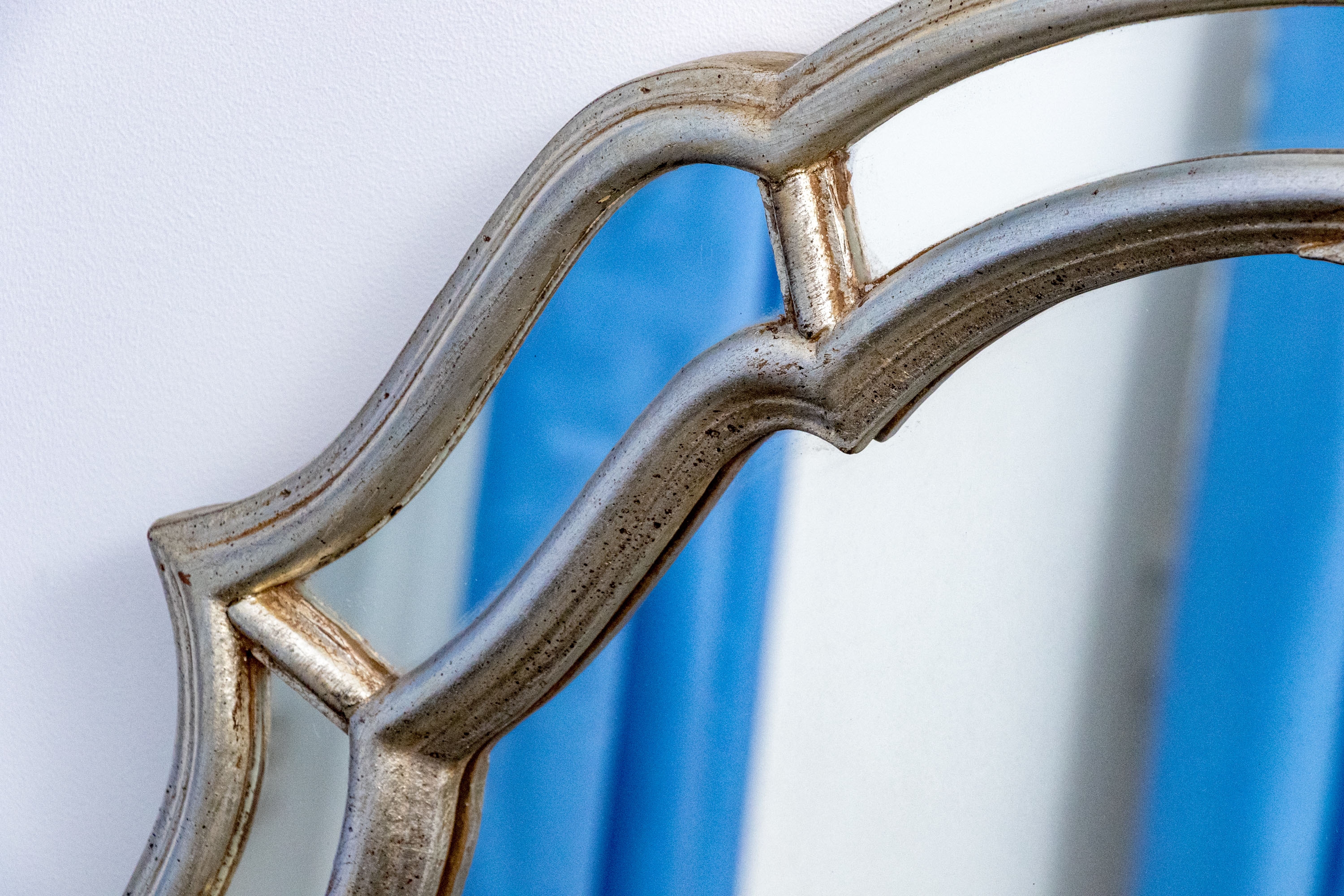 A beautifully designed Italian "Spini Various" mirror with an elegant, arched form surrounded by a mirror paneled border in a silvered wood frame with pretty foliate flourishes in relief around the curves.