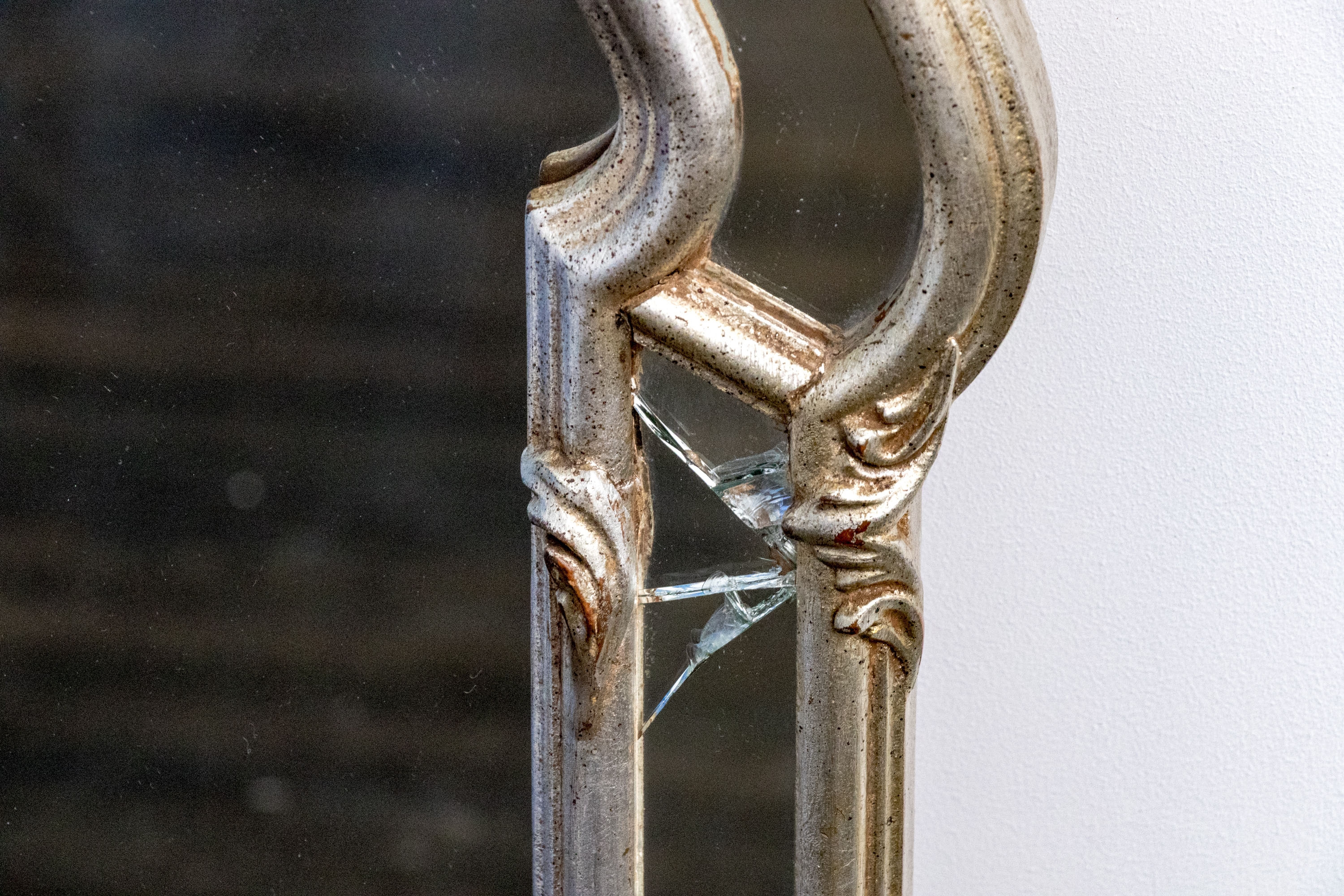 There is a crack to the tall mirrored panel on the right side of the frame, but overall the mirror still presents well as a whole.