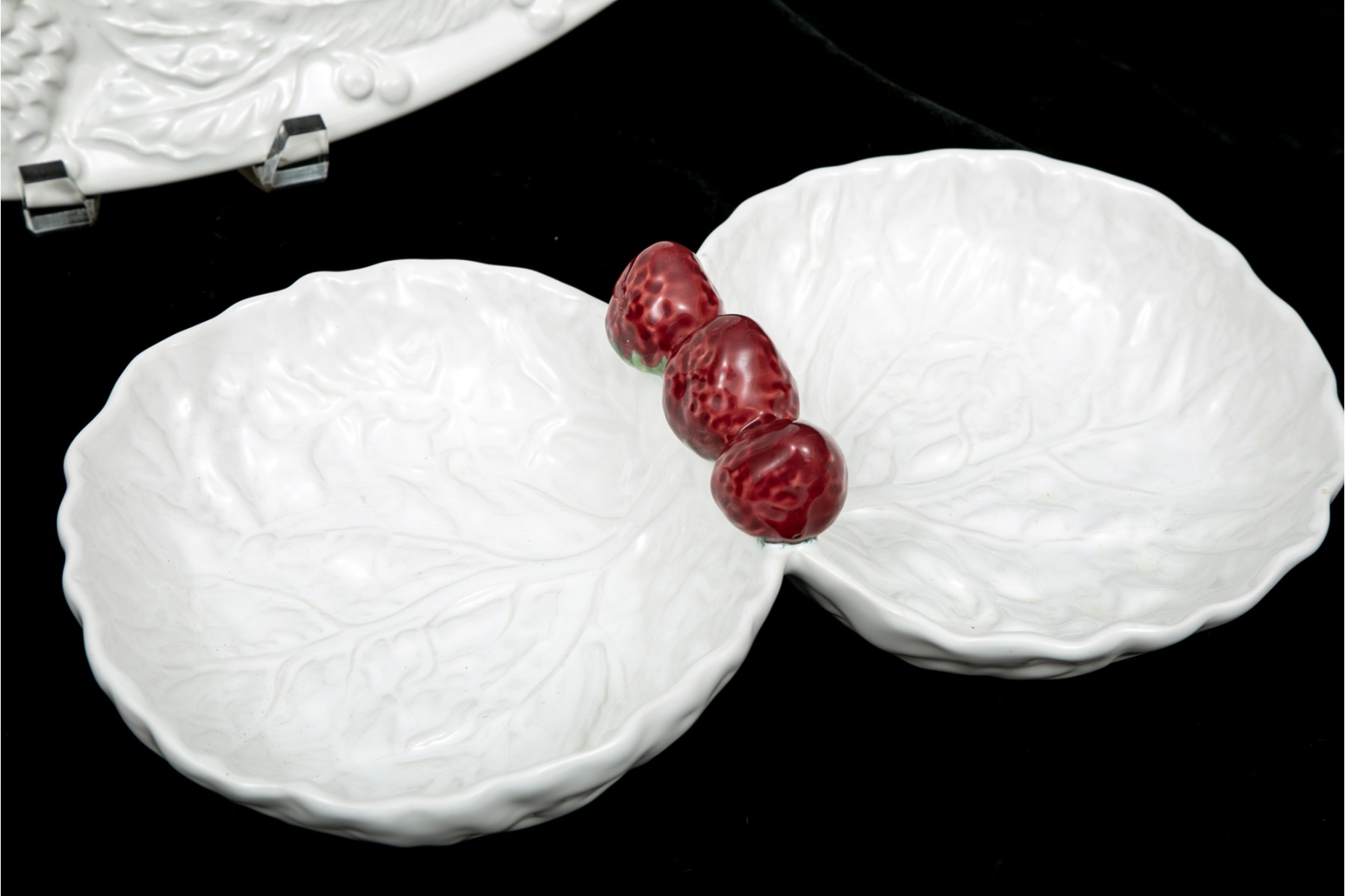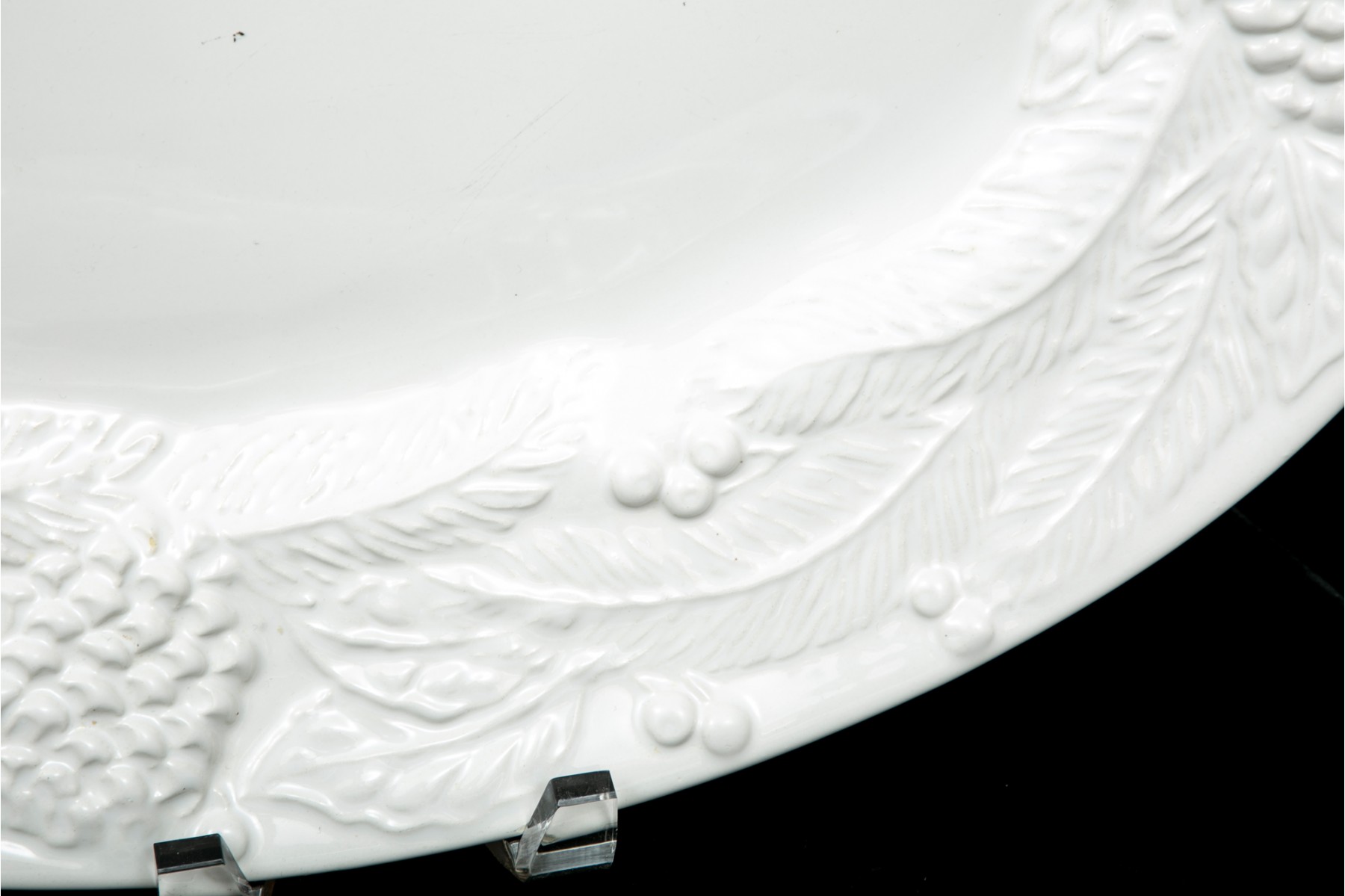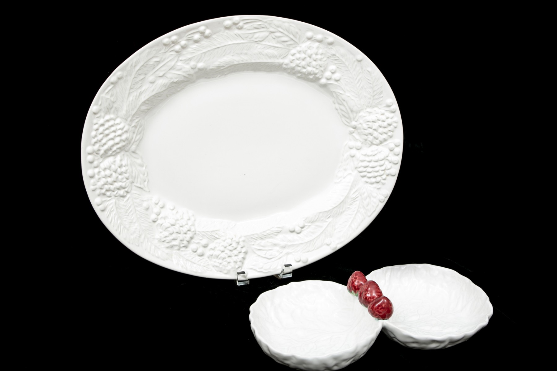White ceramic platter with embossed fruit, berry and leaf motif, made in Italy.