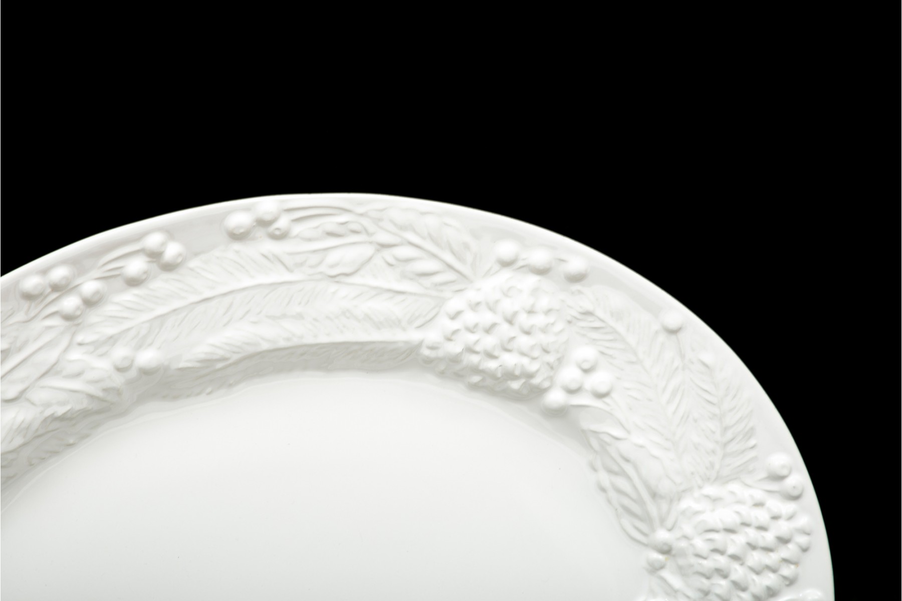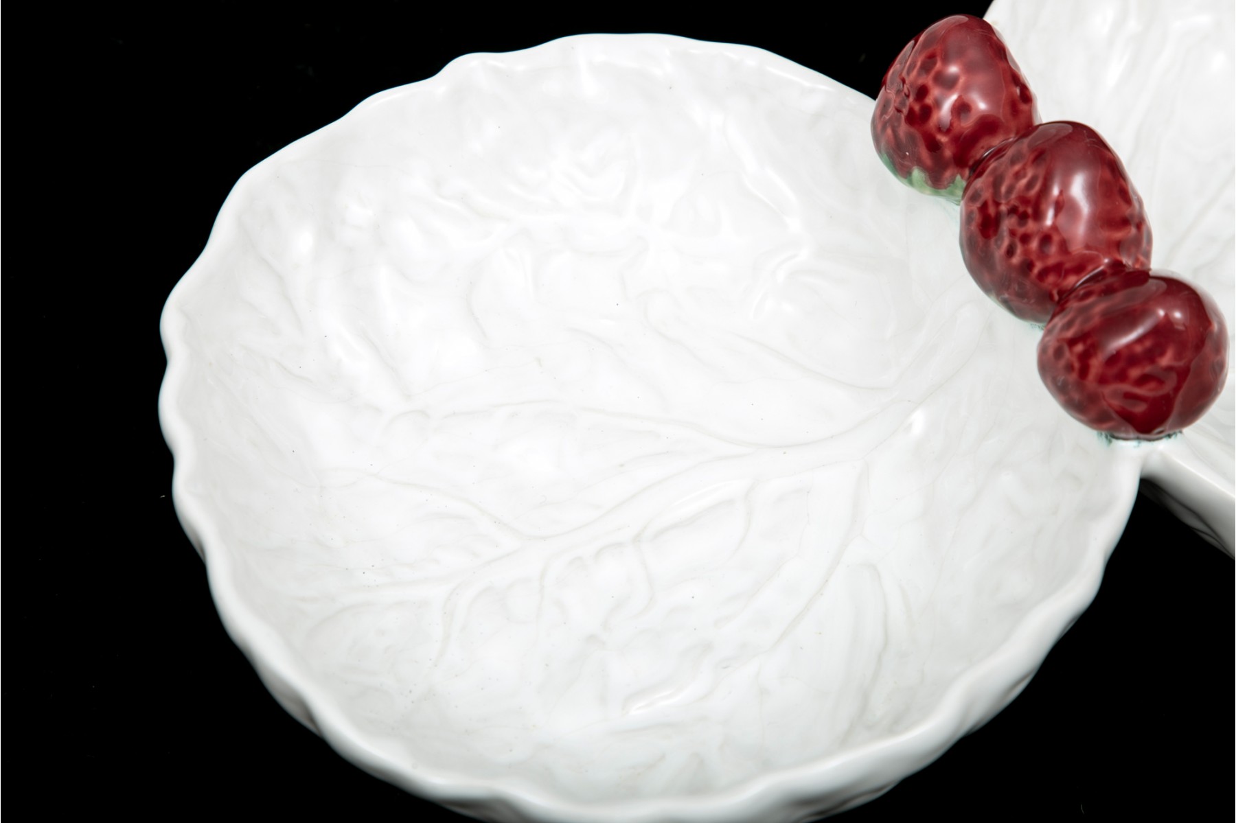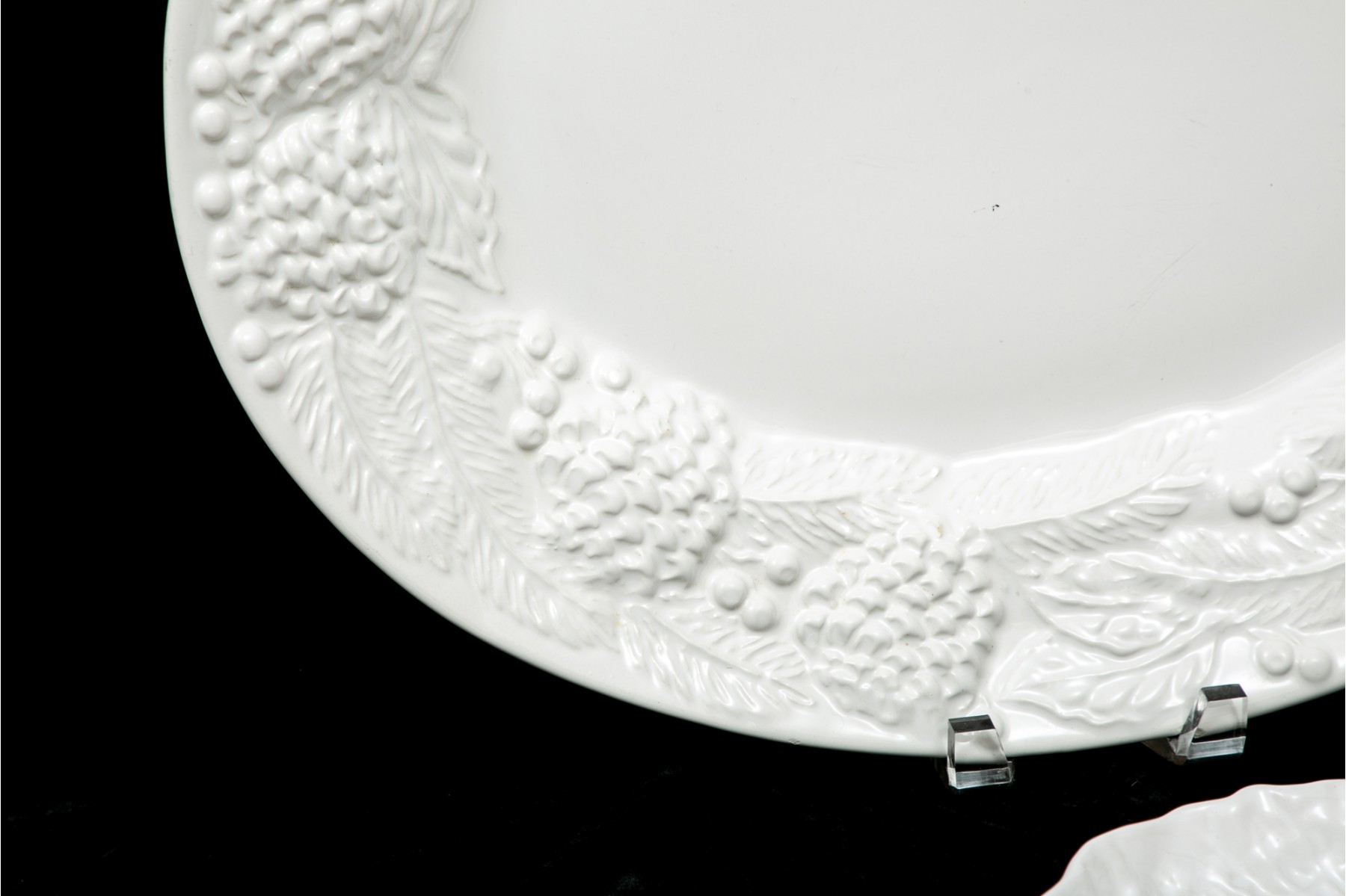 White ceramic platter with embossed fruit, berry and leaf motif, made in Italy.