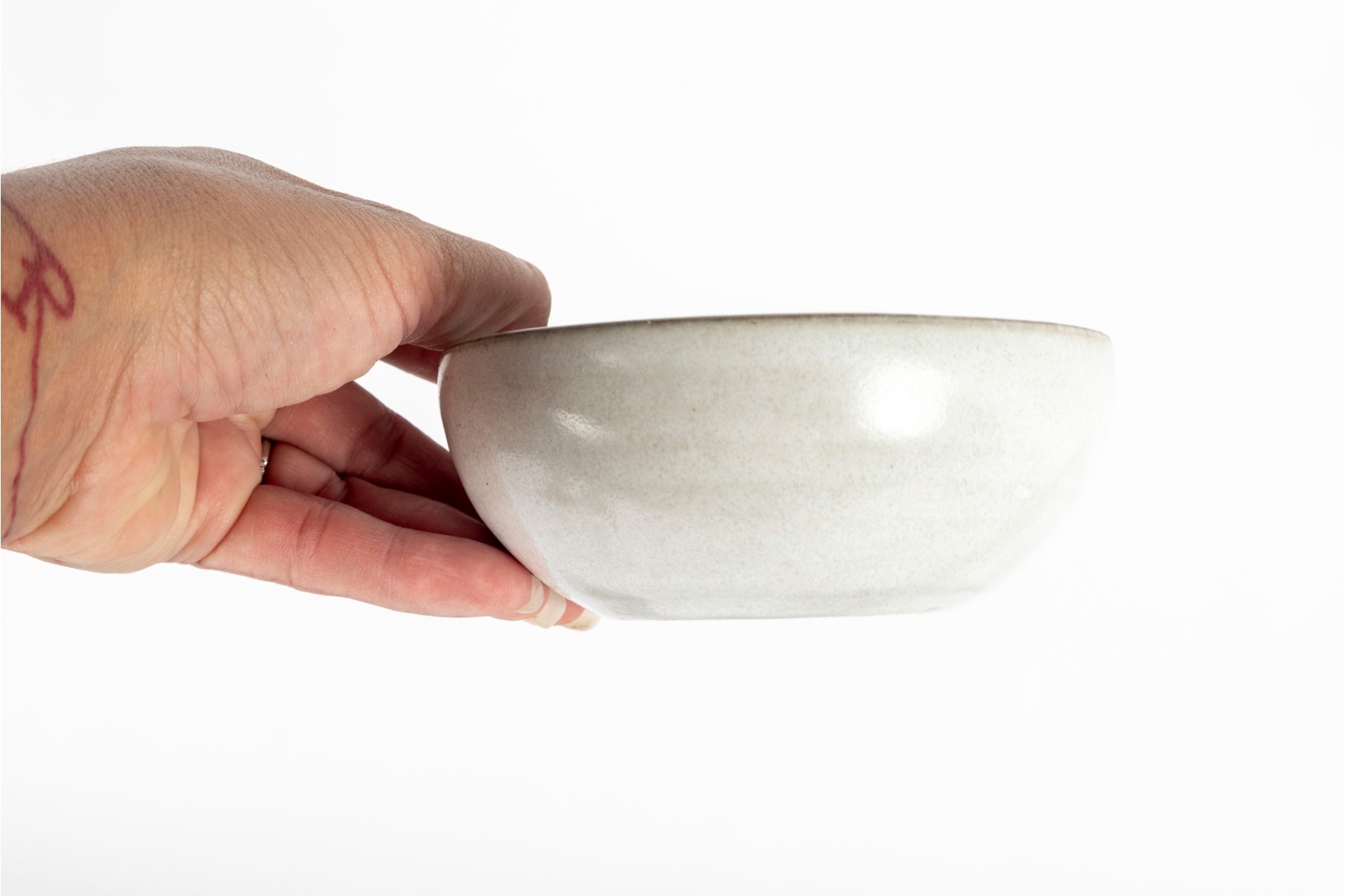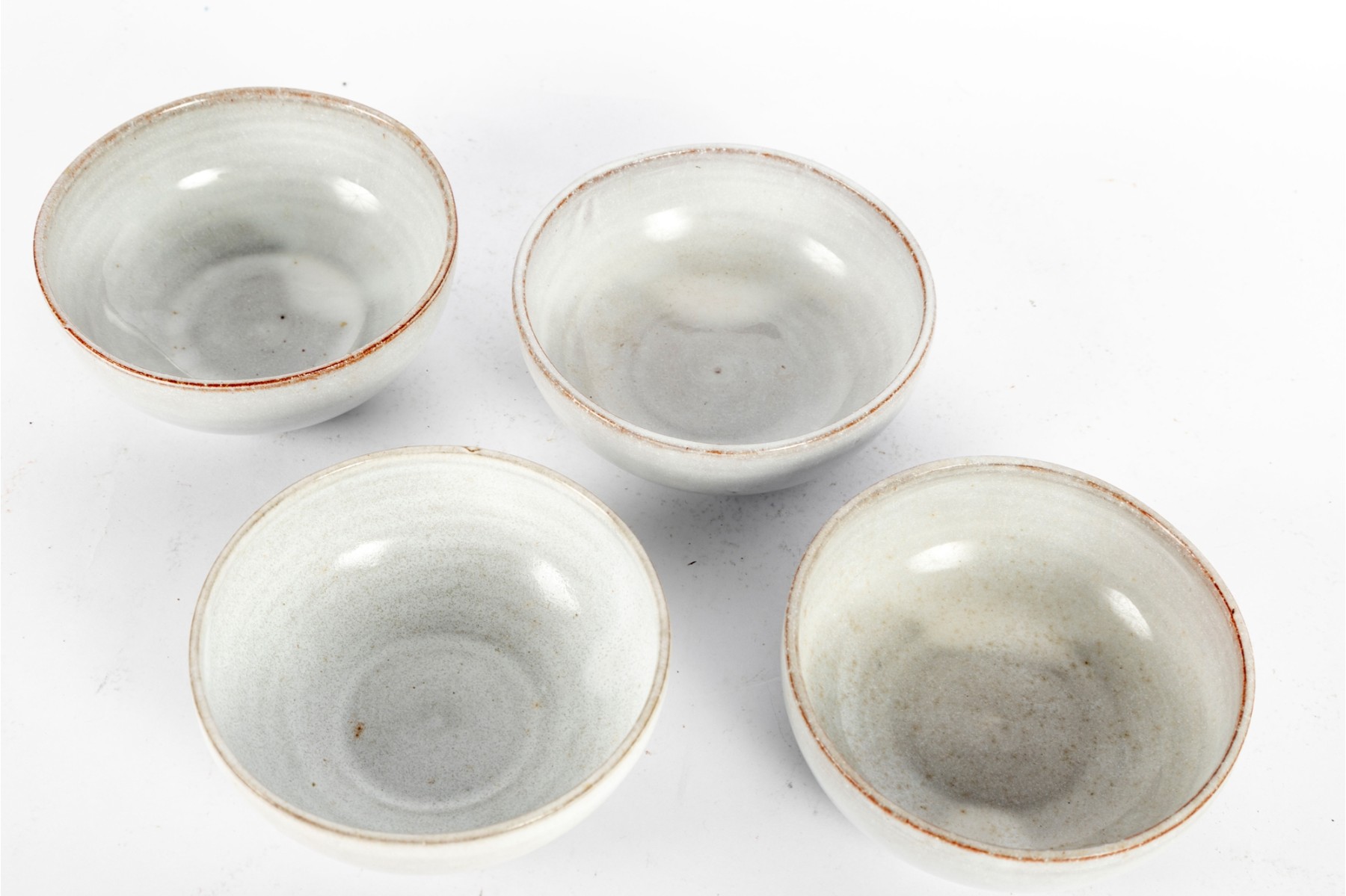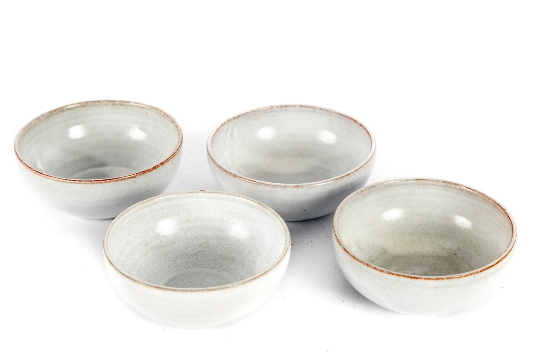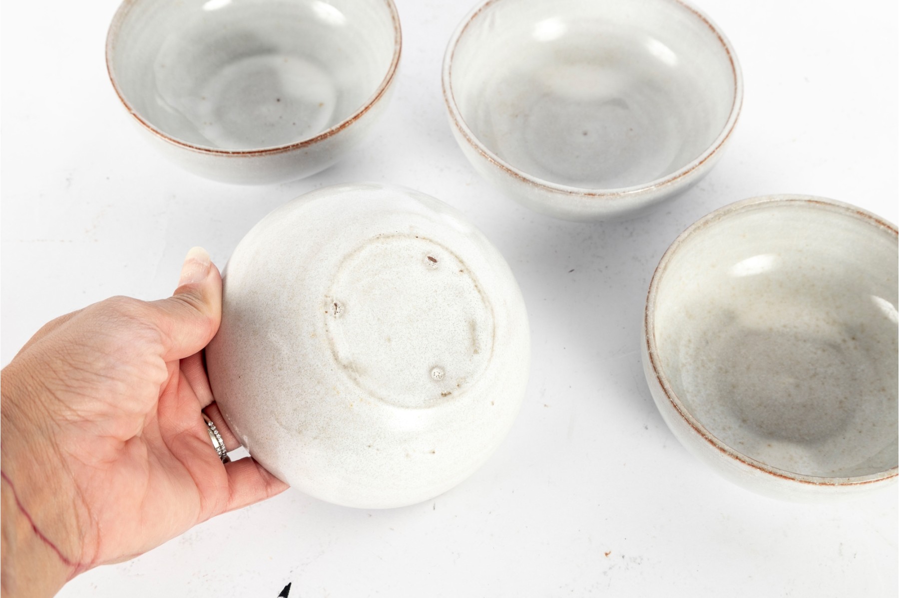 A set of four white-glazed stoneware bowls with a glossy finish, produced by North Carolina potter J.B. Cole.