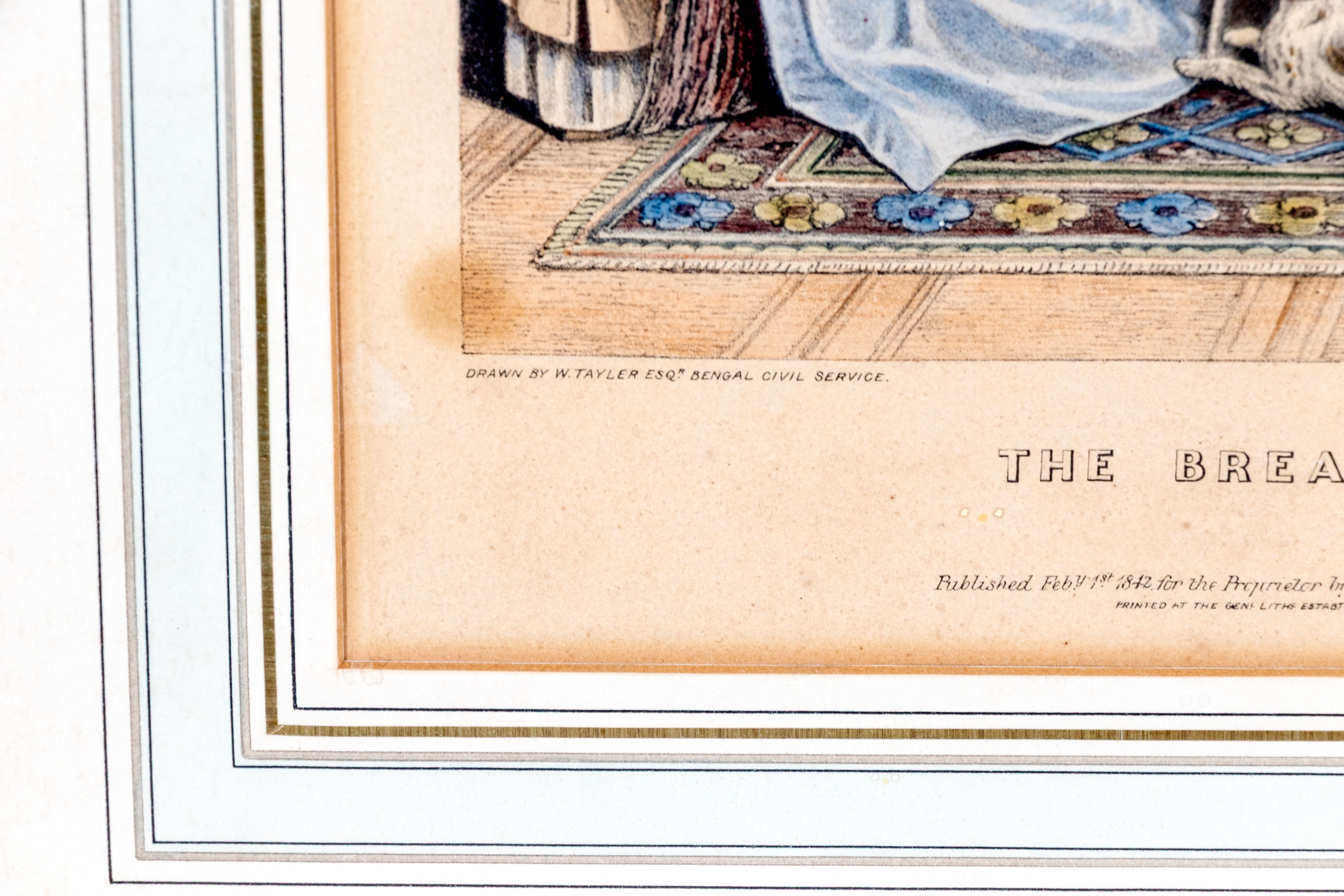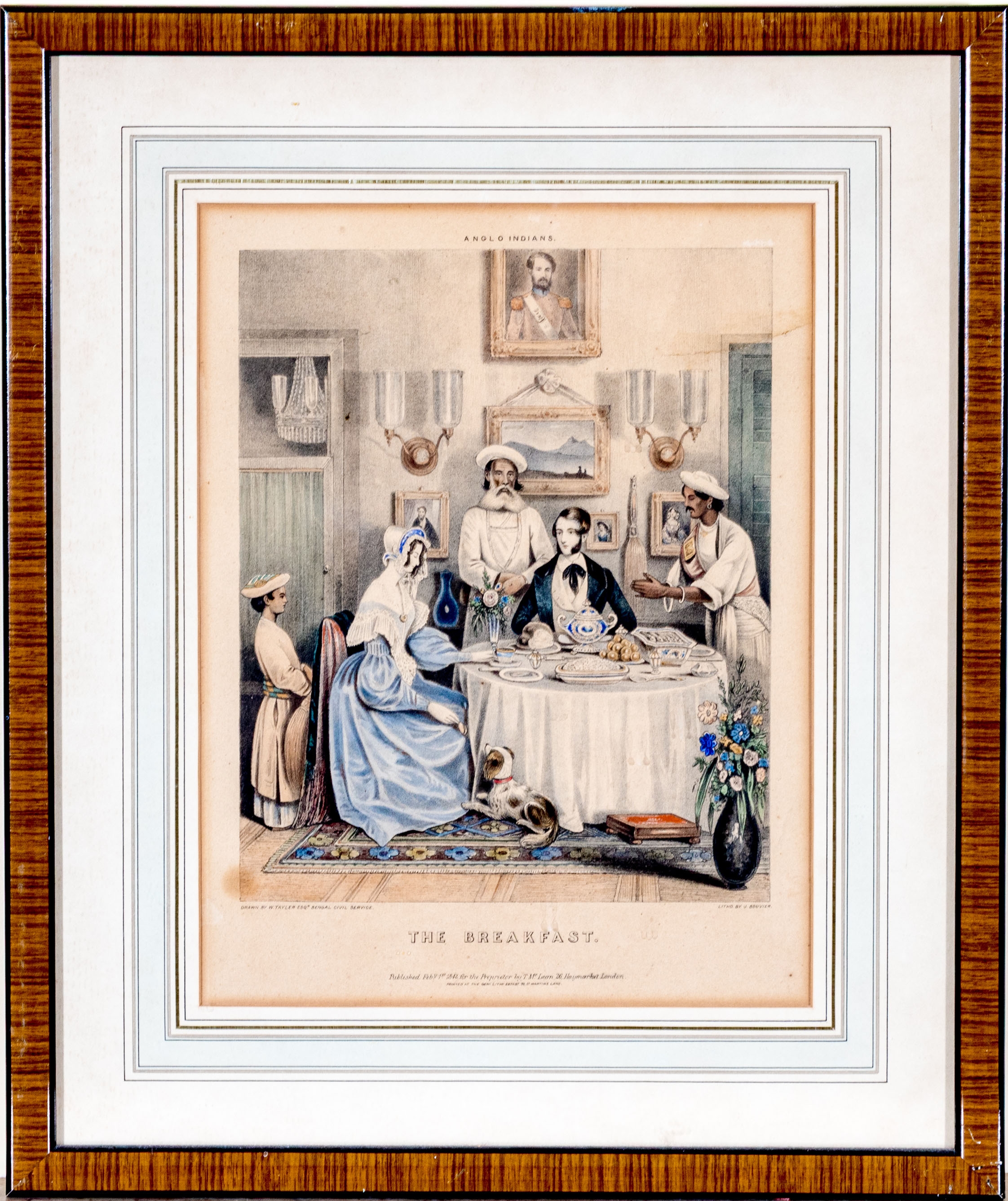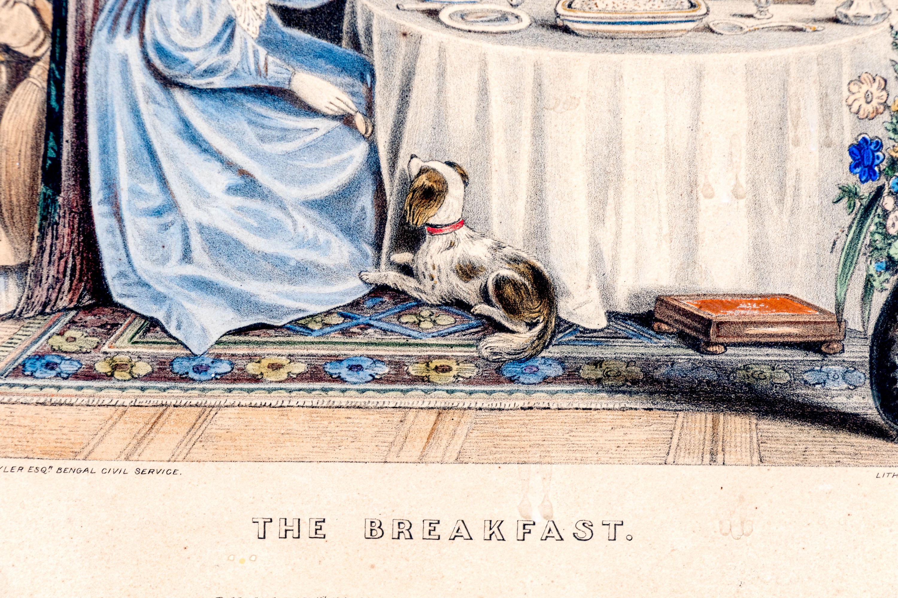 Joseph Anthony Bouvier (British, fl. 1839-1888) lithograph after the original drawing by William Tayler (British, 1808-1892) "The Breakfast" depicting a hand-colored scene of a family gathering for breakfast with their dog at a round table with a white tablecloth in a decorated interior.
