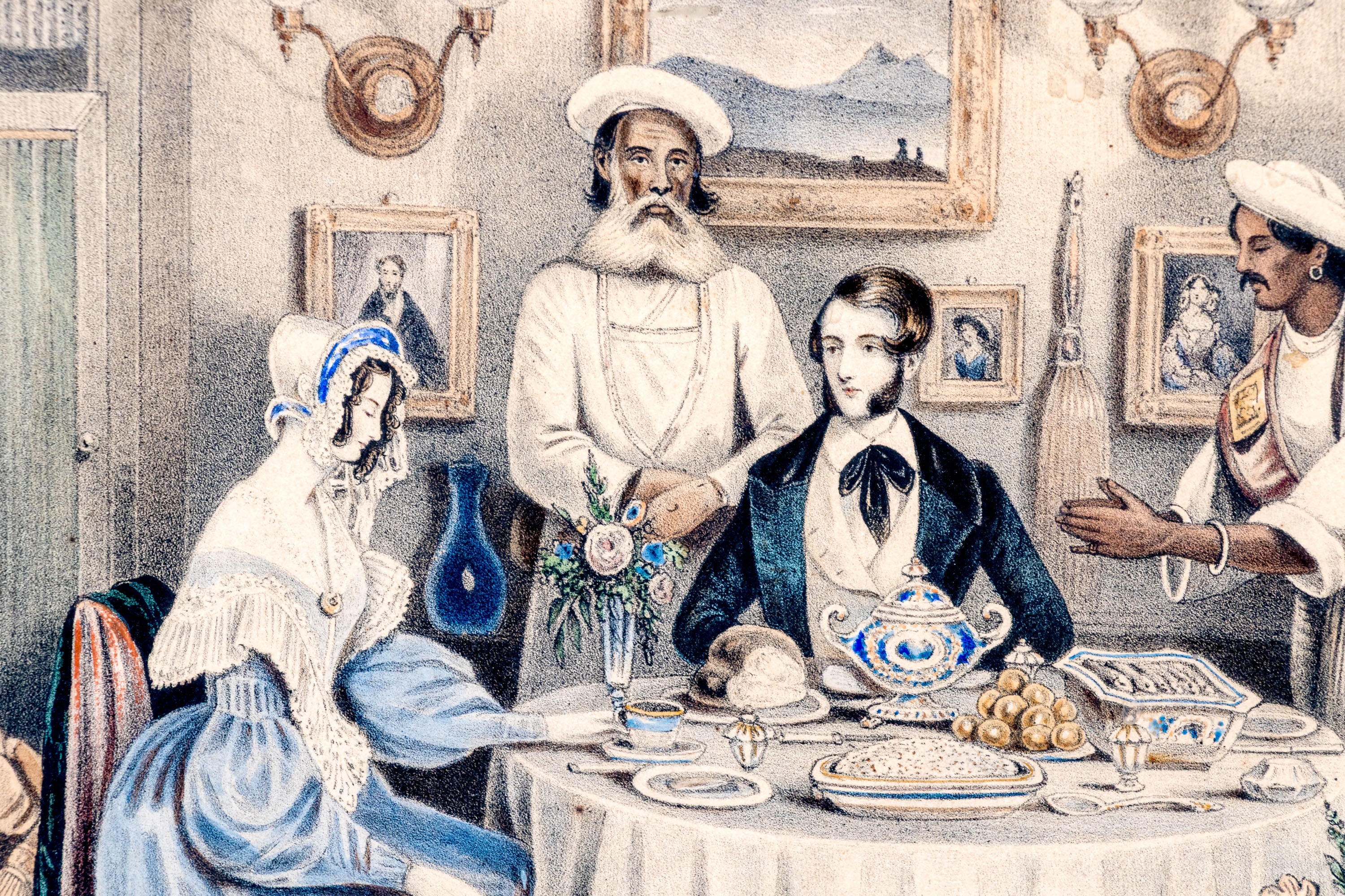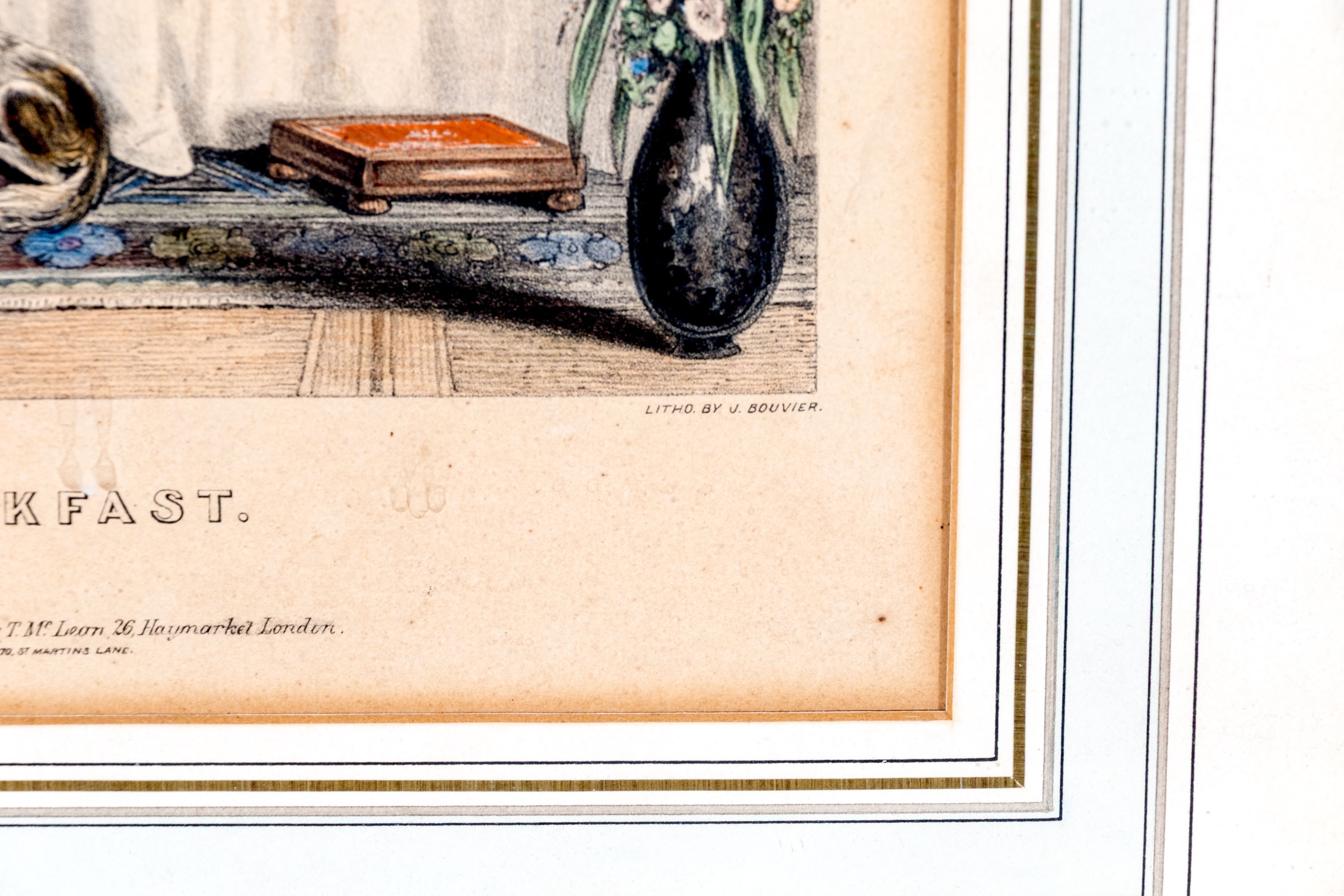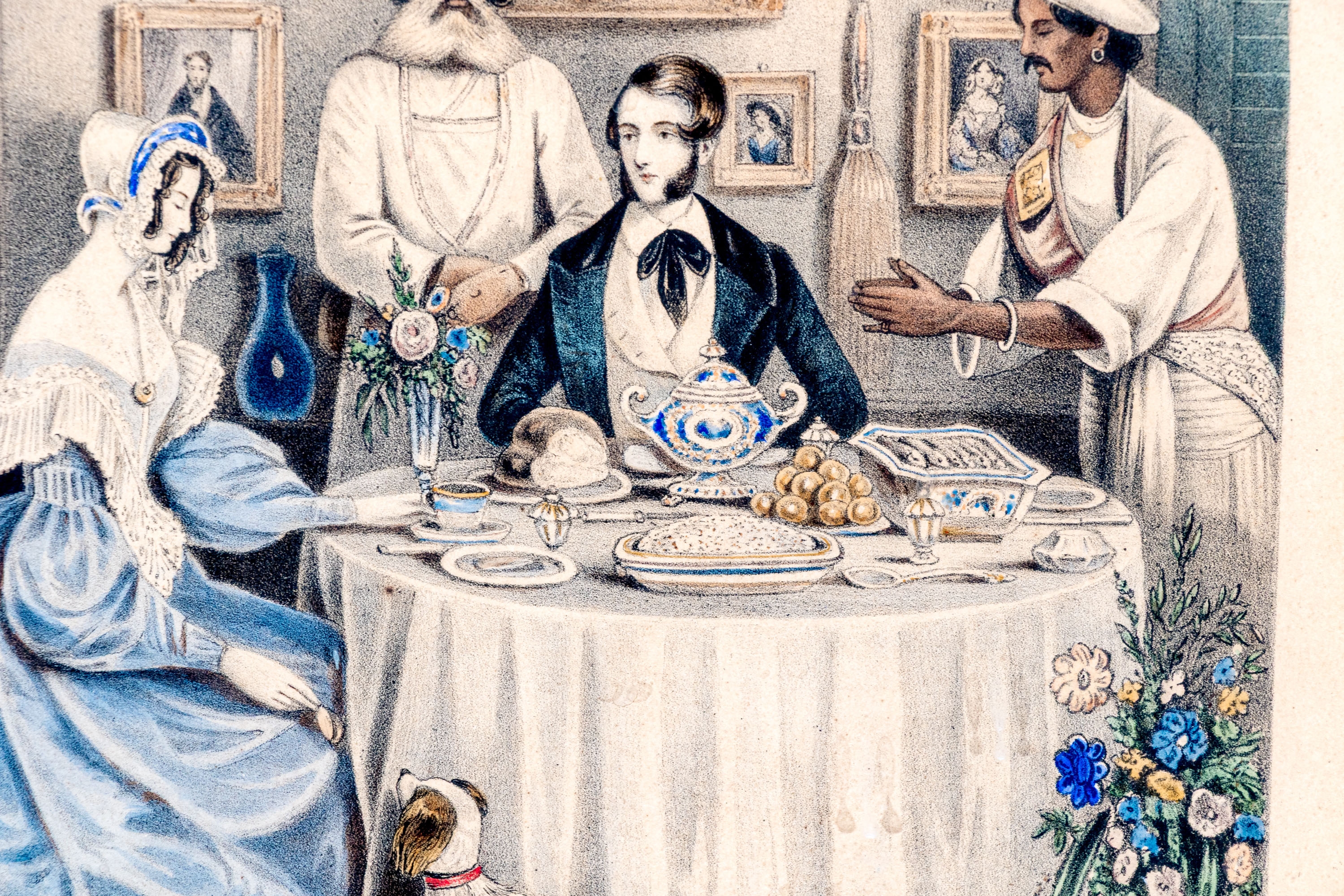 Joseph Anthony Bouvier (British, fl. 1839-1888) lithograph after the original drawing by William Tayler (British, 1808-1892) "The Breakfast" depicting a hand-colored scene of a family gathering for breakfast with their dog at a round table with a white tablecloth in a decorated interior.