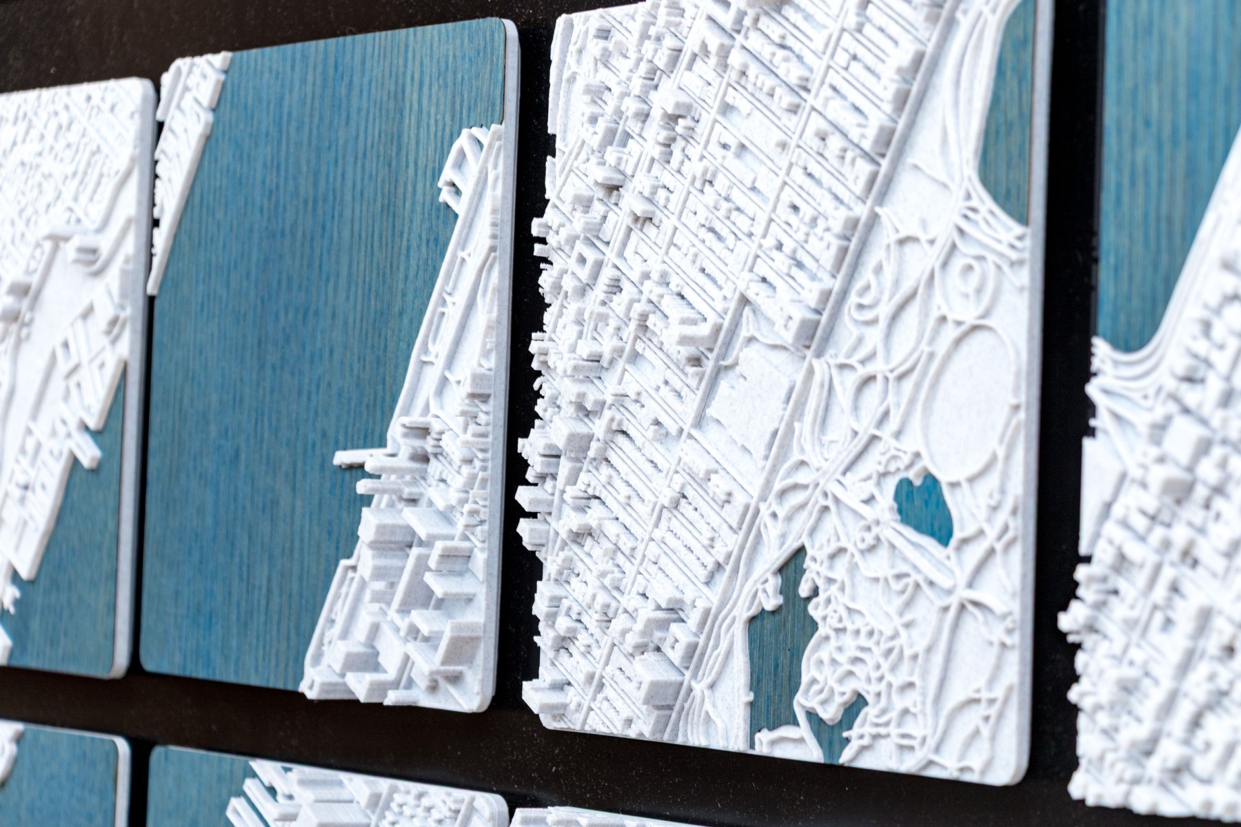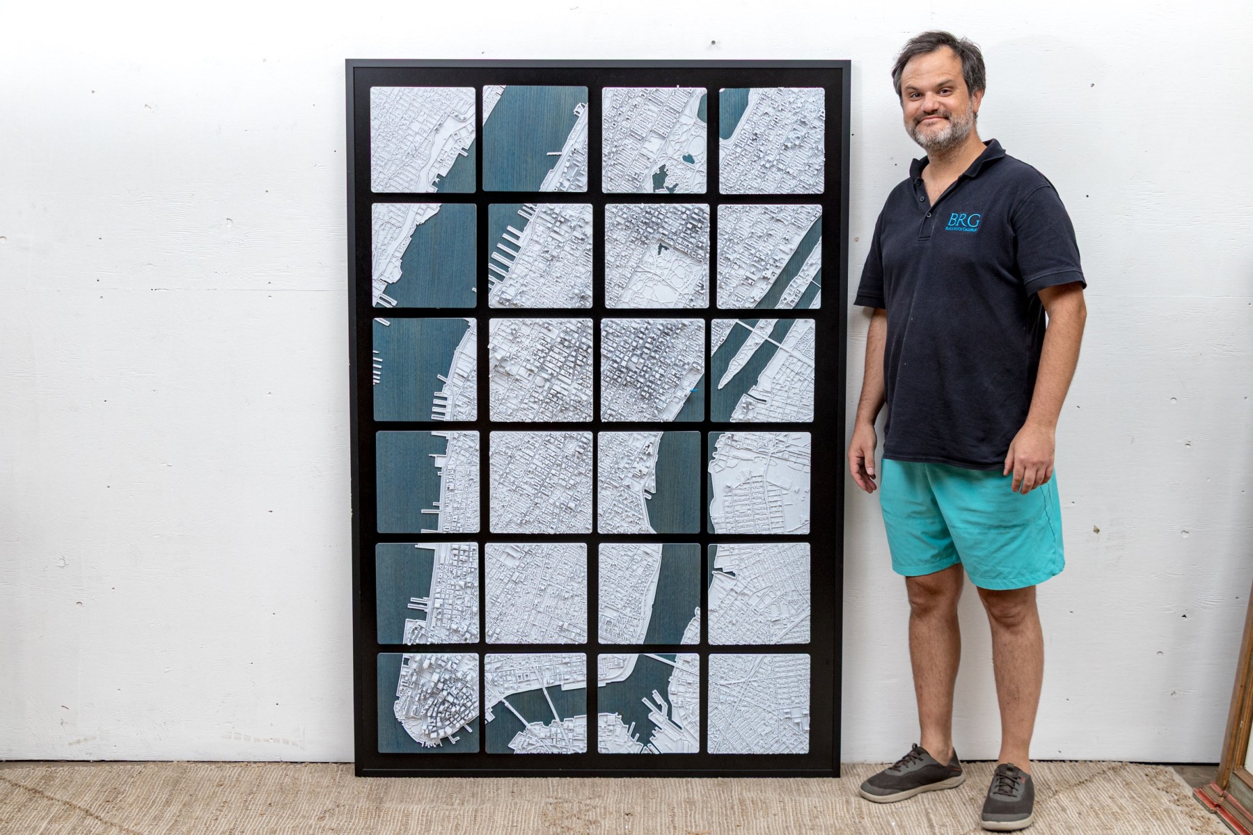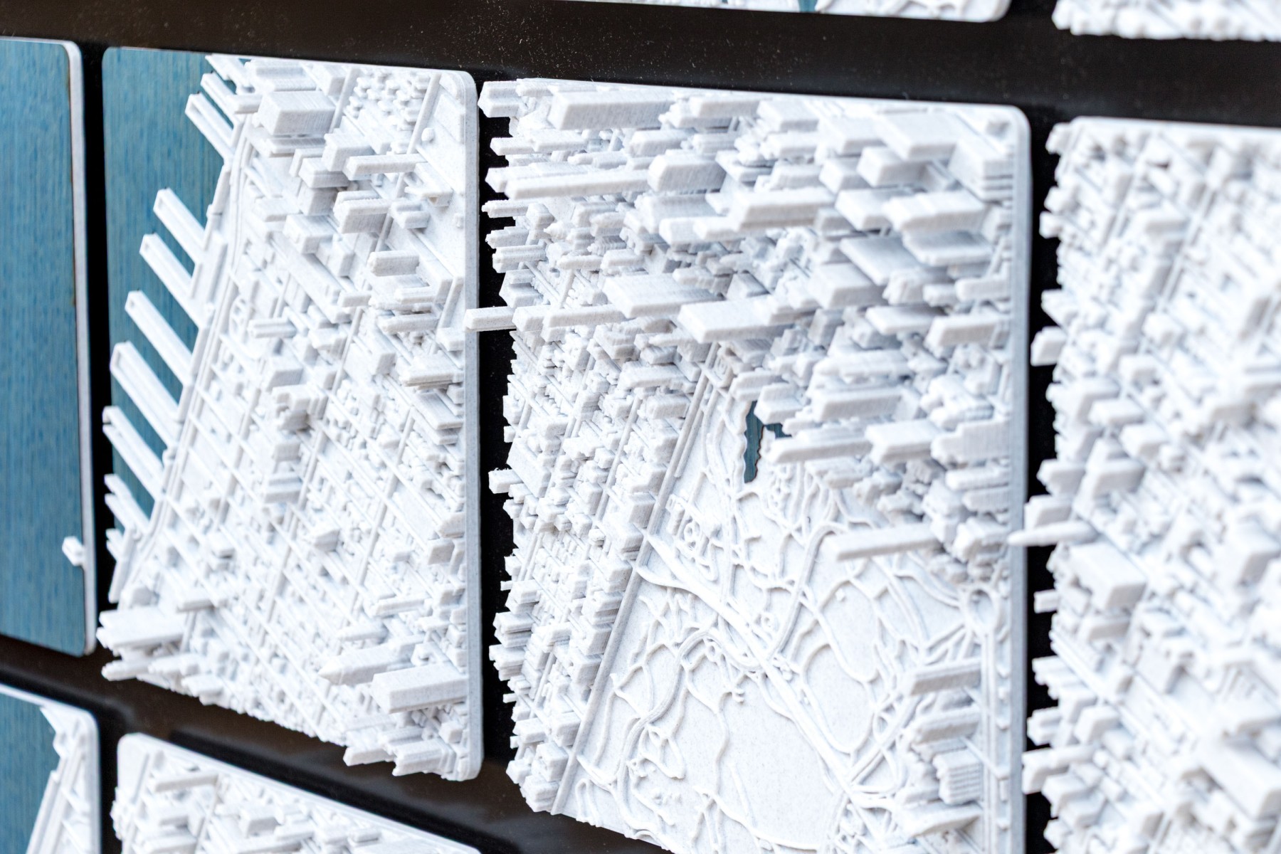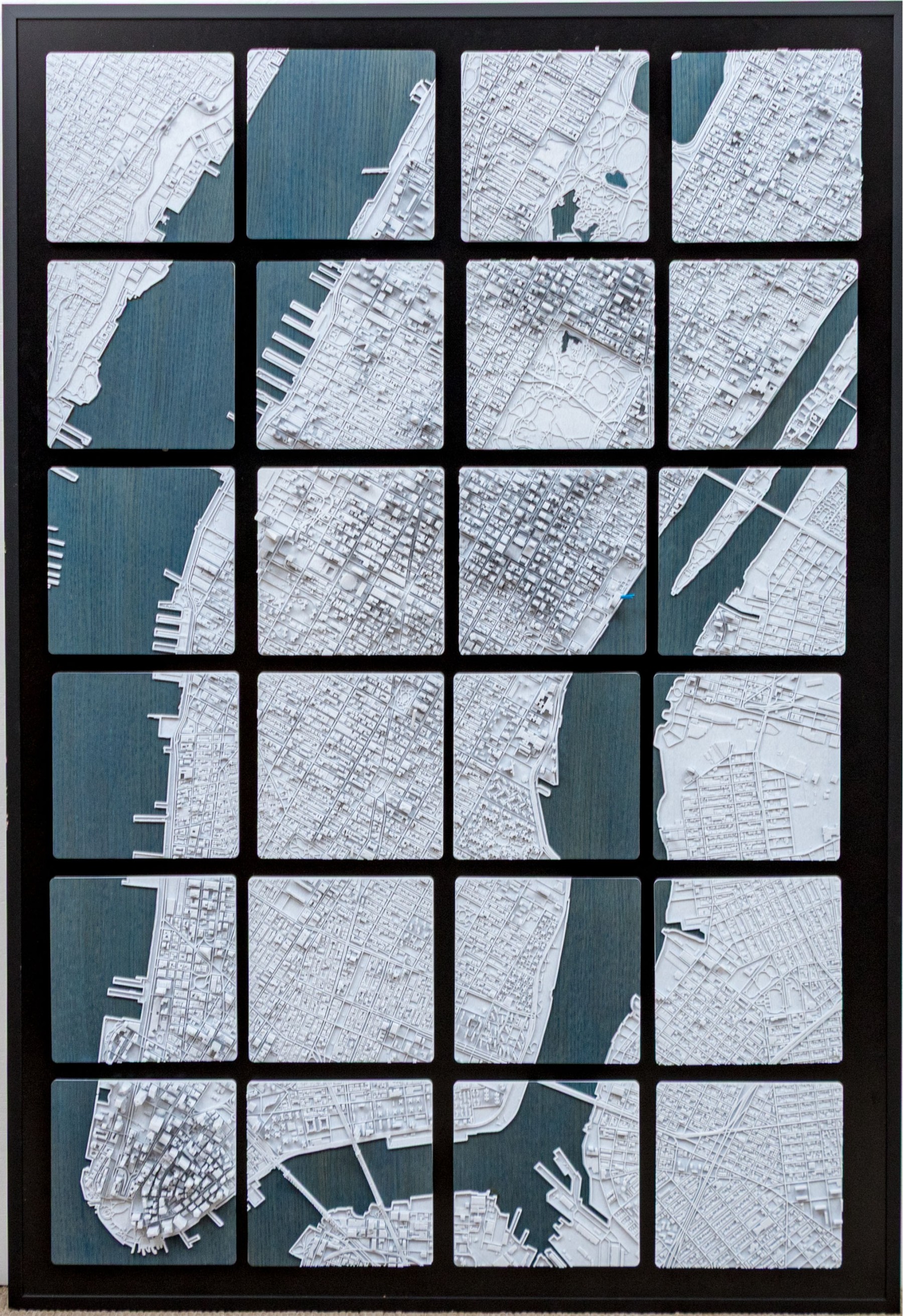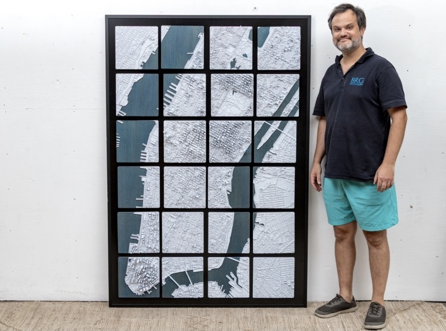 J.D. Dennison is an American contemporary artist. This current work is a fascinating and highly textural 3D-printed map of Manhattan. The work is part of a series of the largest cities in the USA, and world. The work has a black backboard affixed with 24 Eagle-Clips to hang the 24 corresponding 3D printed plaques with notable landmarks and structures.