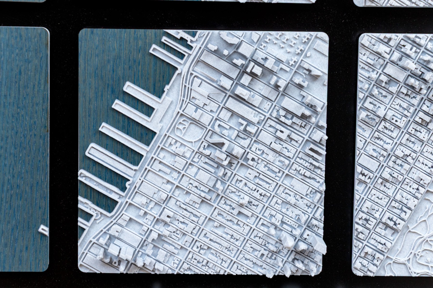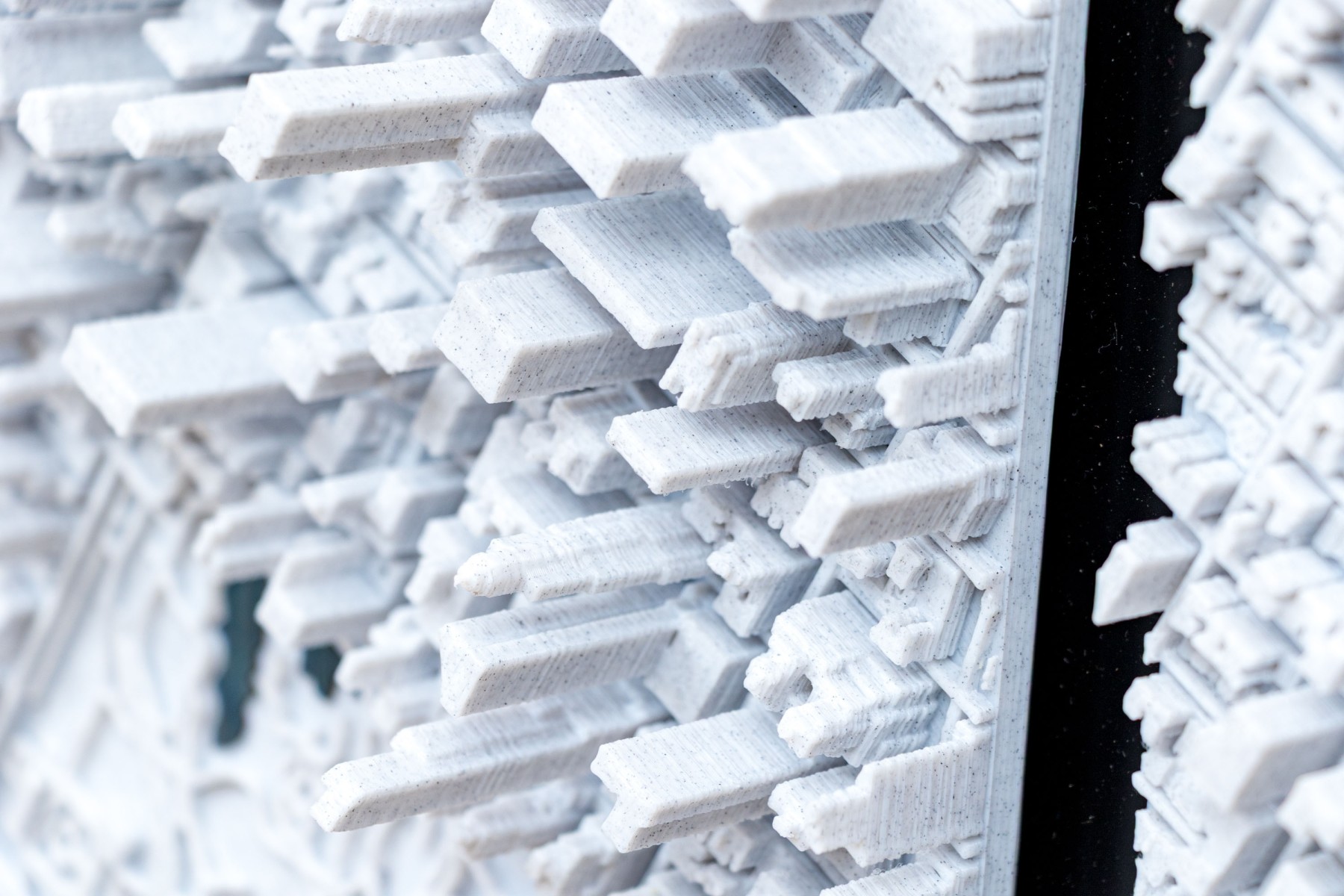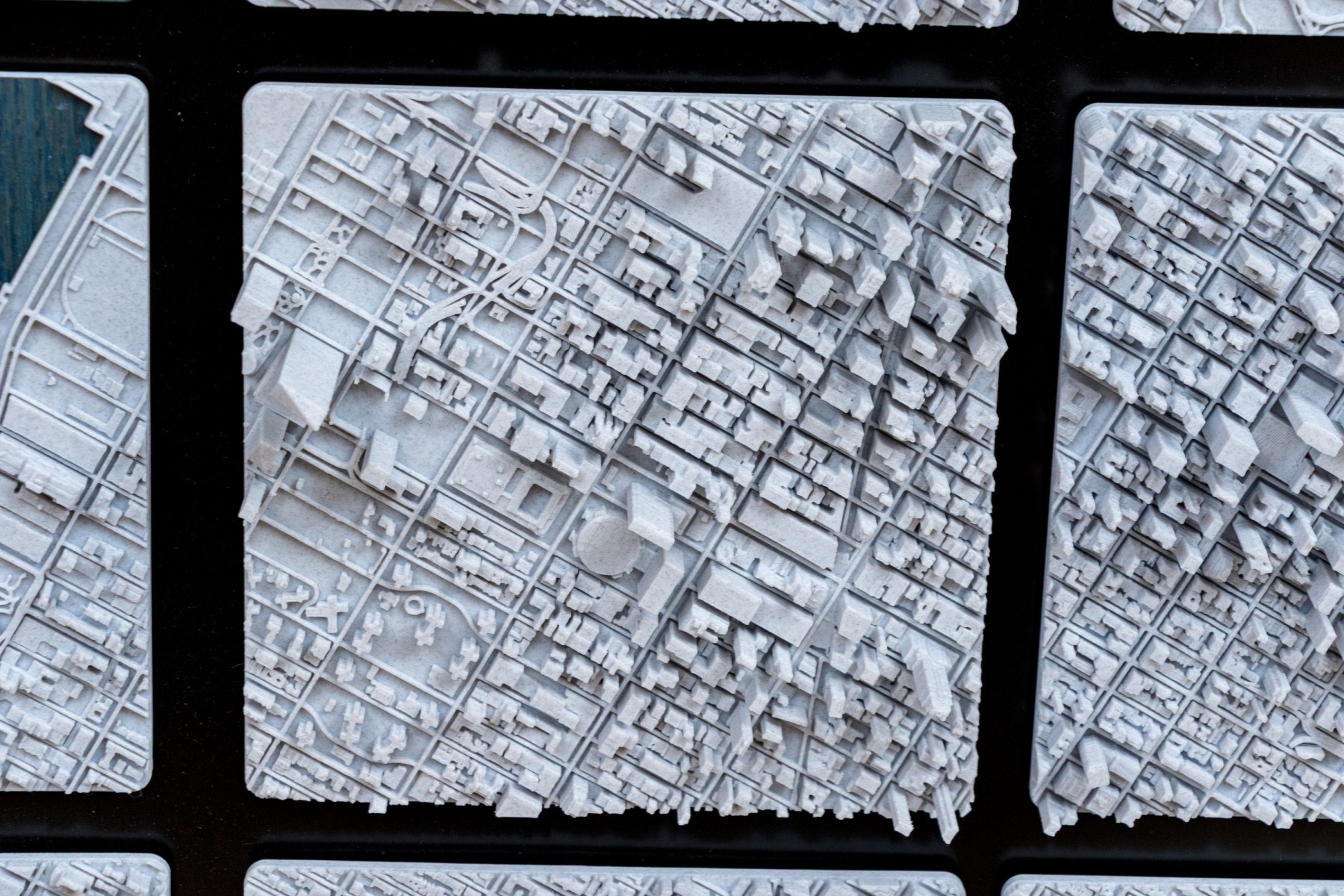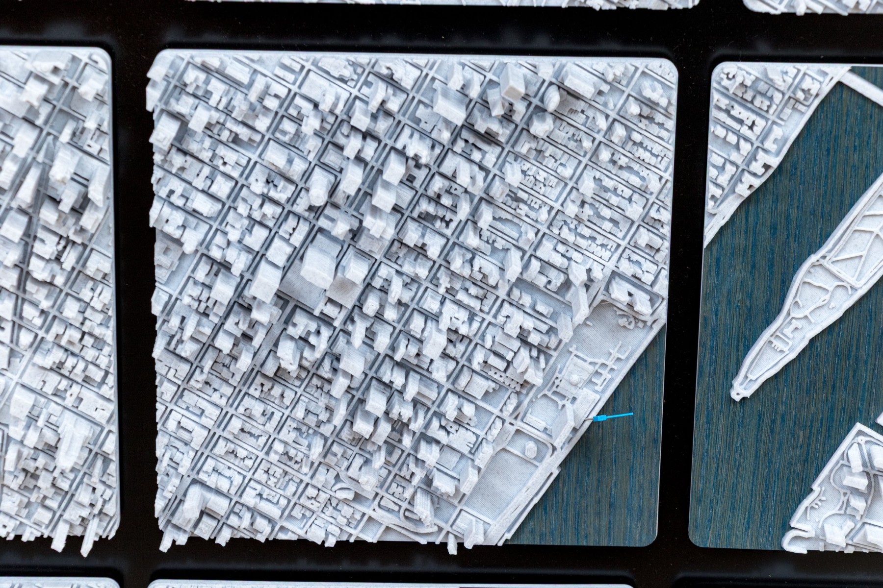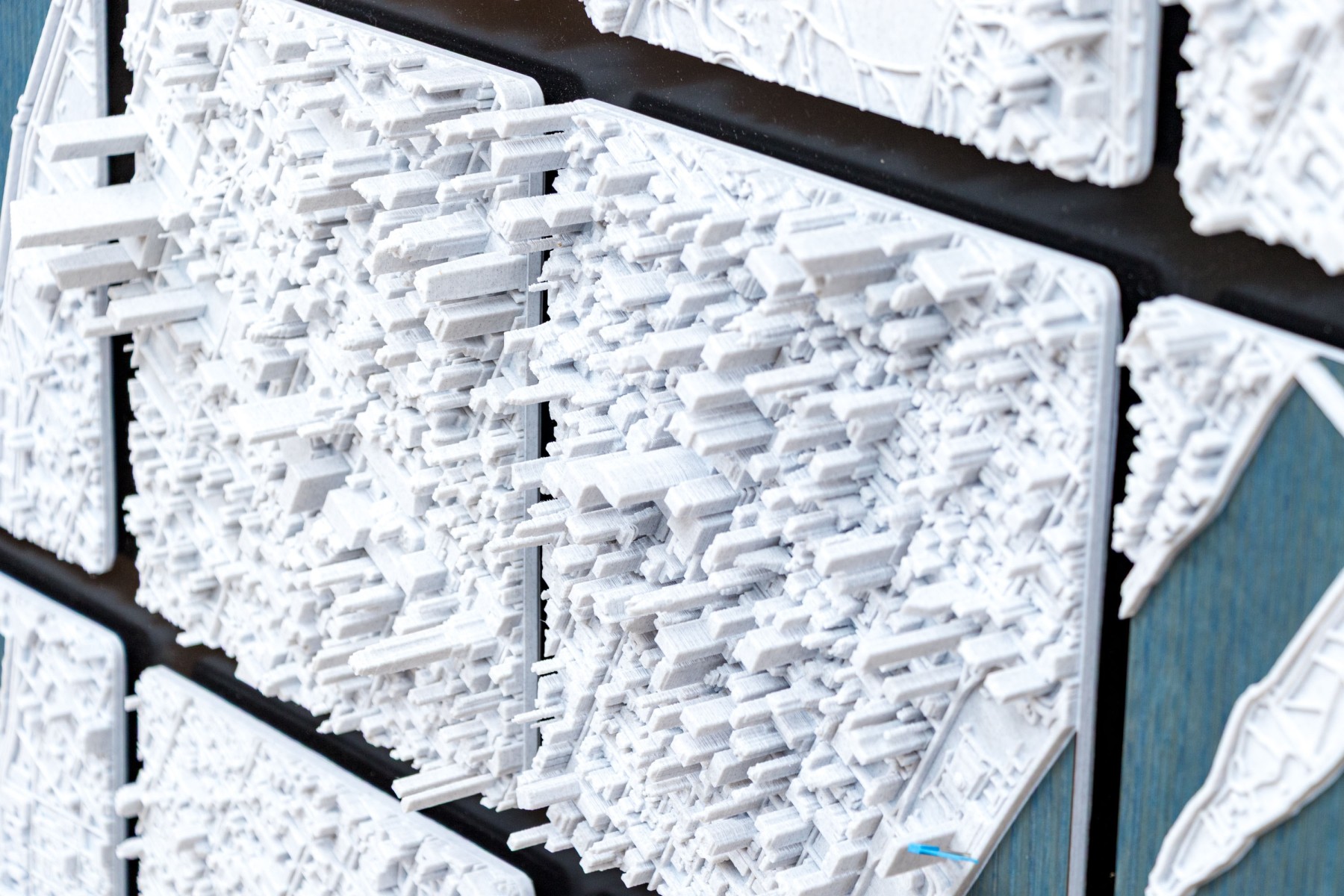 J.D. Dennison is an American contemporary artist. This current work is a fascinating and highly textural 3D-printed map of Manhattan. The work is part of a series of the largest cities in the USA, and world. The work has a black backboard affixed with 24 Eagle-Clips to hang the 24 corresponding 3D printed plaques with notable landmarks and structures.