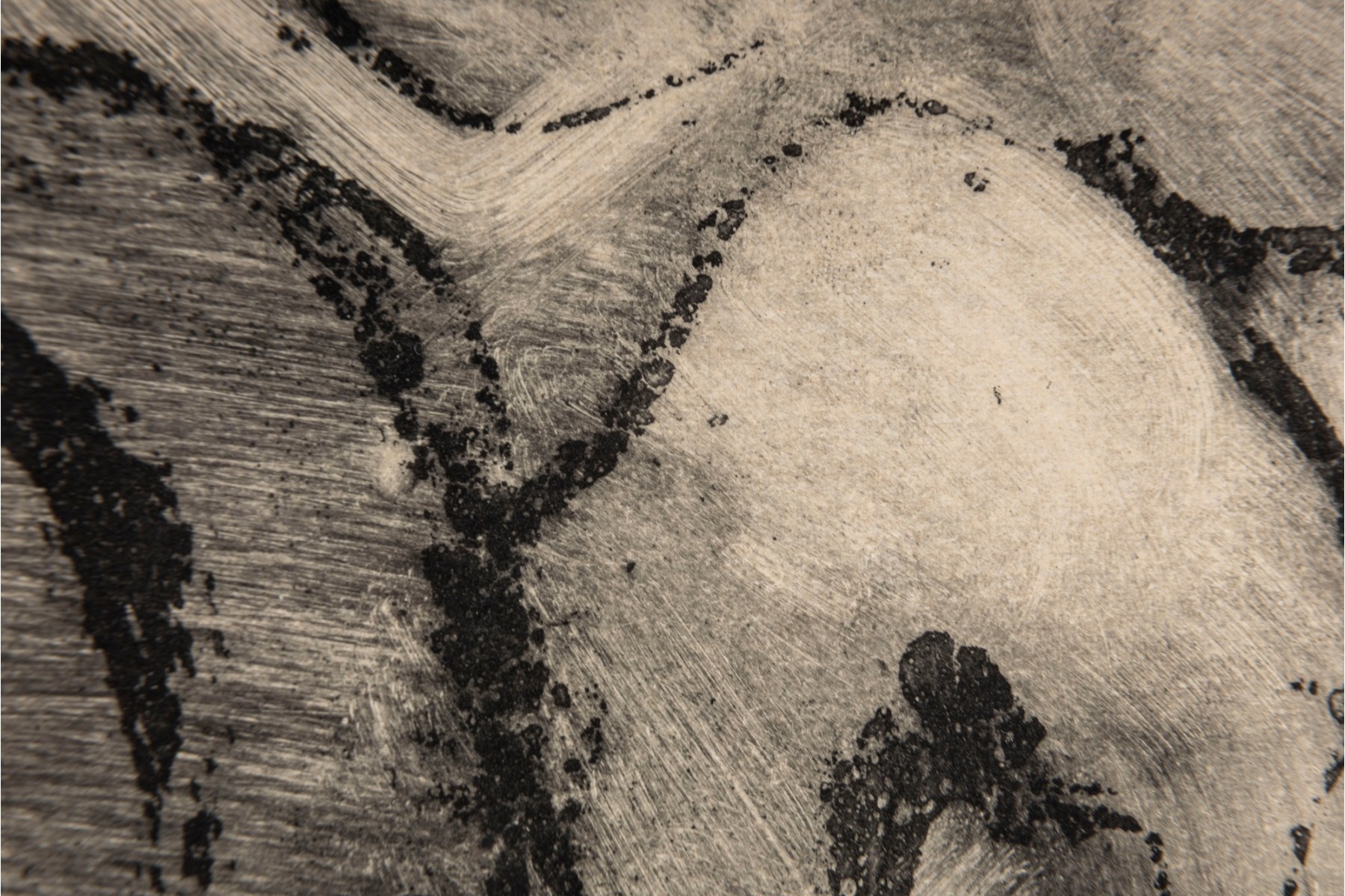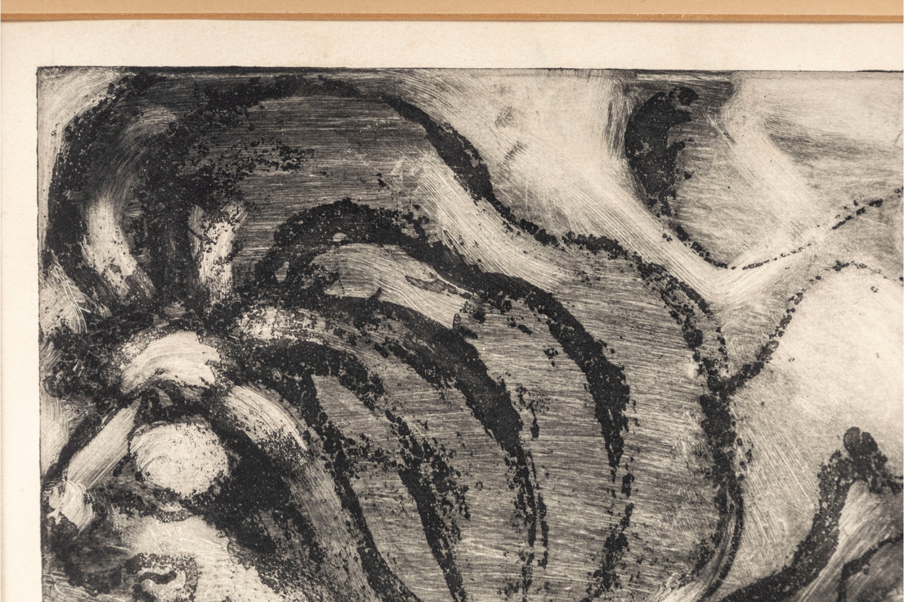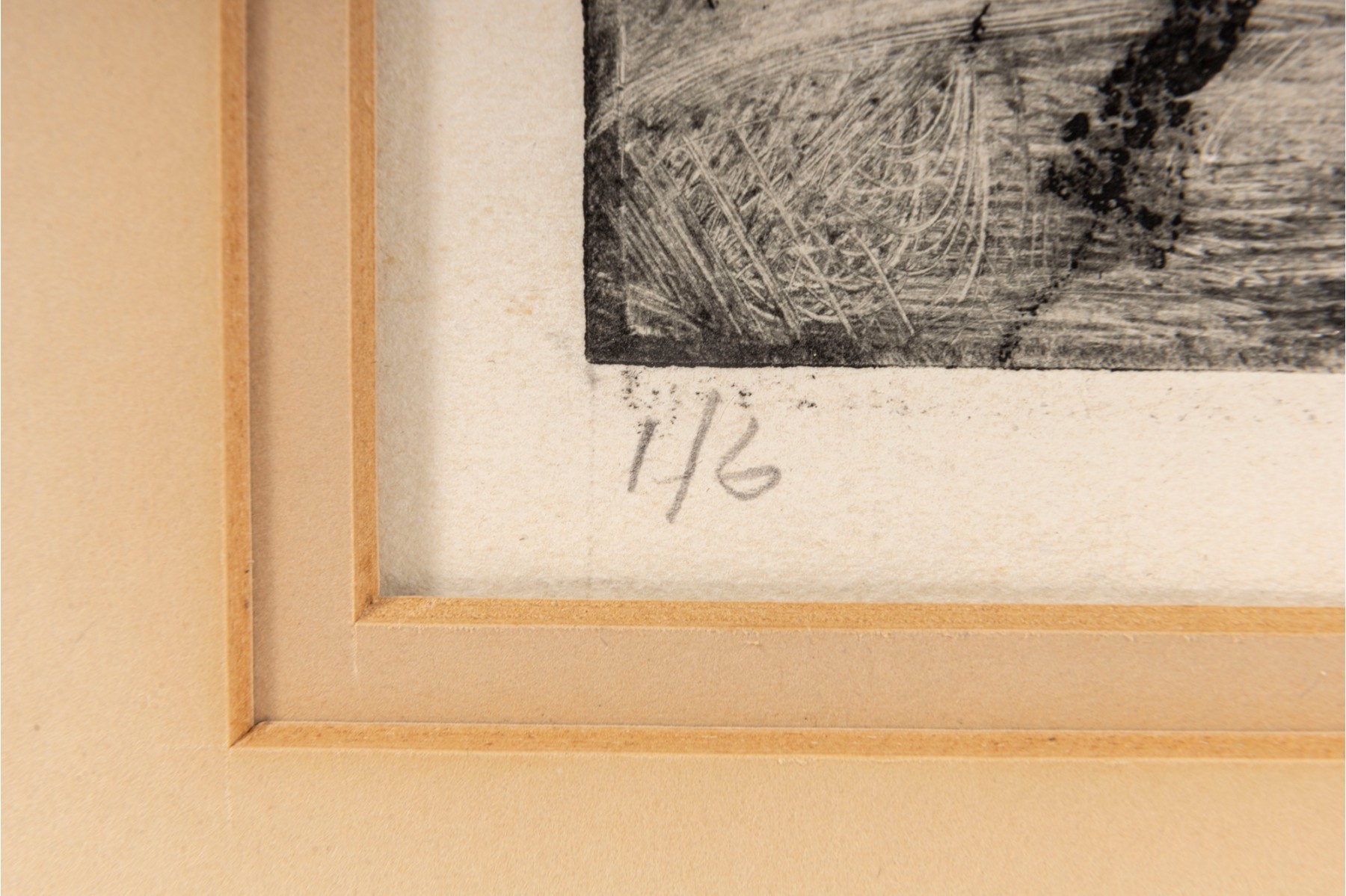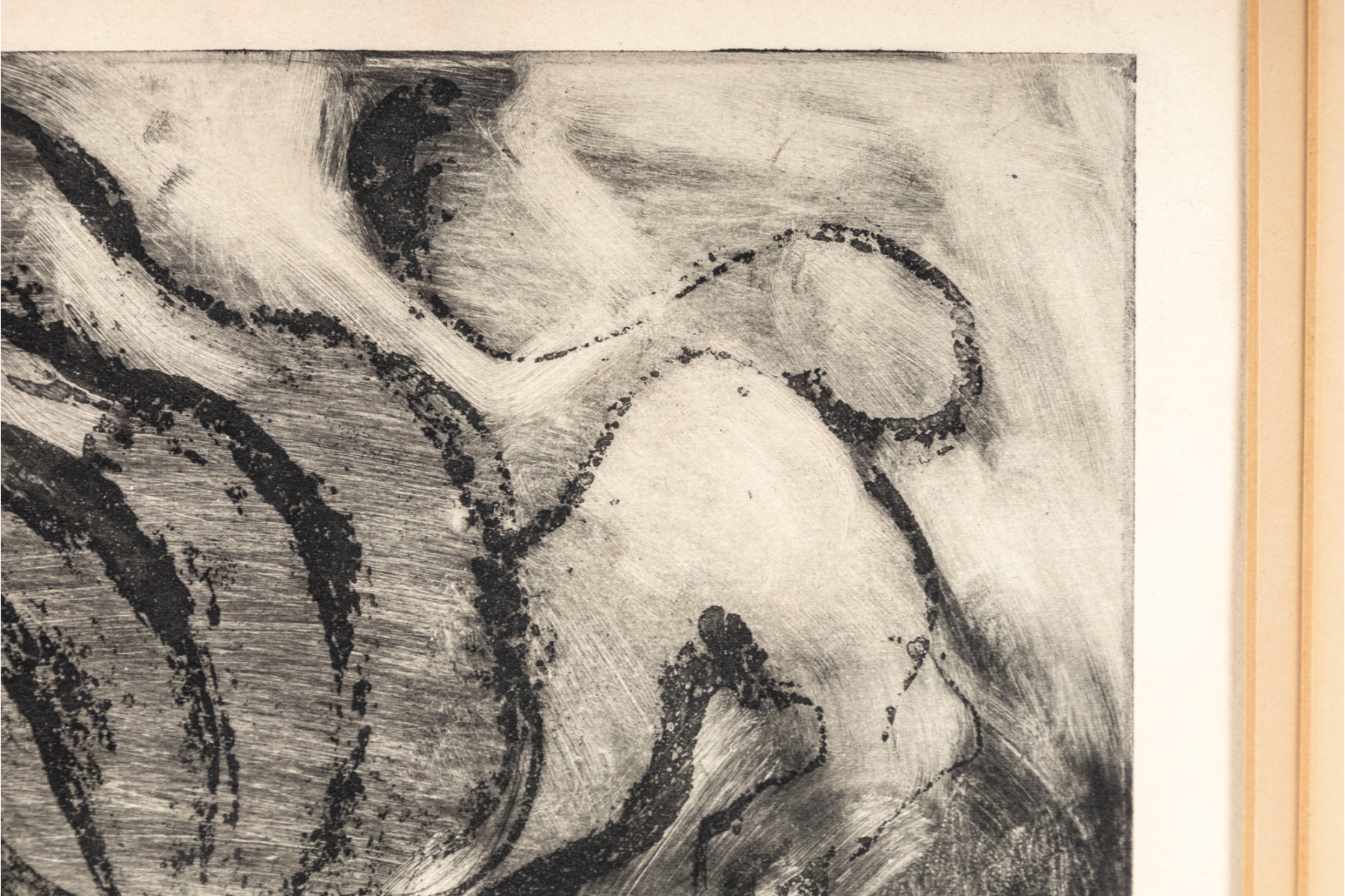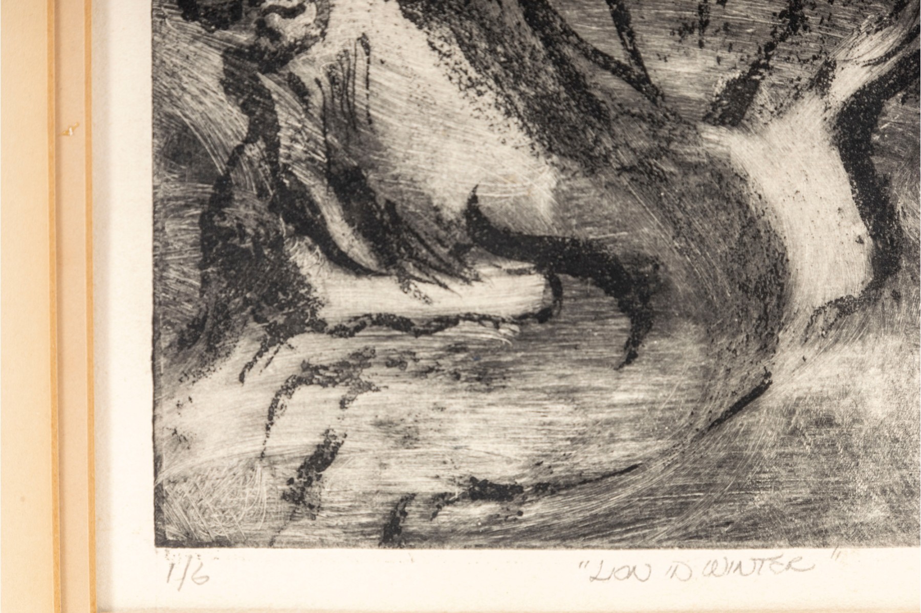 J.L Holloway's "Lion In Winter" signed and numbered etching (1/6) displaying an abstract monochrome depiction of a lion amidst the depth of shading and black/white gradients. The artwork is unframed and presented within a mat-border.