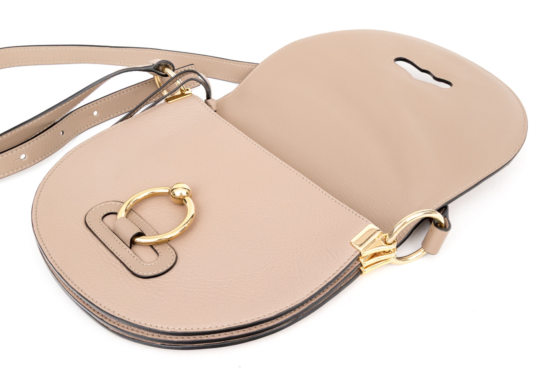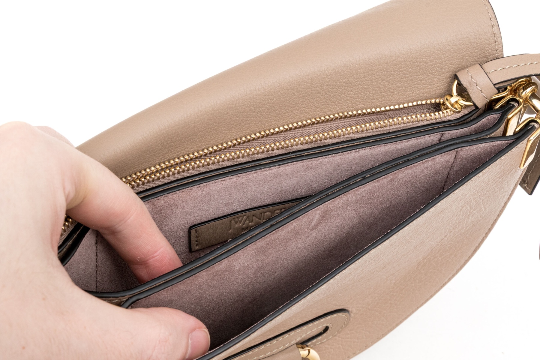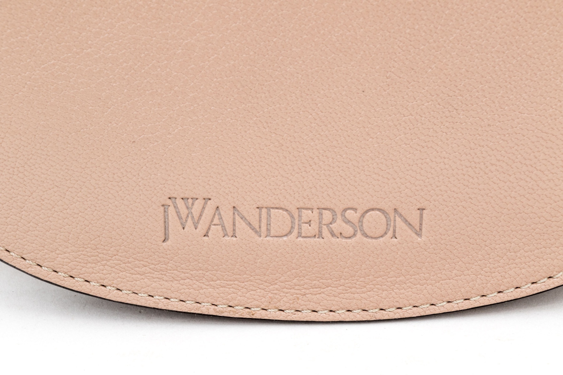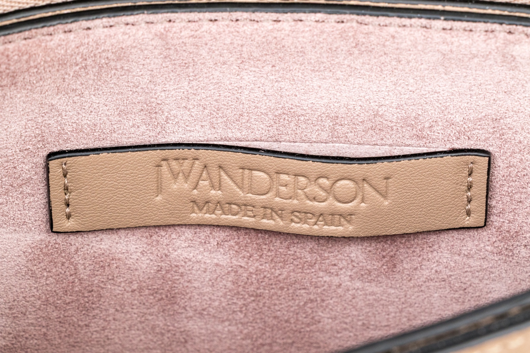 This beautifully crafted shoulder bag by J.W.Anderson was made in Spain, and features a tan leather flap front exterior, rounded bottom, and is finished with gold tone hardware and a doorknocker style closure and a tan suede interior.