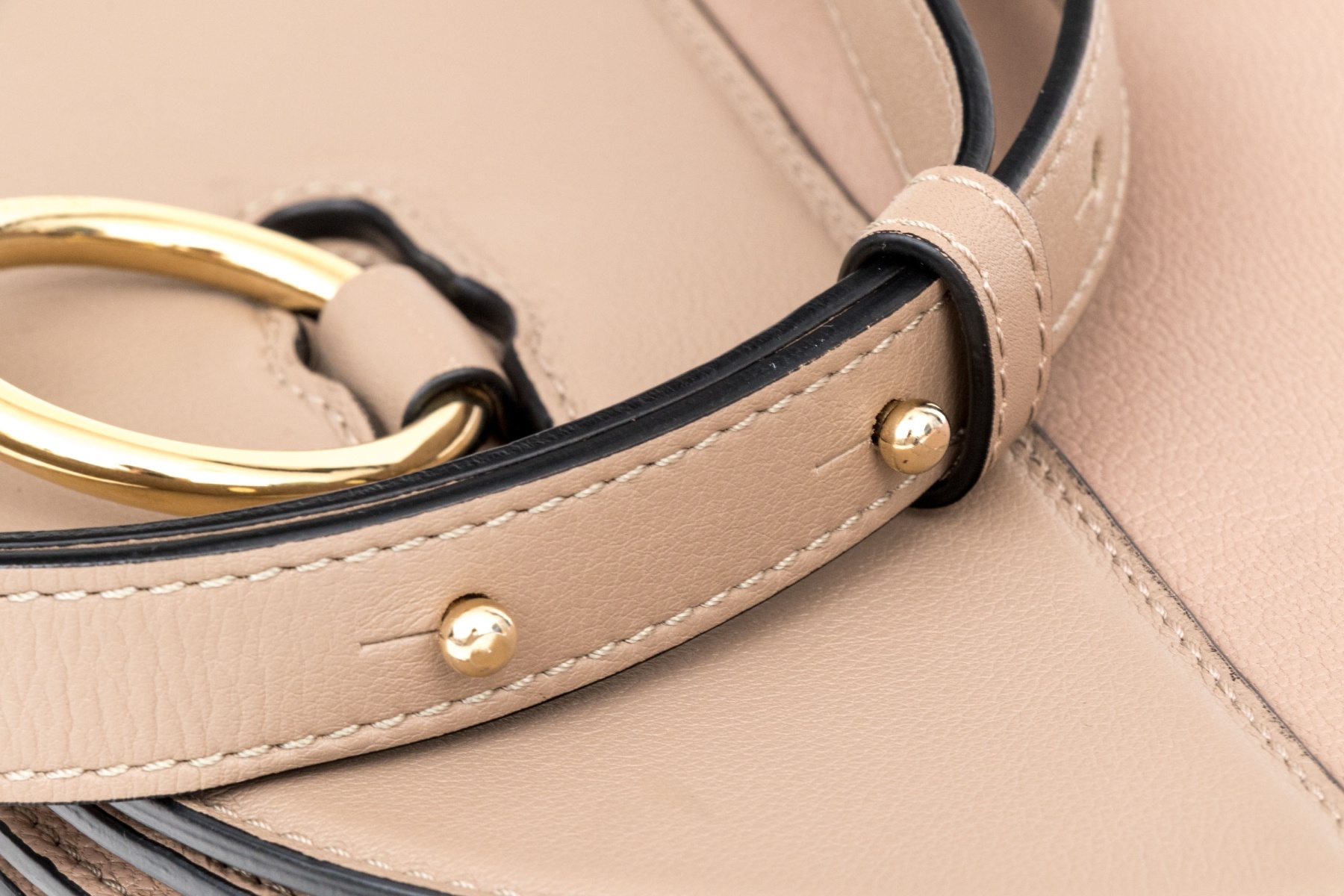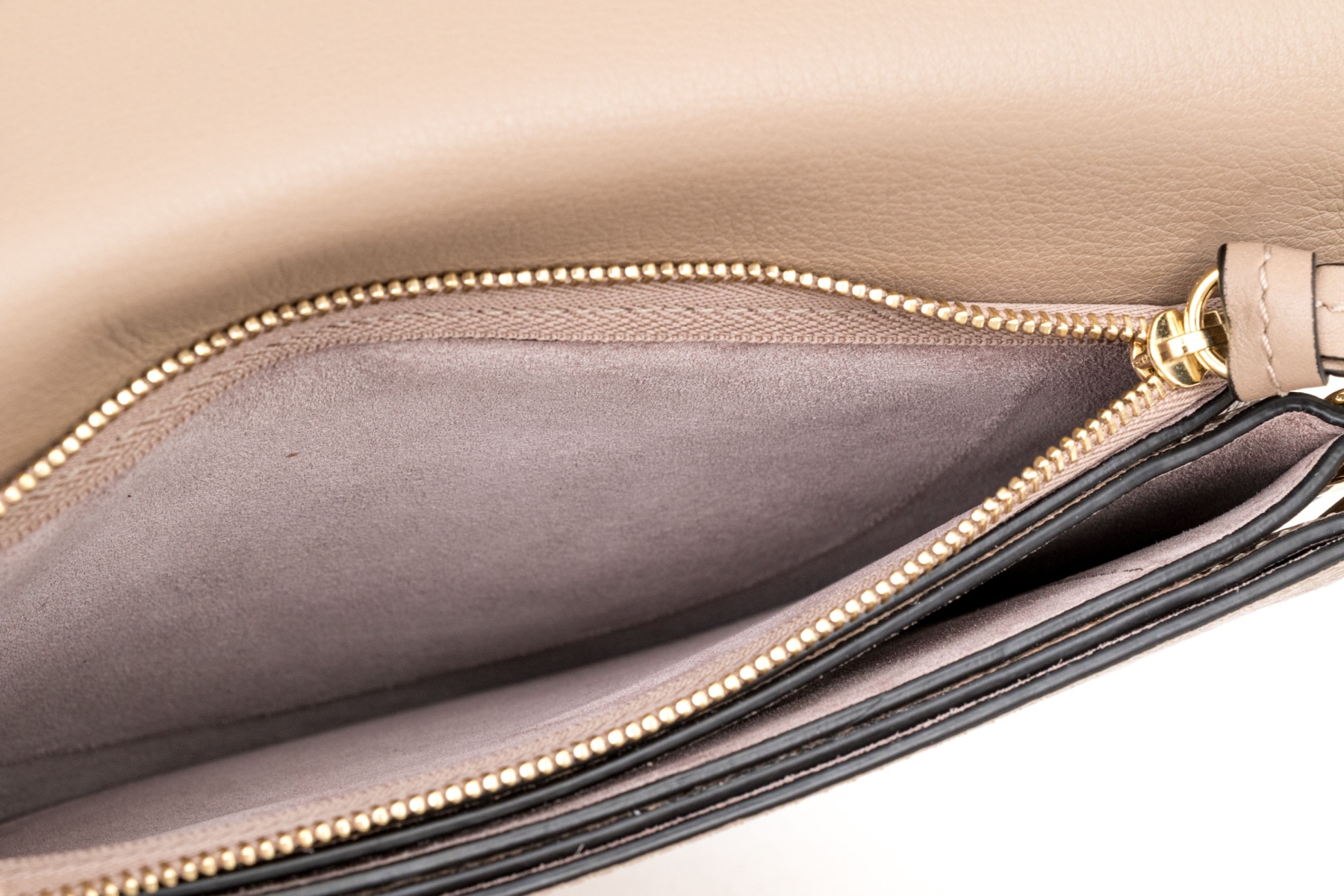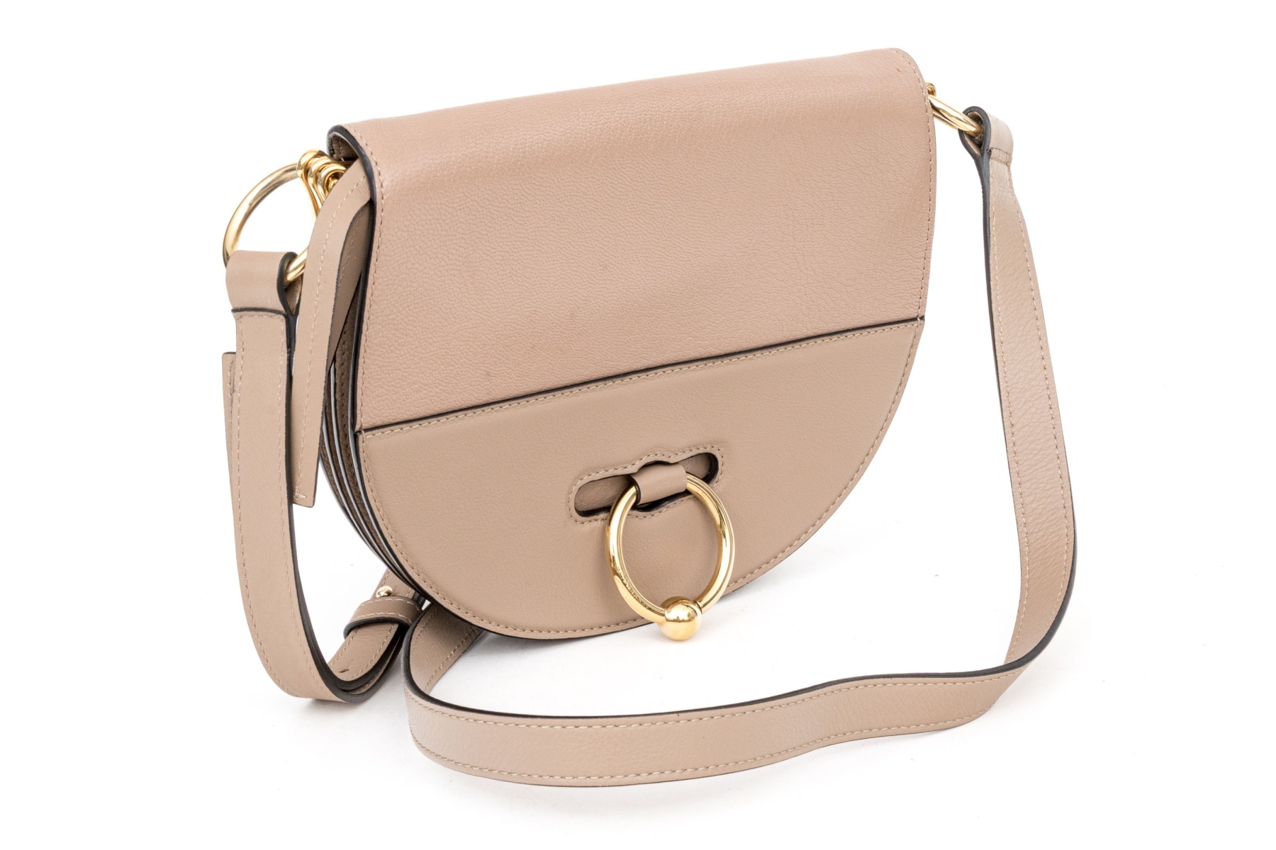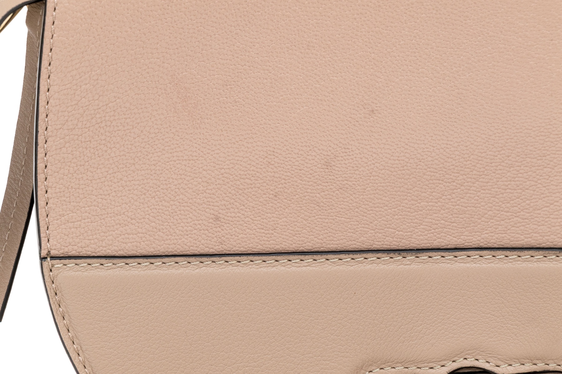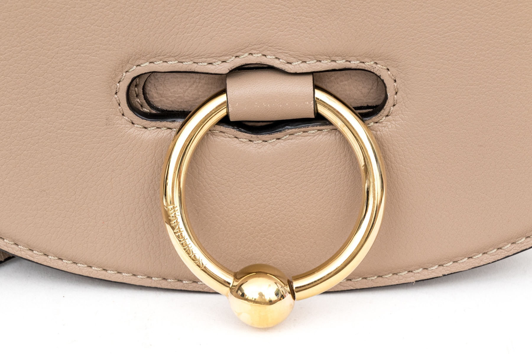 This beautifully crafted shoulder bag by J.W.Anderson was made in Spain, and features a tan leather flap front exterior, rounded bottom, and is finished with gold tone hardware and a doorknocker style closure and a tan suede interior.