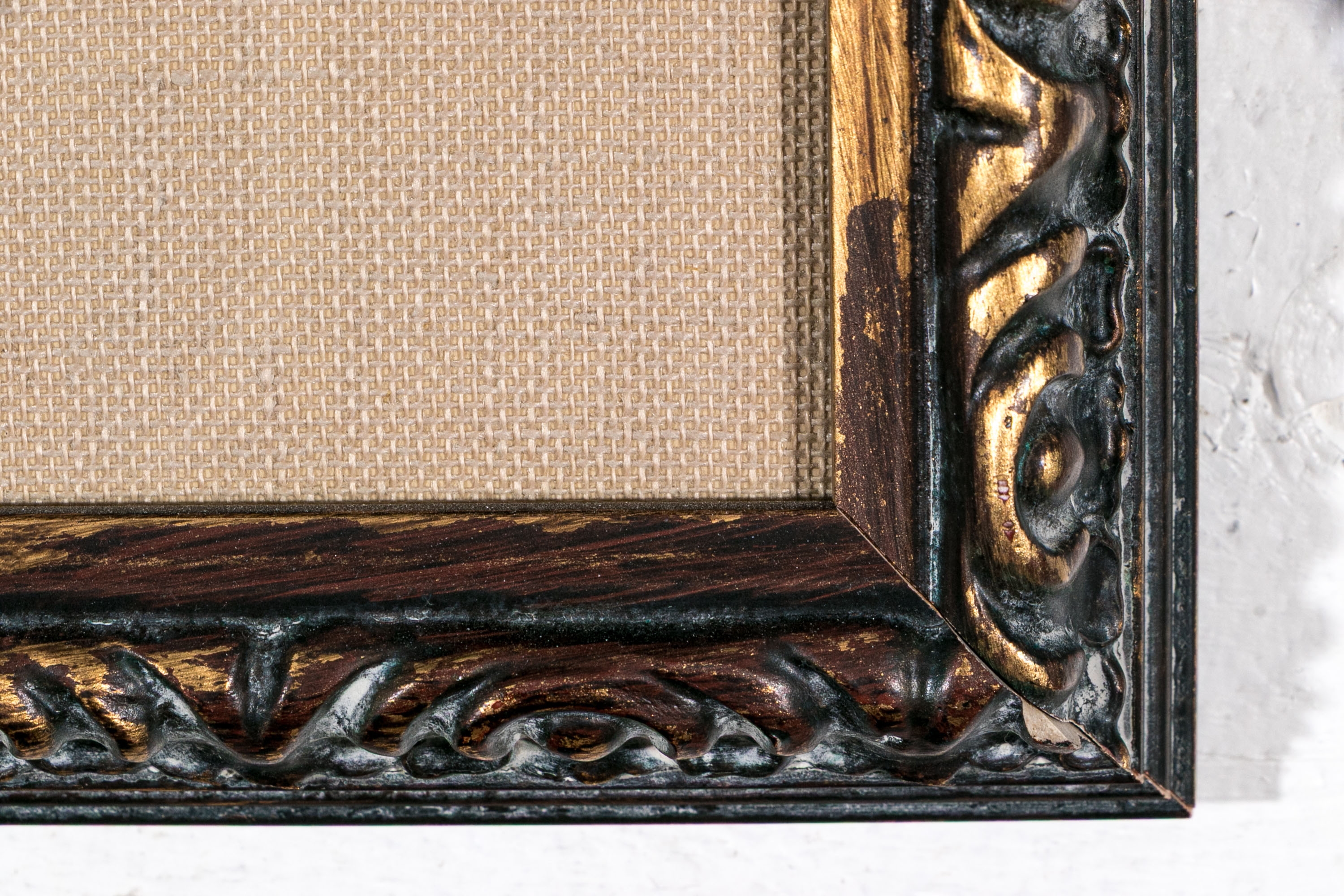 Presented matted in linen in a scrolled brown and gilt frame.