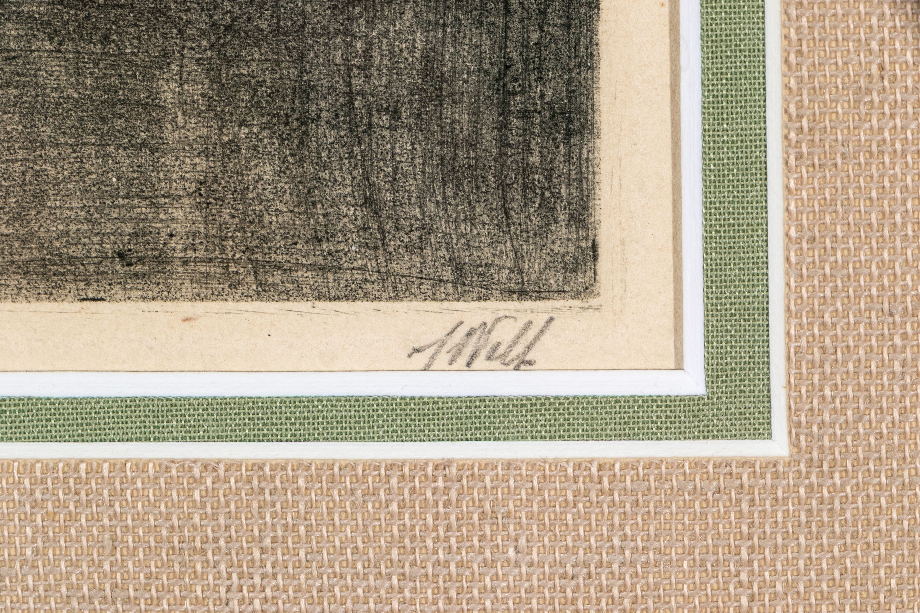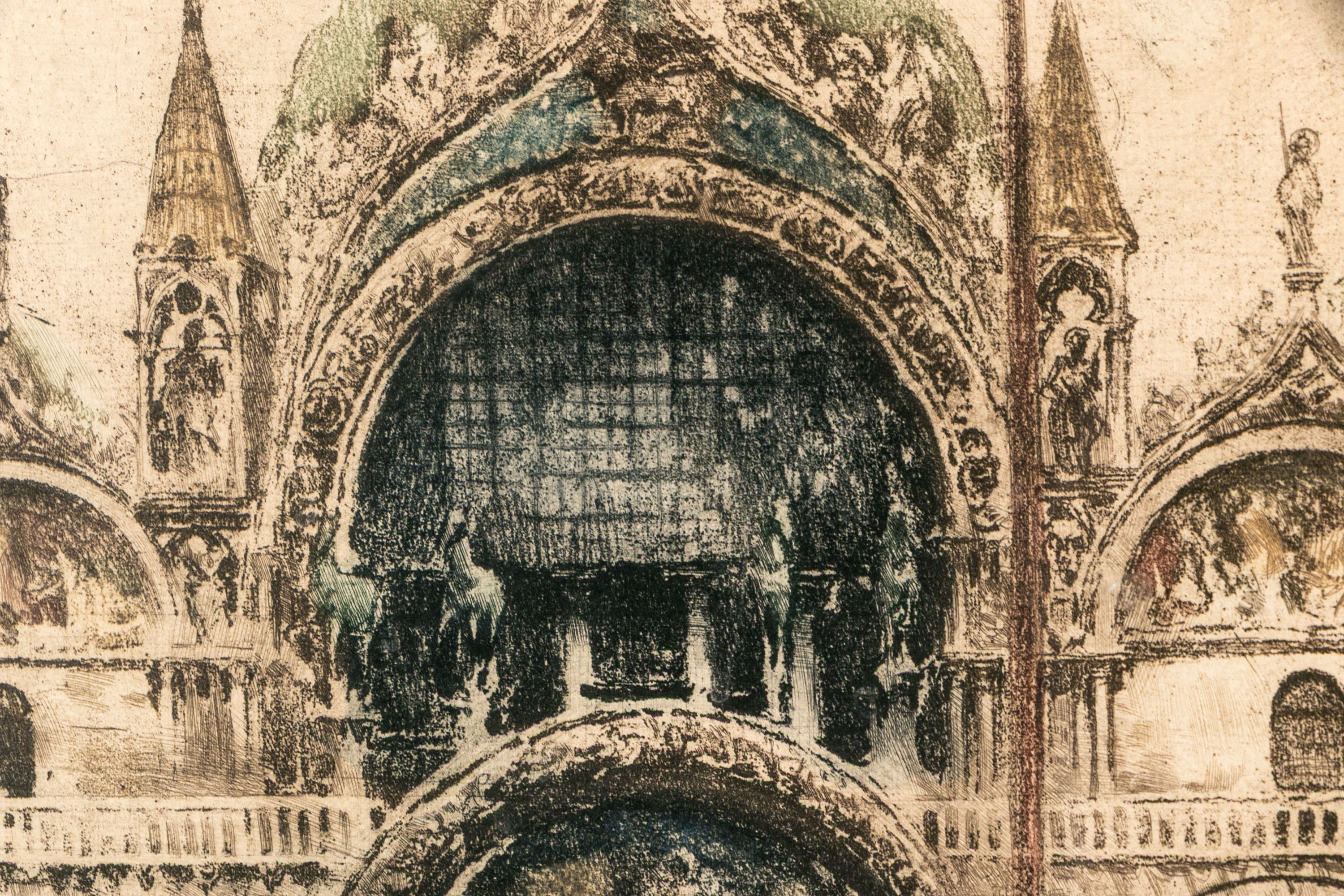 The etching is loose from the matting. There is a vertical mark at the upper left in the sky. Overall still presents very well.