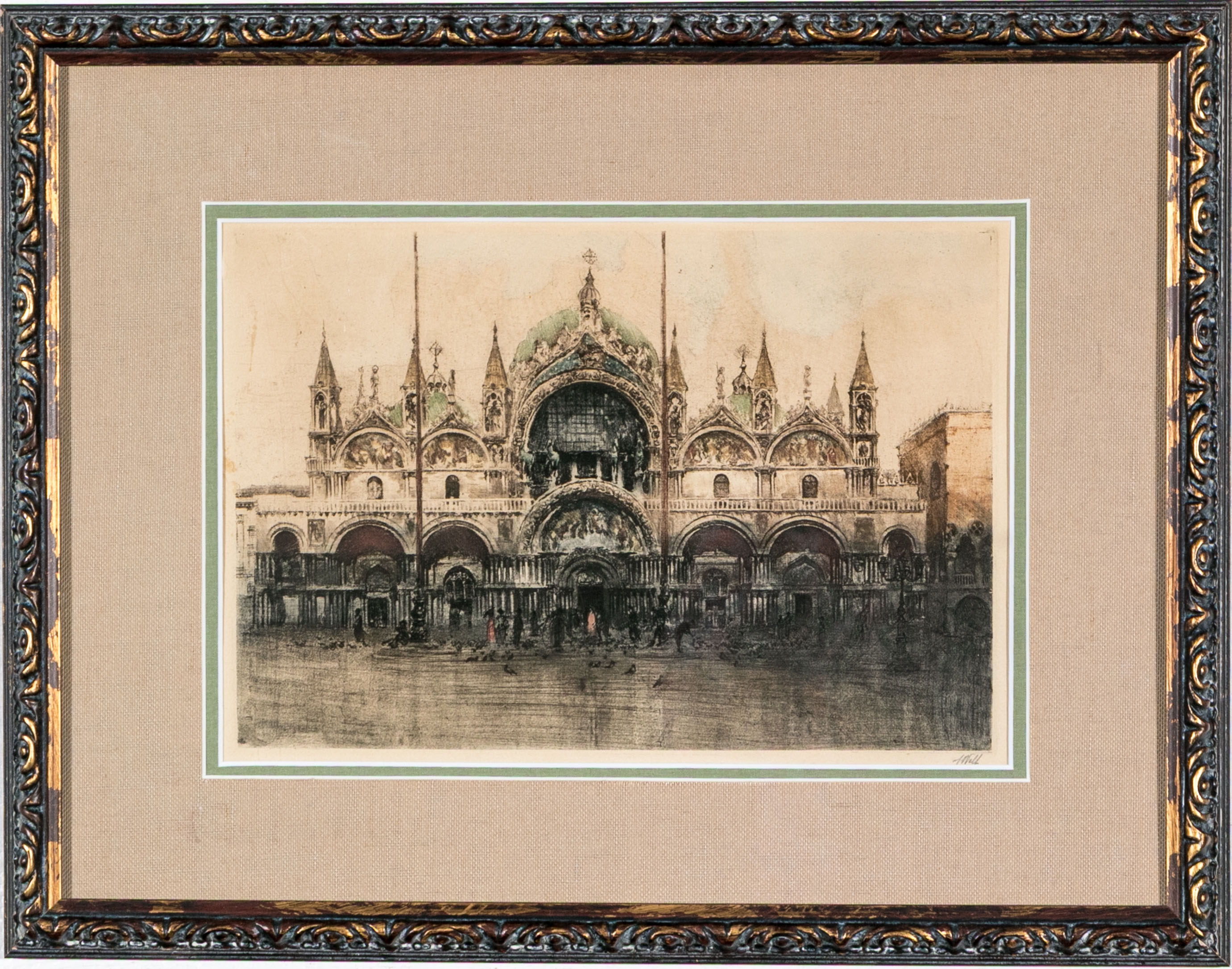 A view of the facade of the Basilica in brown with green roof details and dark gray shading. Two colored figures appear on the piazza among the pigeons. Pencil signed lower right.