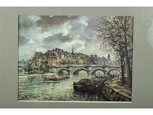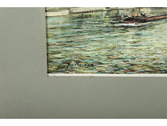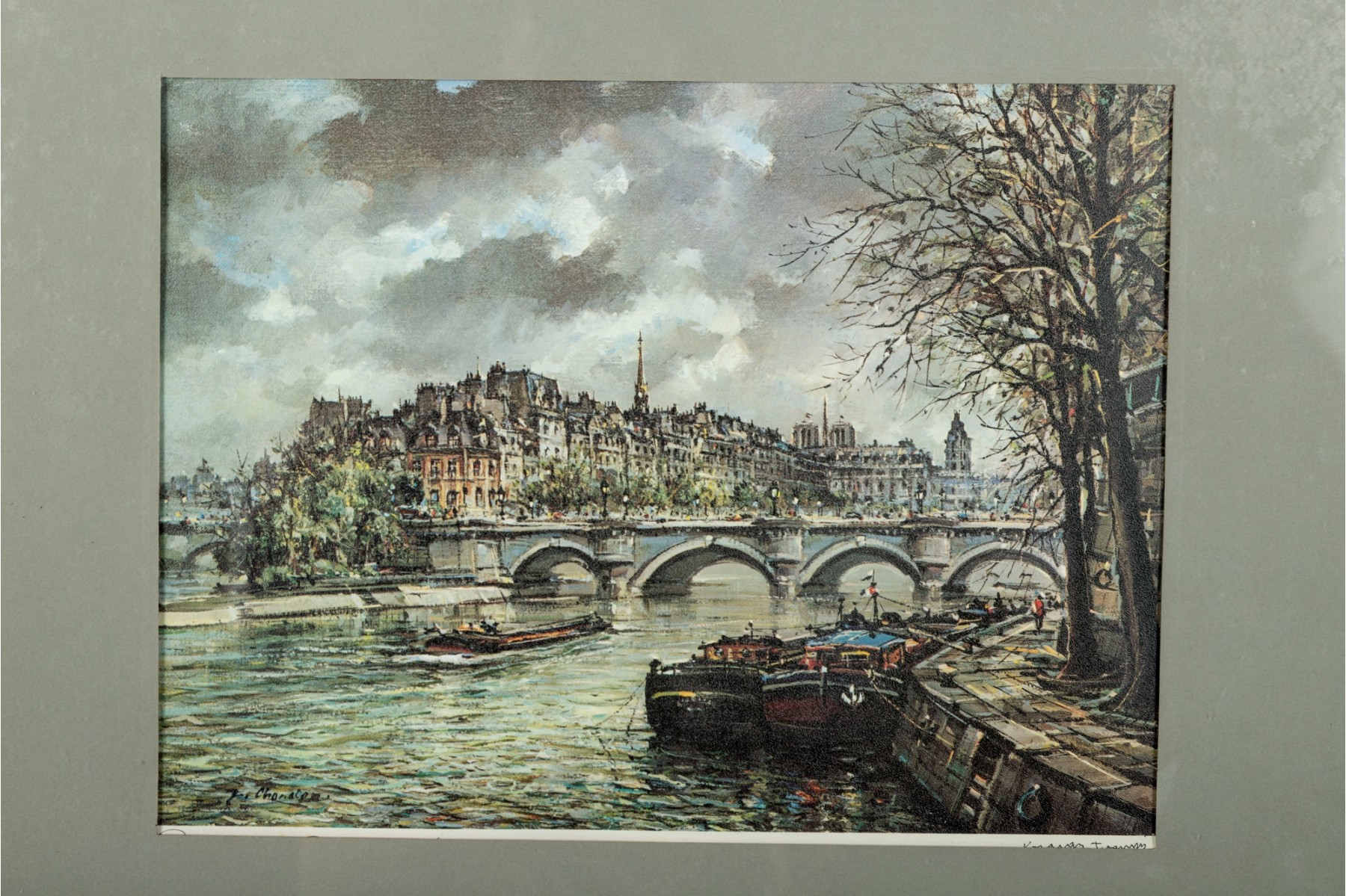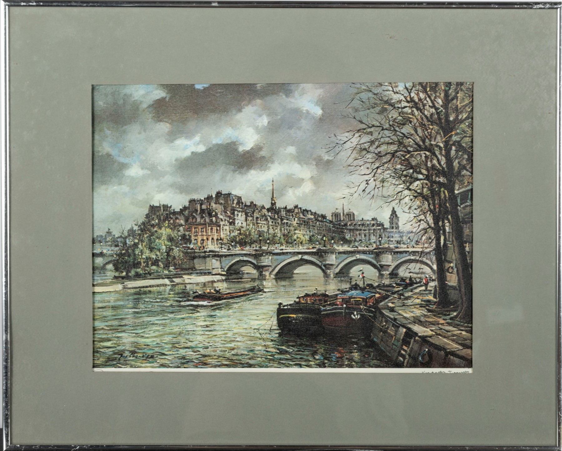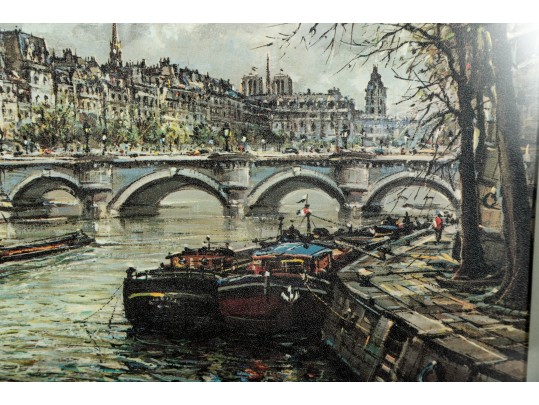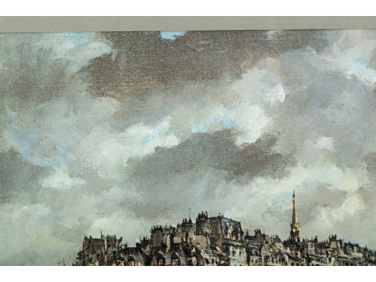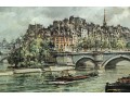 Jacques Chardon (Croatian-French, 1937-2014) "Ile Saint Louis" print depicting a waterside view of the titled island in rich detail and beautiful color on a stormy day. Boats are seen on green water, approaching an impressive bridge leading to the city. Plate signature seen lower left.