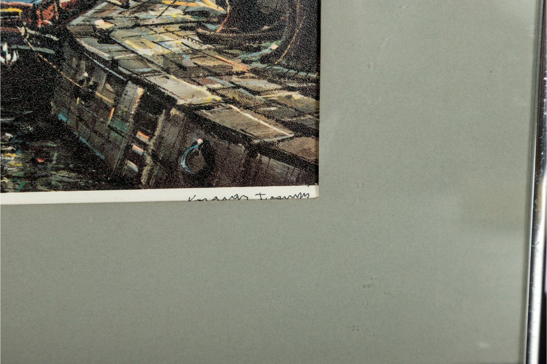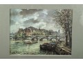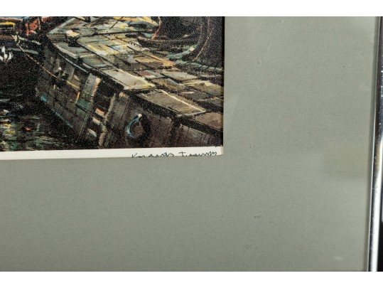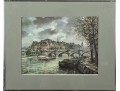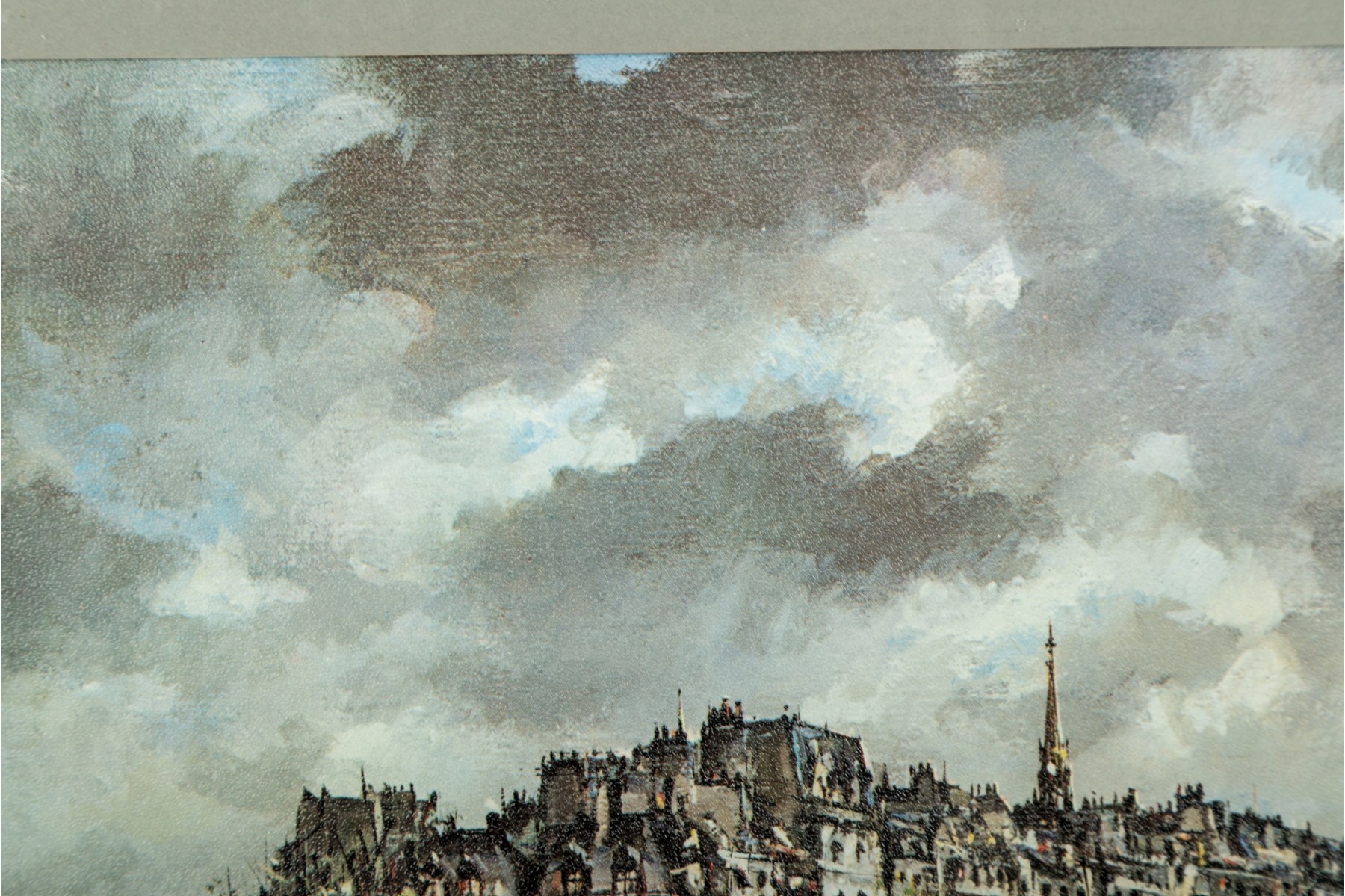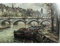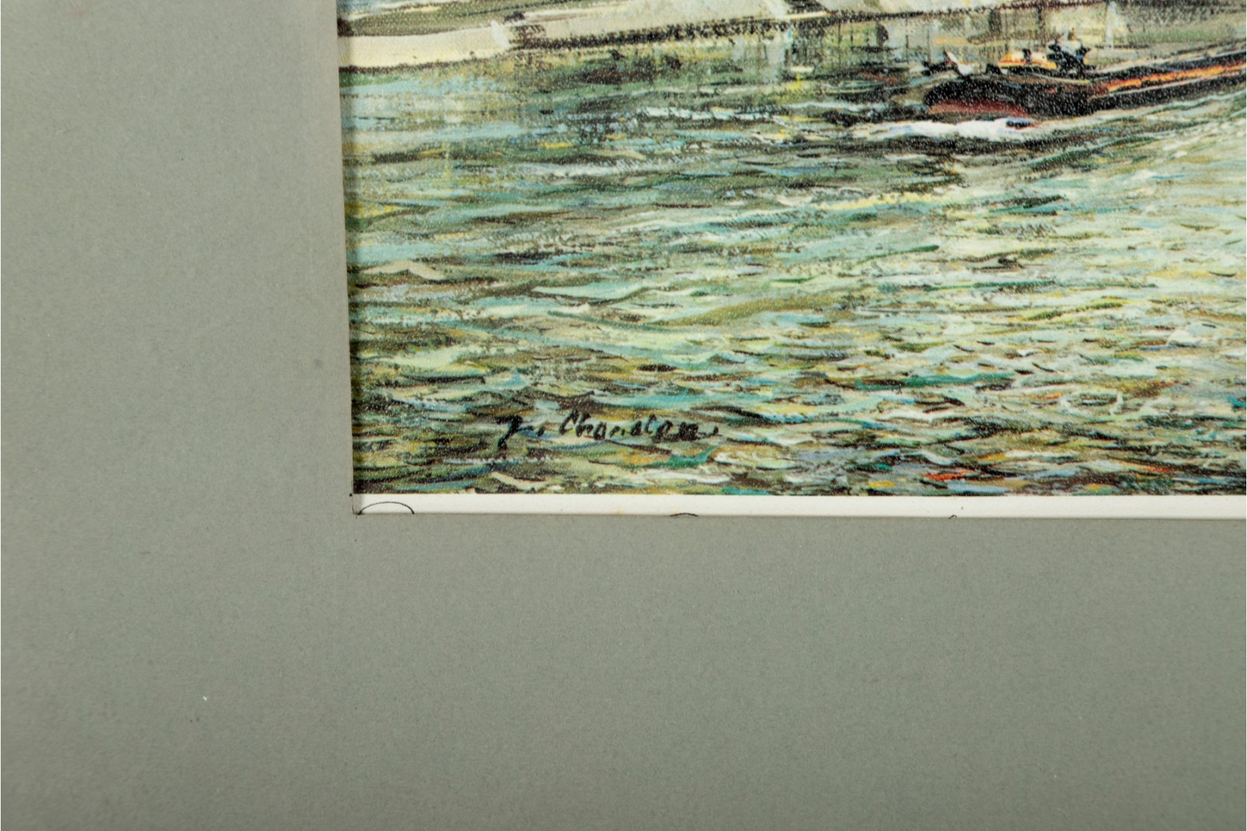 Jacques Chardon (Croatian-French, 1937-2014) "Ile Saint Louis" print depicting a waterside view of the titled island in rich detail and beautiful color on a stormy day. Boats are seen on green water, approaching an impressive bridge leading to the city. Plate signature seen lower left.