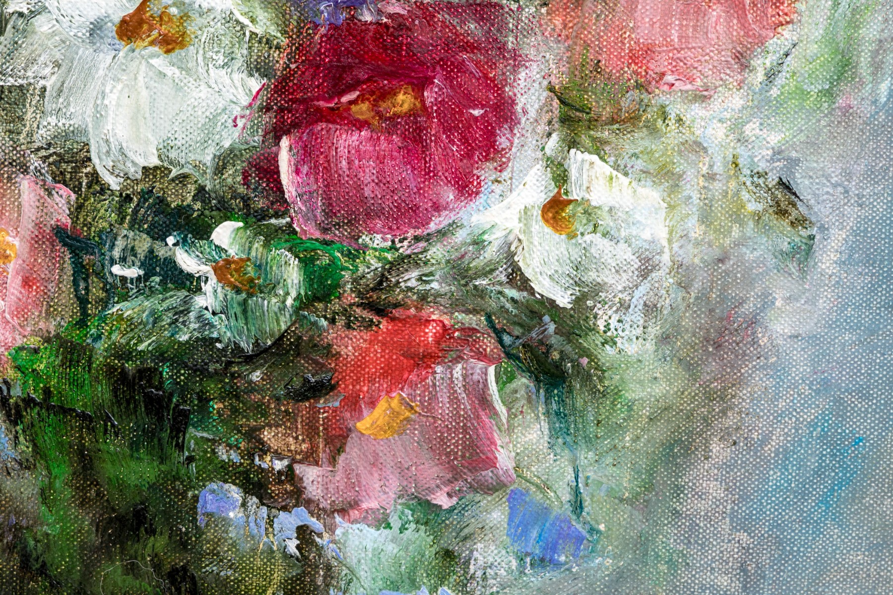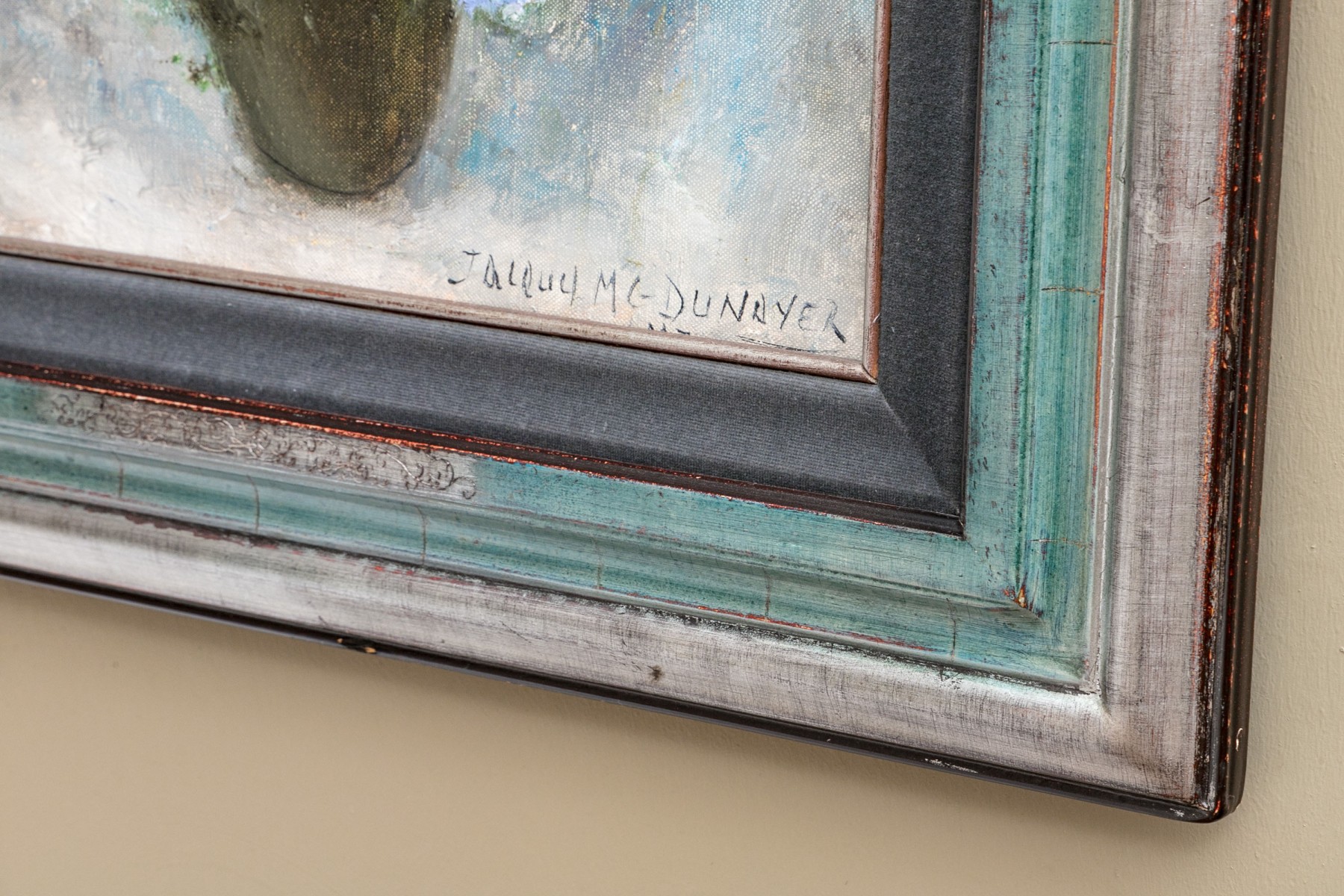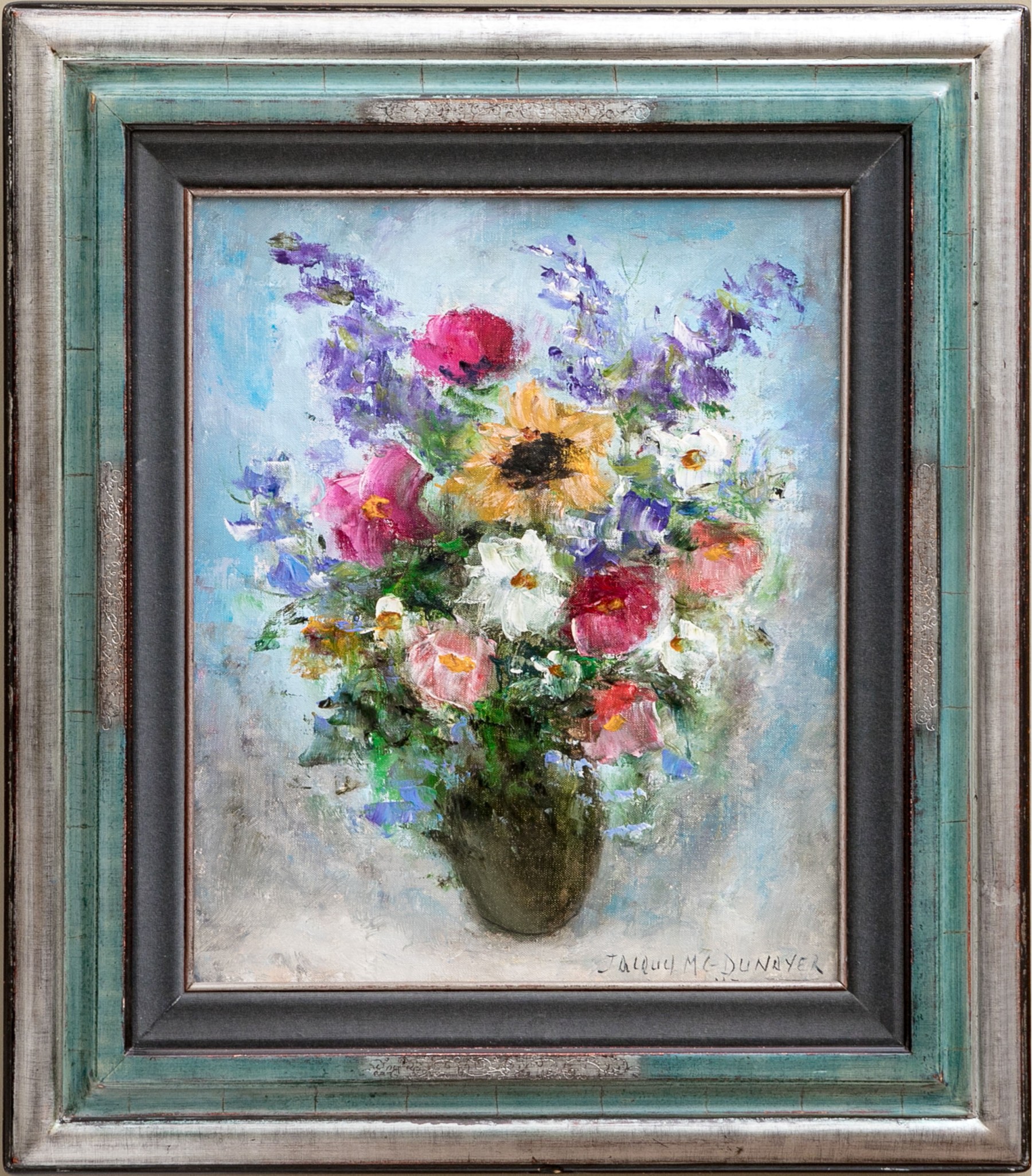 Enhance your collection with this exquisite floral still life oil painting by Jacques MG Dunnyer. Signed in the lower right, the artwork captures a vibrant and detailed portrayal of flowers, showcasing Dunnyer's refined technique and artistic vision.