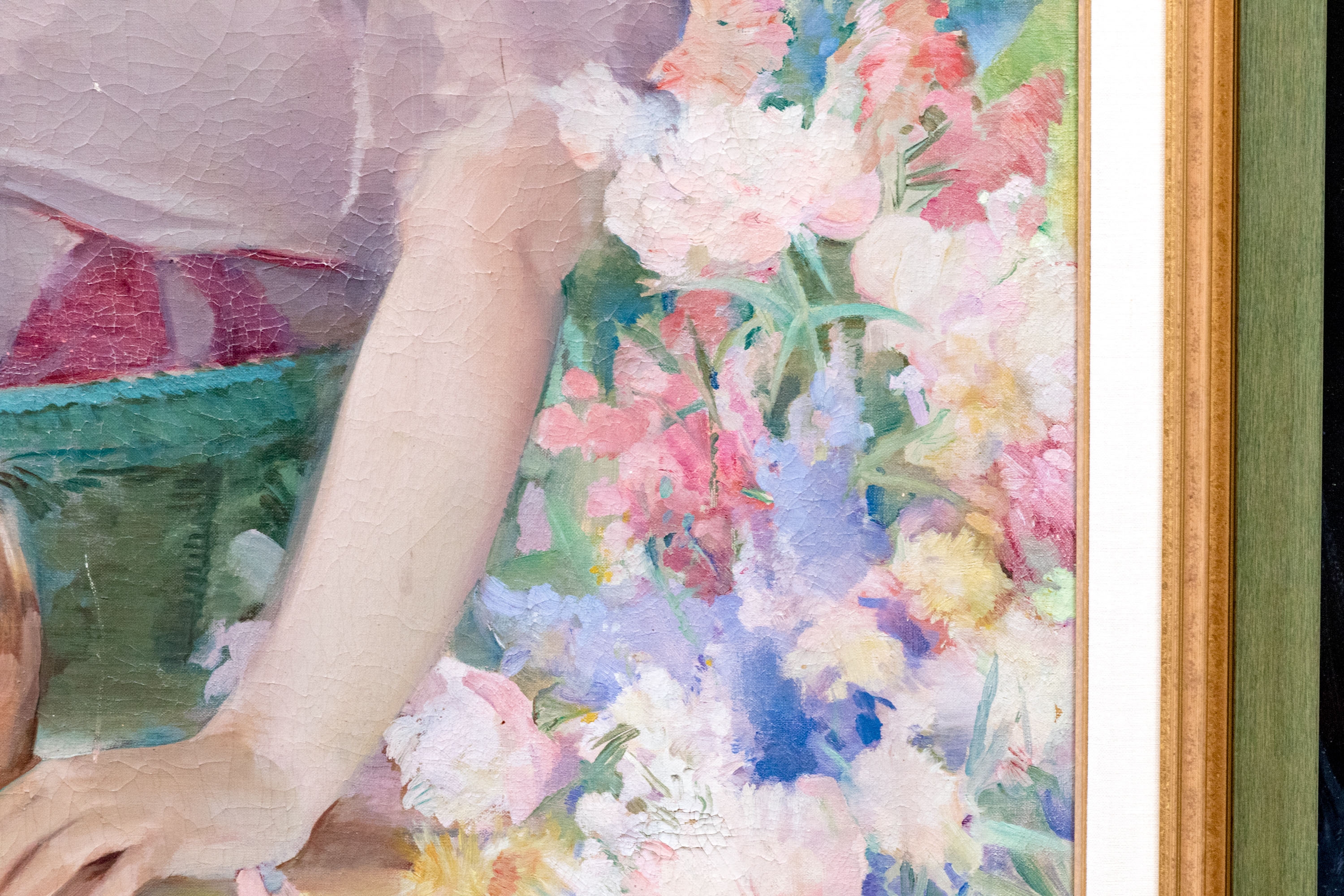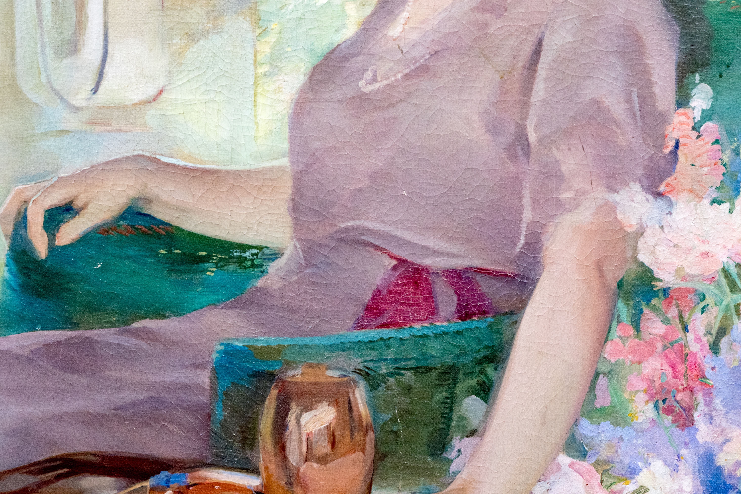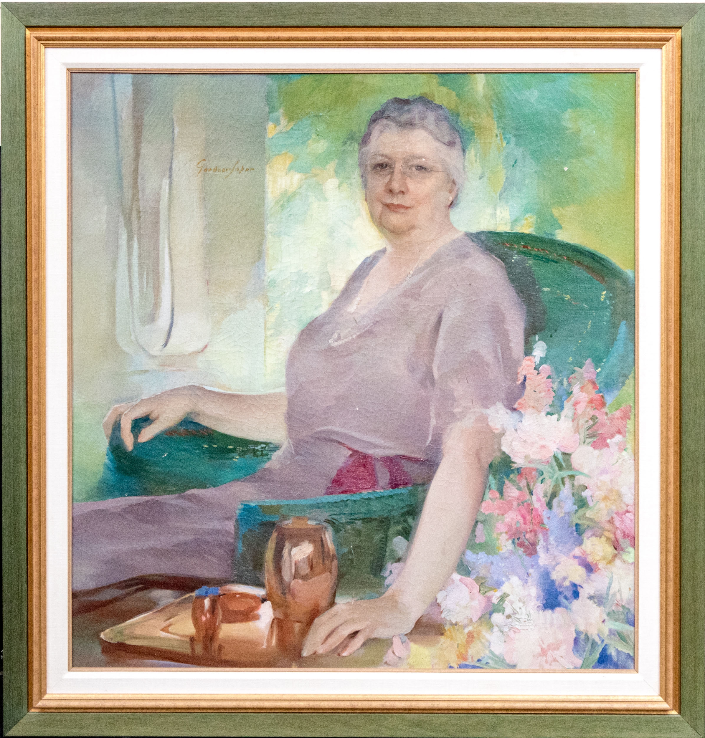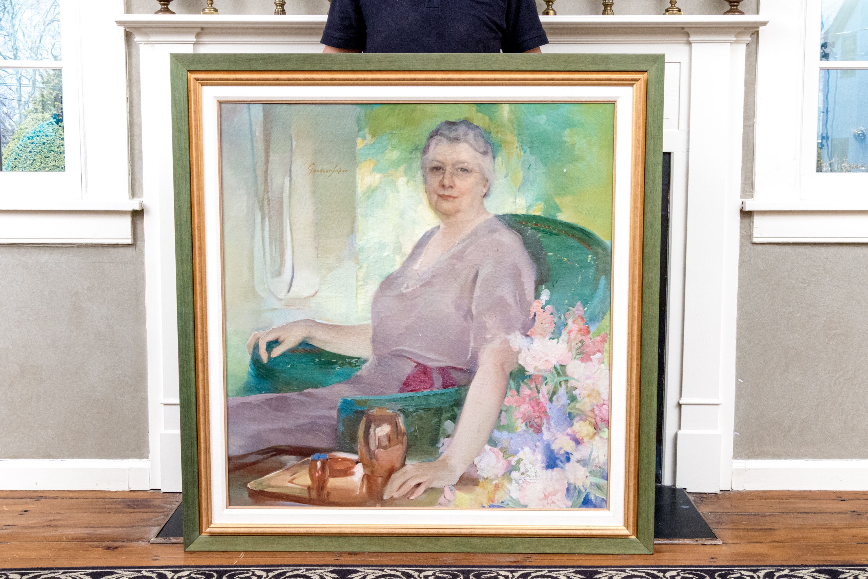 James Hamlin Gardner-Soper (American, 1877-1939) oil painting on canvas depicting a portrait of a woman with gray hair wearing a pale purple dress tied at the waist with a magenta sash, seated in a green chair with one hand resting on a tea tray with copper vessels next to a pretty pink and purple burst of flowers against a natural green and teal background. Signed upper left quadrant.
