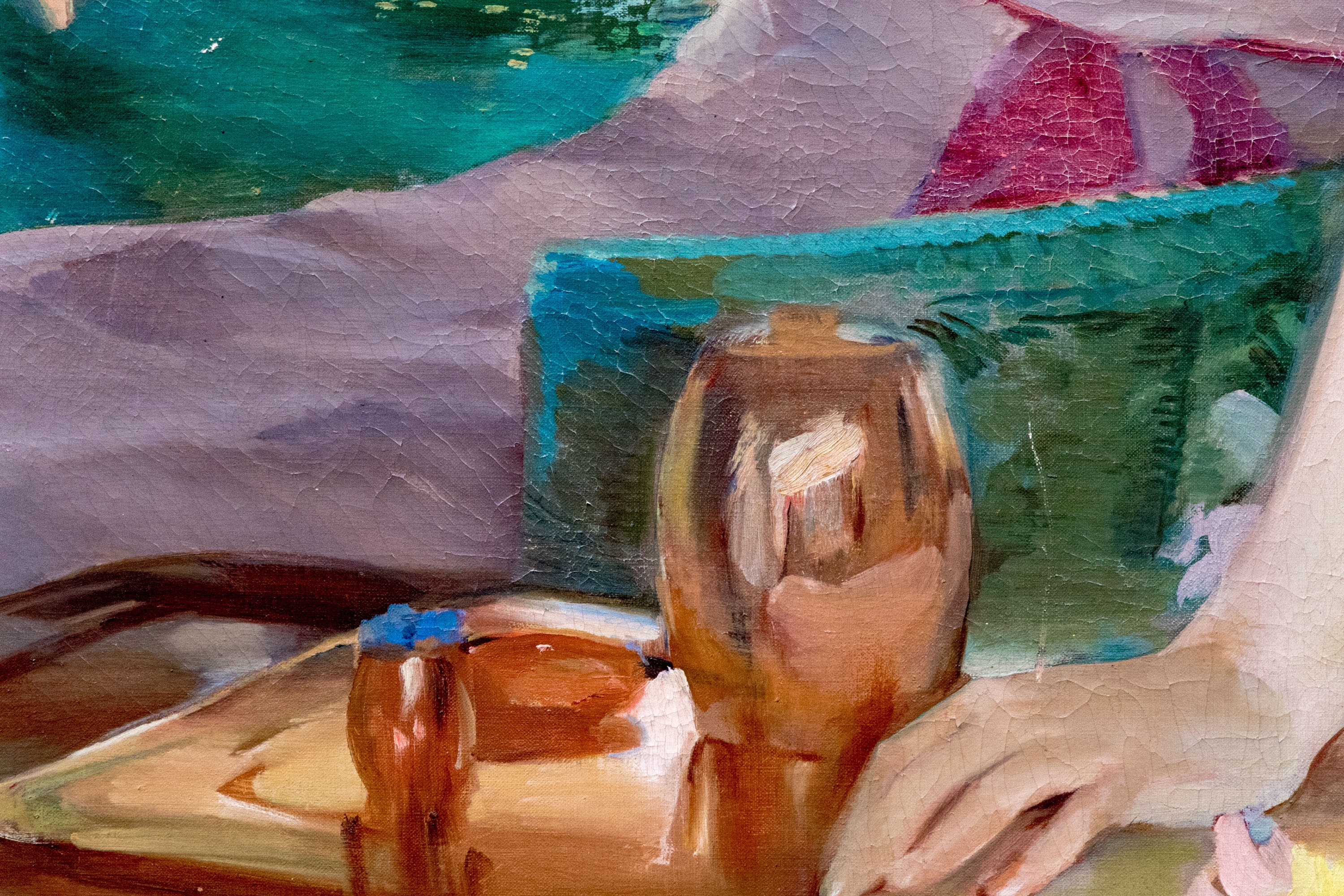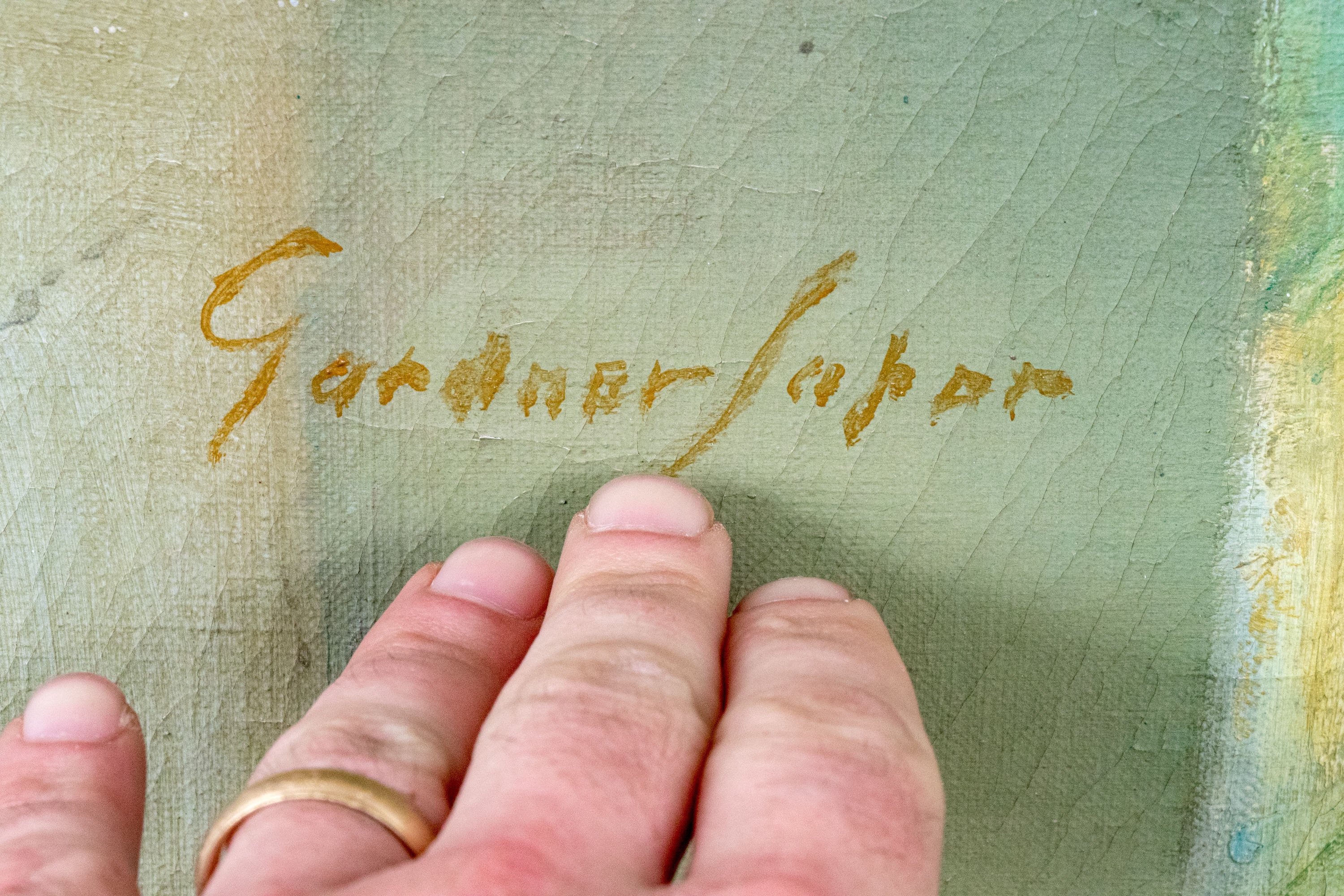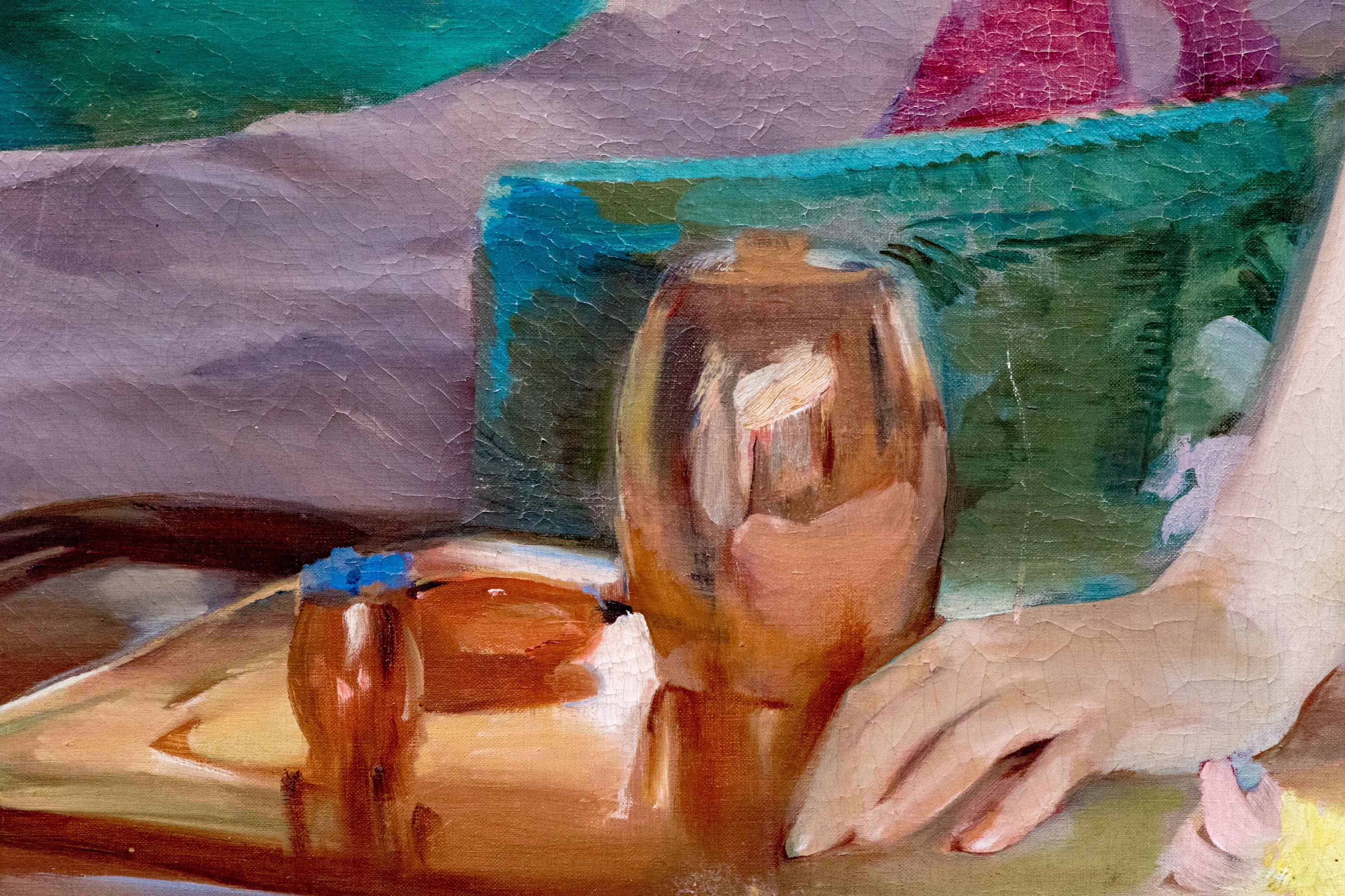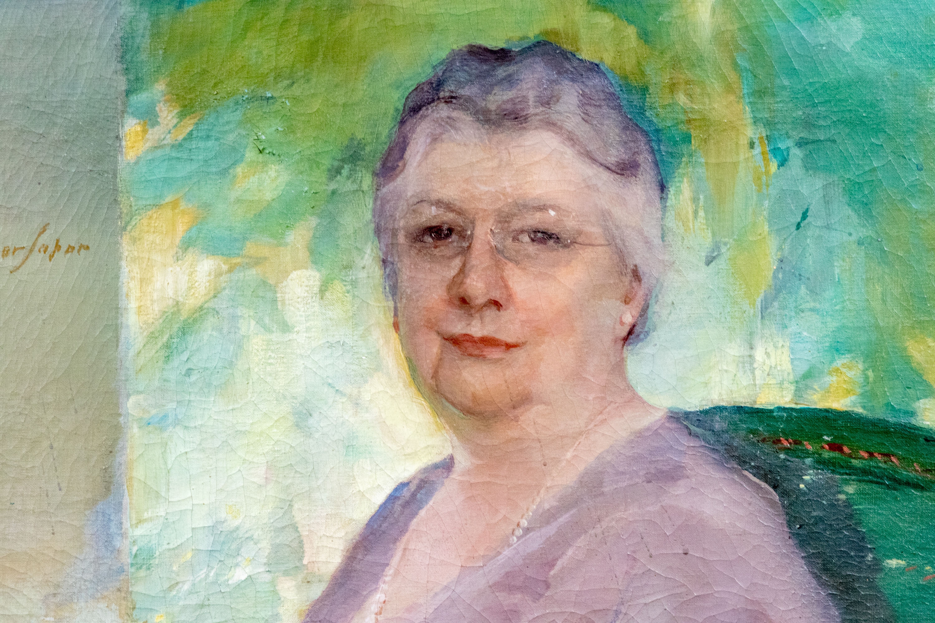 James Hamlin Gardner-Soper (American, 1877-1939) oil painting on canvas depicting a portrait of a woman with gray hair wearing a pale purple dress tied at the waist with a magenta sash, seated in a green chair with one hand resting on a tea tray with copper vessels next to a pretty pink and purple burst of flowers against a natural green and teal background. Signed upper left quadrant.