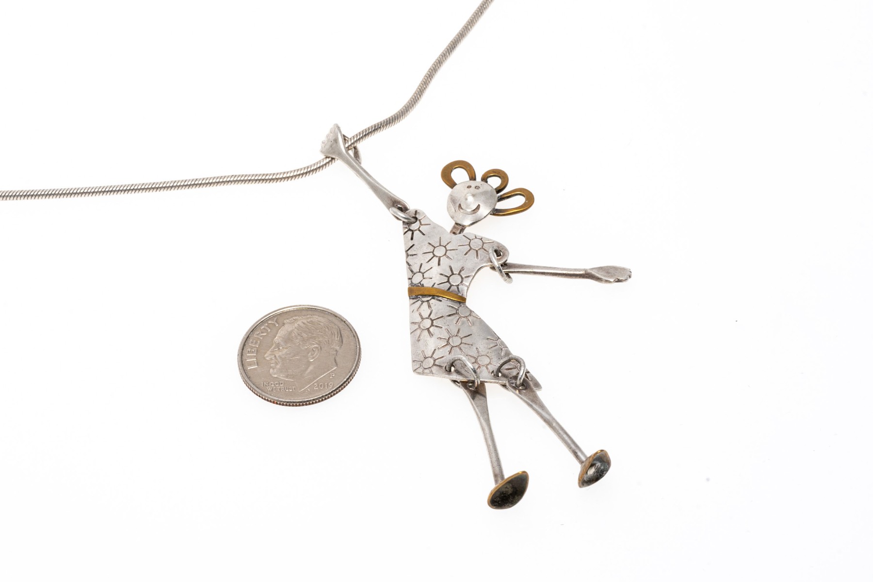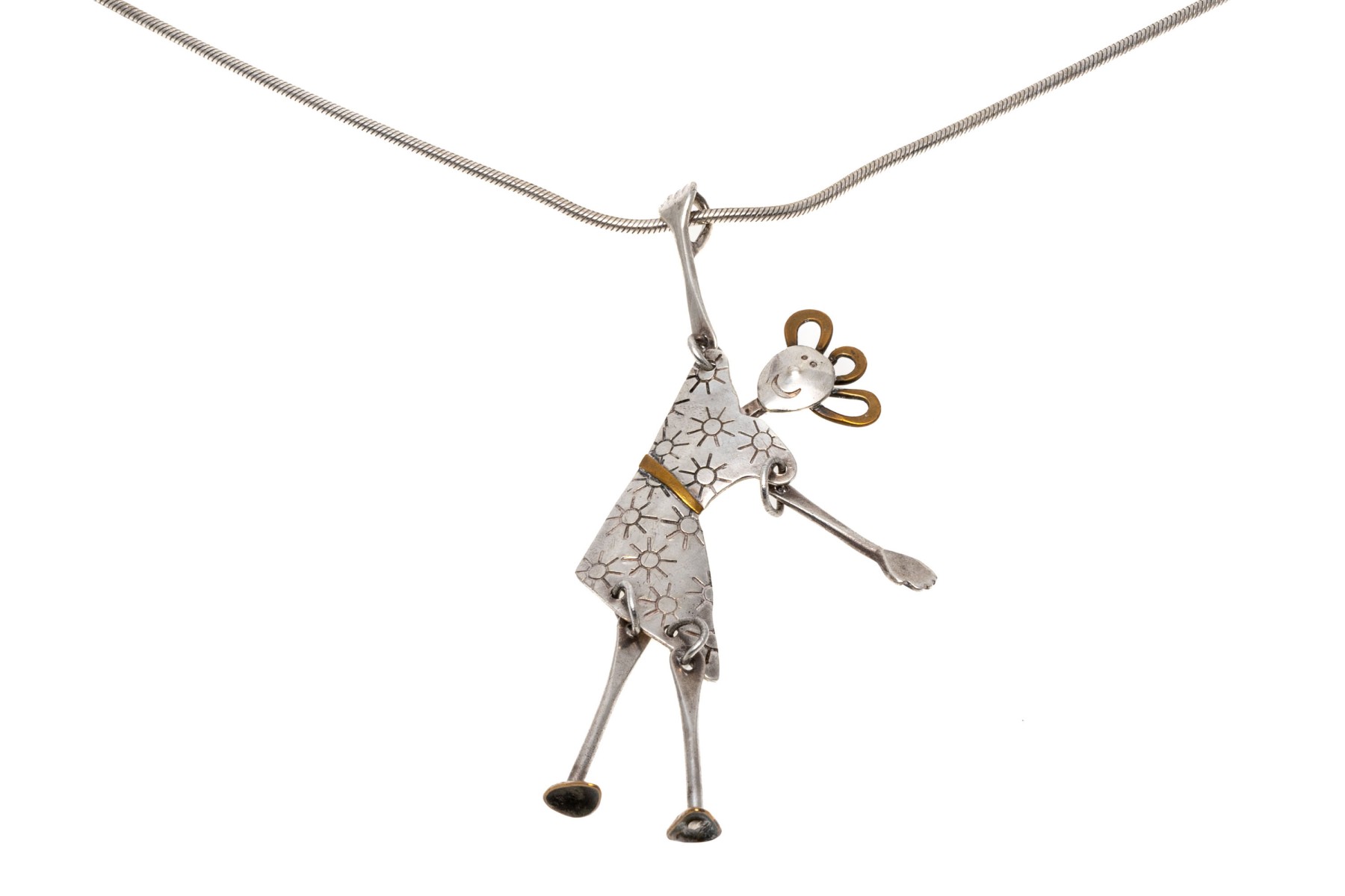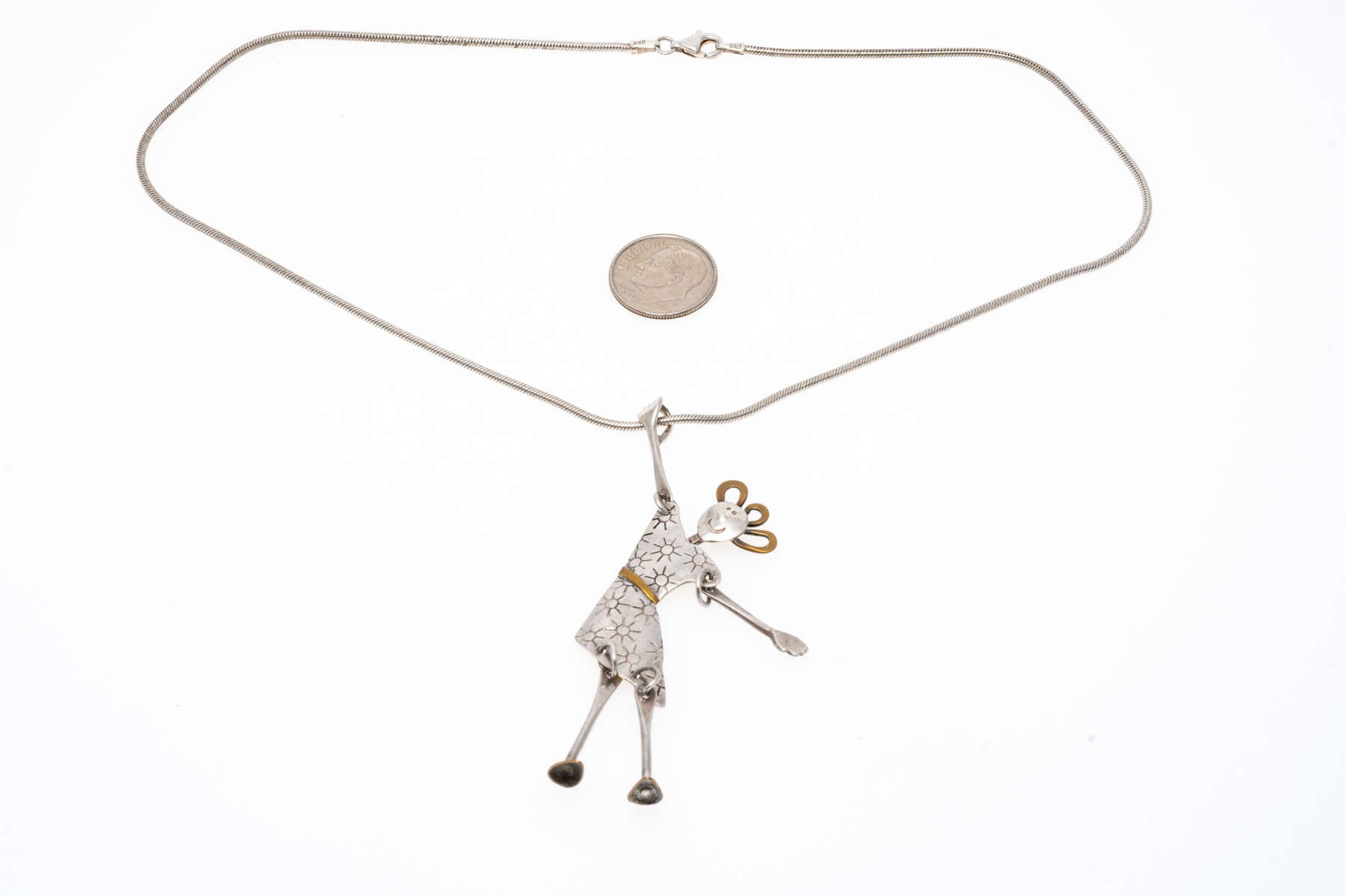 James Letourneau (American [IL], b. 1970) handmade pendant necklace displaying a woman in a flower-motif dress with gilt accents, hanging from a round snake chain.